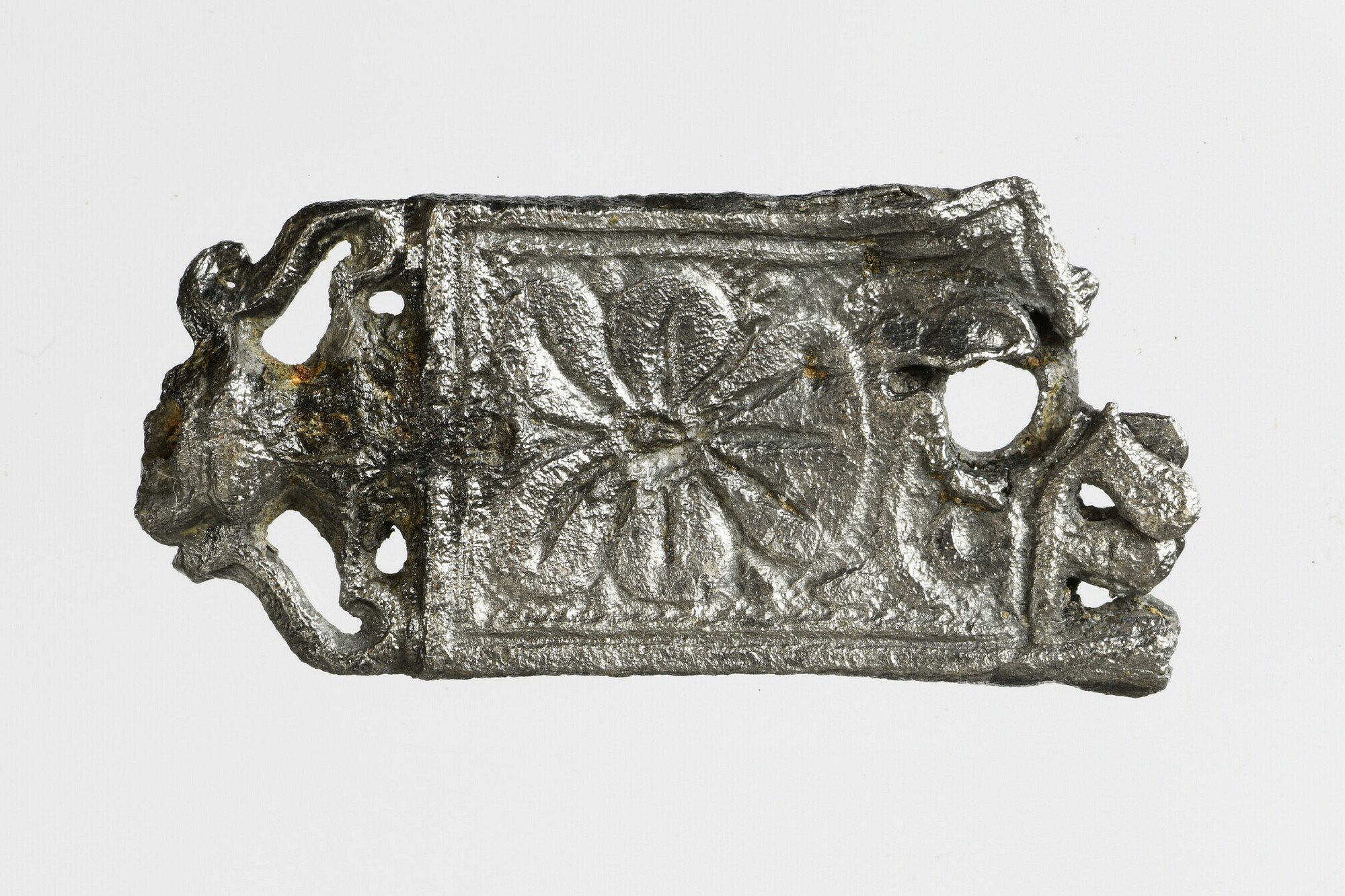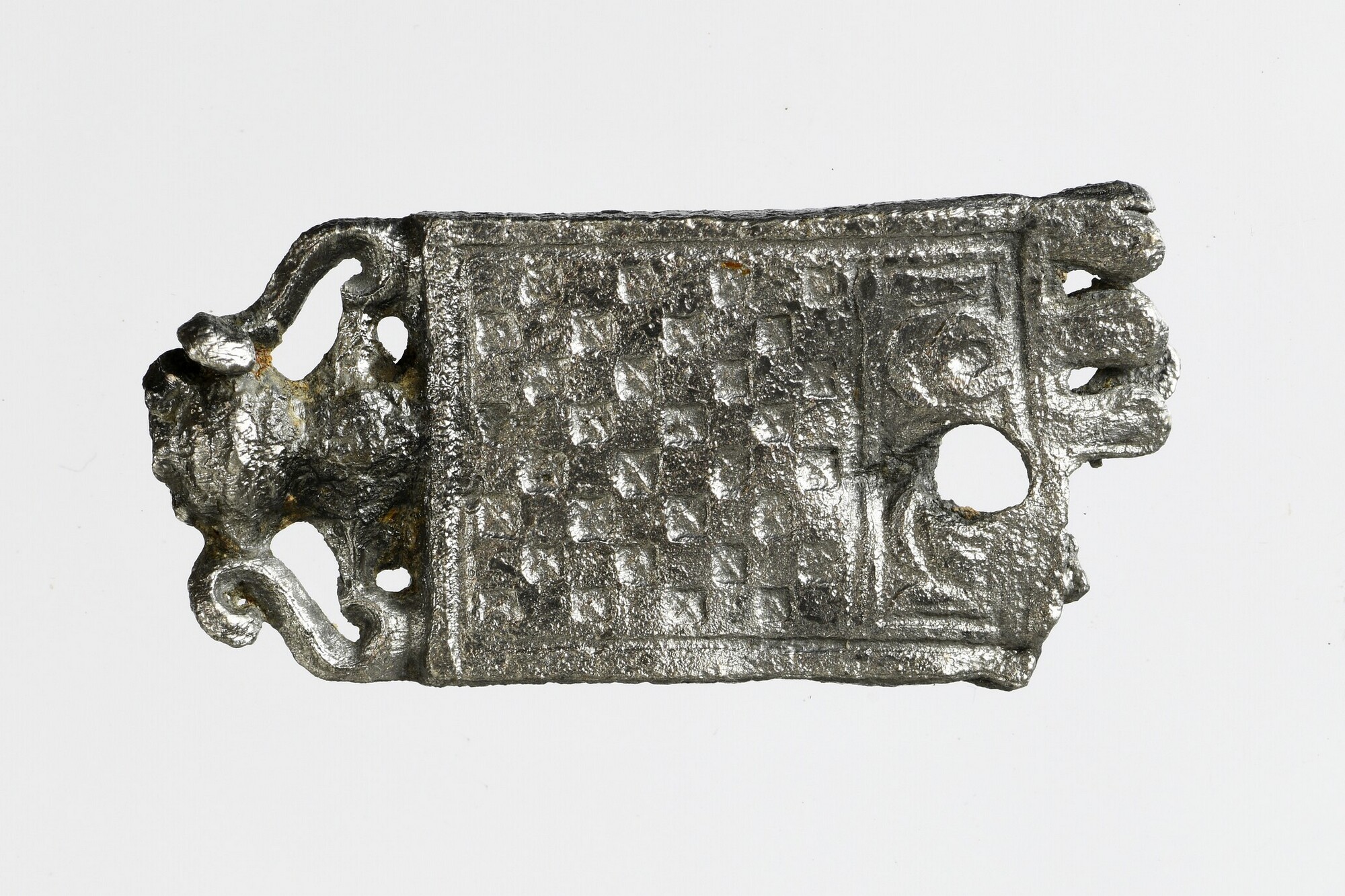 Riemtong; vz.: versierd met schaakbord; kz.: versierd met bloem; uiteinde voorzien van inkepingen
