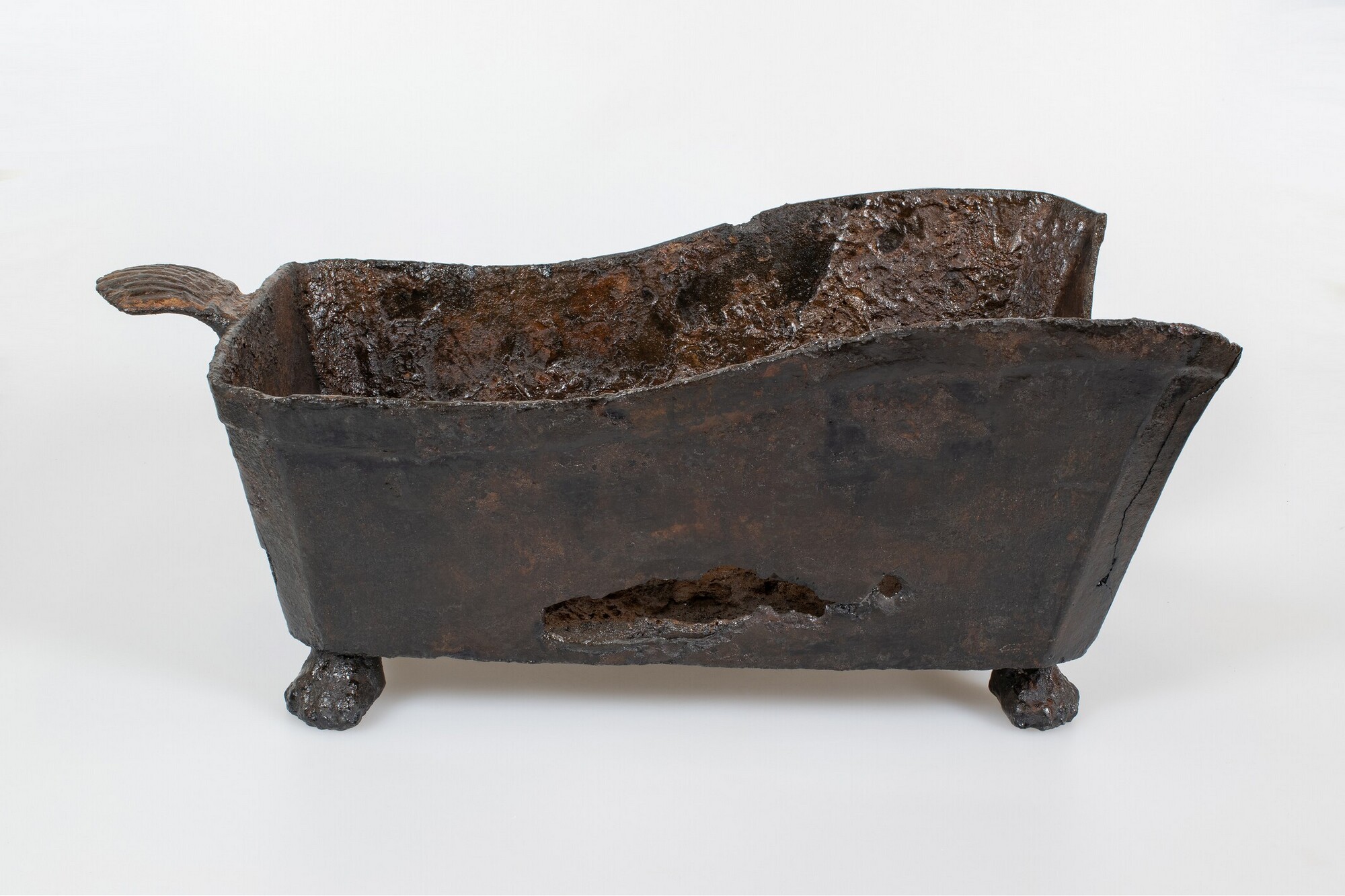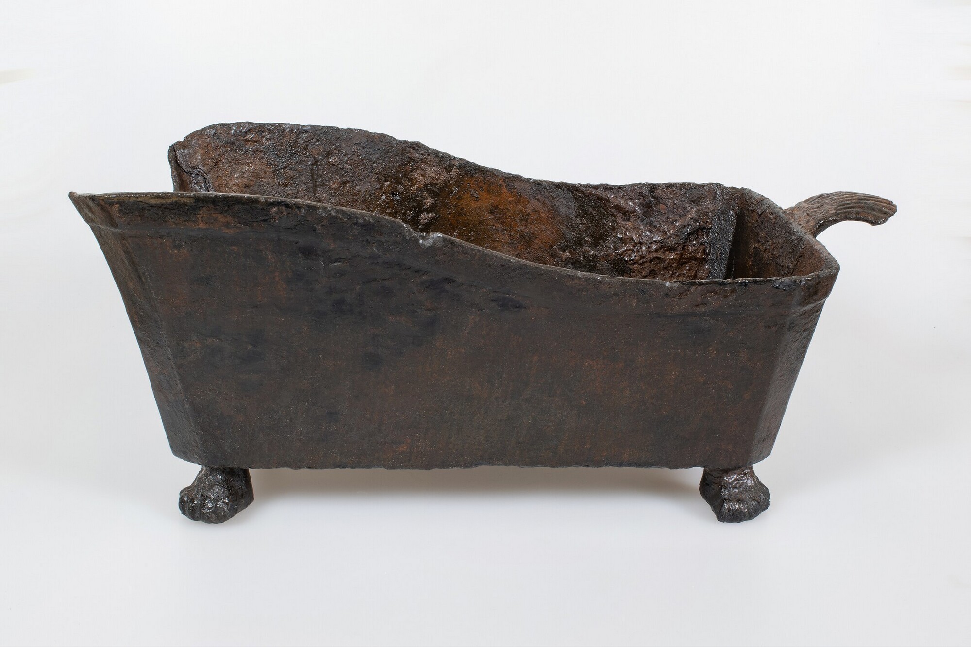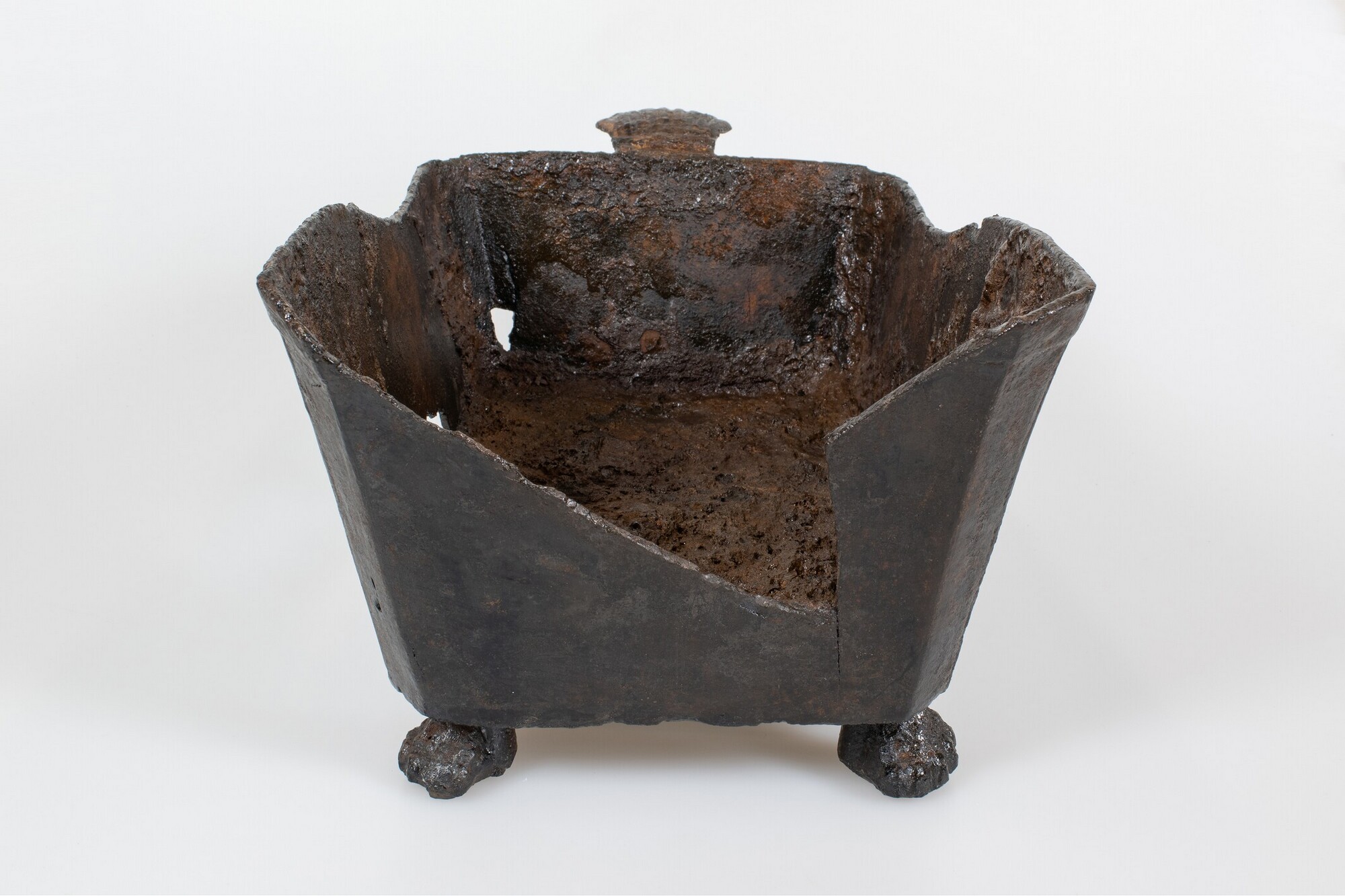 Kolenbak, tturfbak; gietijzer; rechthoekige open bak met schelpvormige handgreep en vier leeuwenpootjes; afgeschuinde hoeken