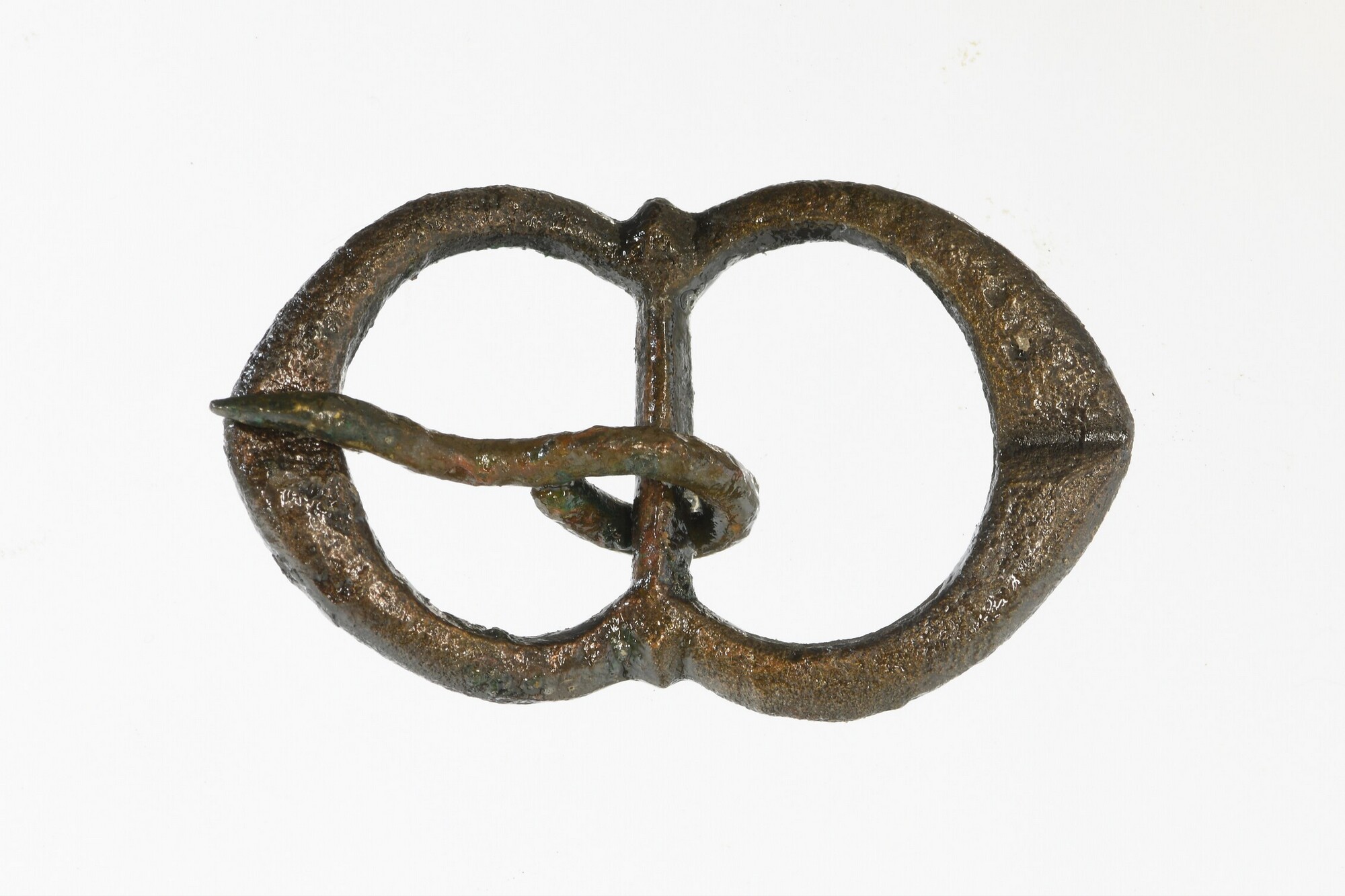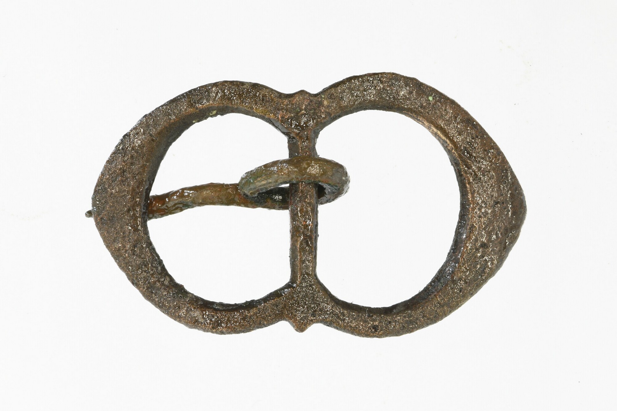 Gesp; dubbelovaal met middenstijl; angel; inkepingen aan beide zijden ter hoogte van de angel