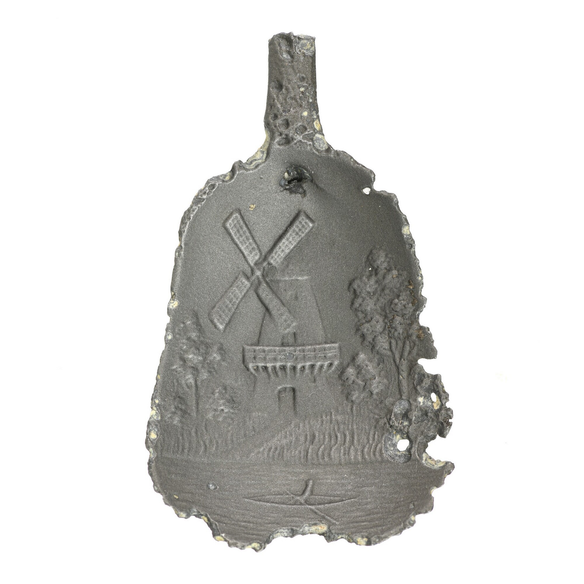 Lepel; suikerschep; bak met afbeelding in reliëf van een molen met bomen en een bootje