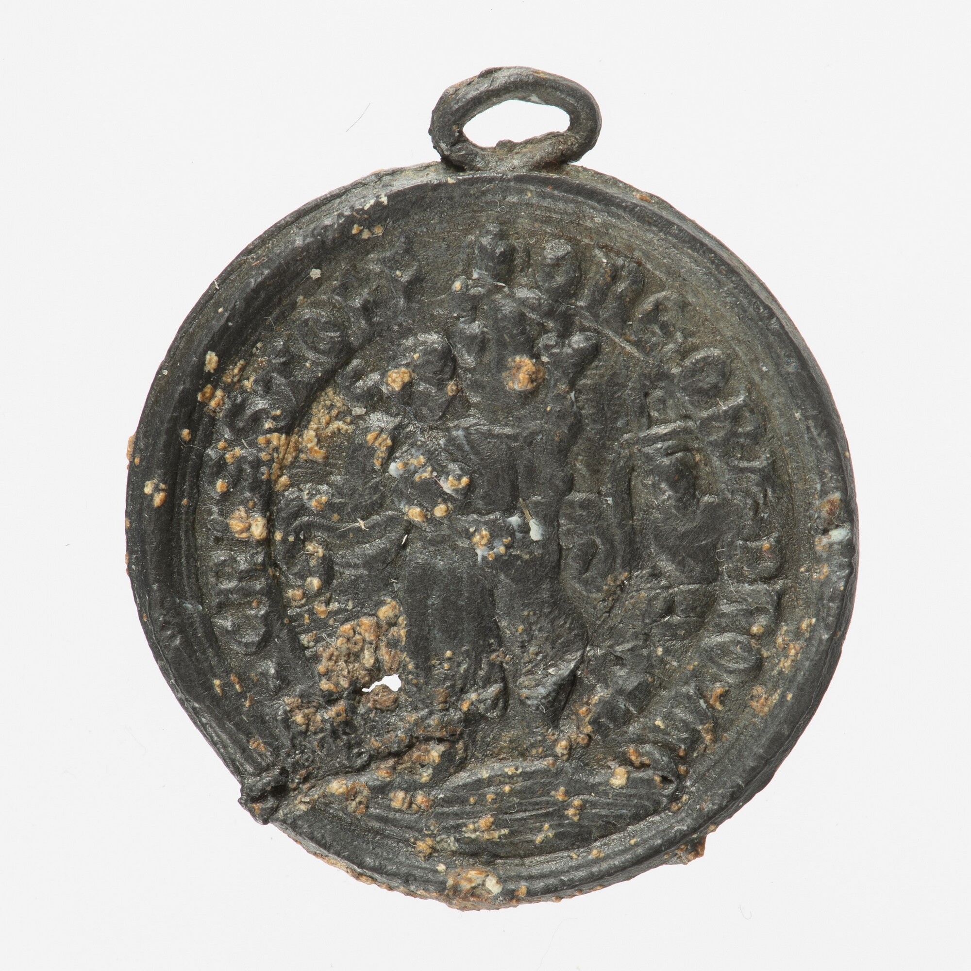 Pelgrimsinsigne, Maria op de Keins; vz : beeld van Maria met Kind met daarnaast een knielend biddend figuur, aan weerszijden van Maria de tekst: ‘op die Keinse’, randtekst: O Mater Dei memento mei ('O Moeder Gods, gedenk mij'); kz : afbeelding van St Christophorus met randtekst: S Cristoffore ora pro me ('St Christophorus bid voor ...