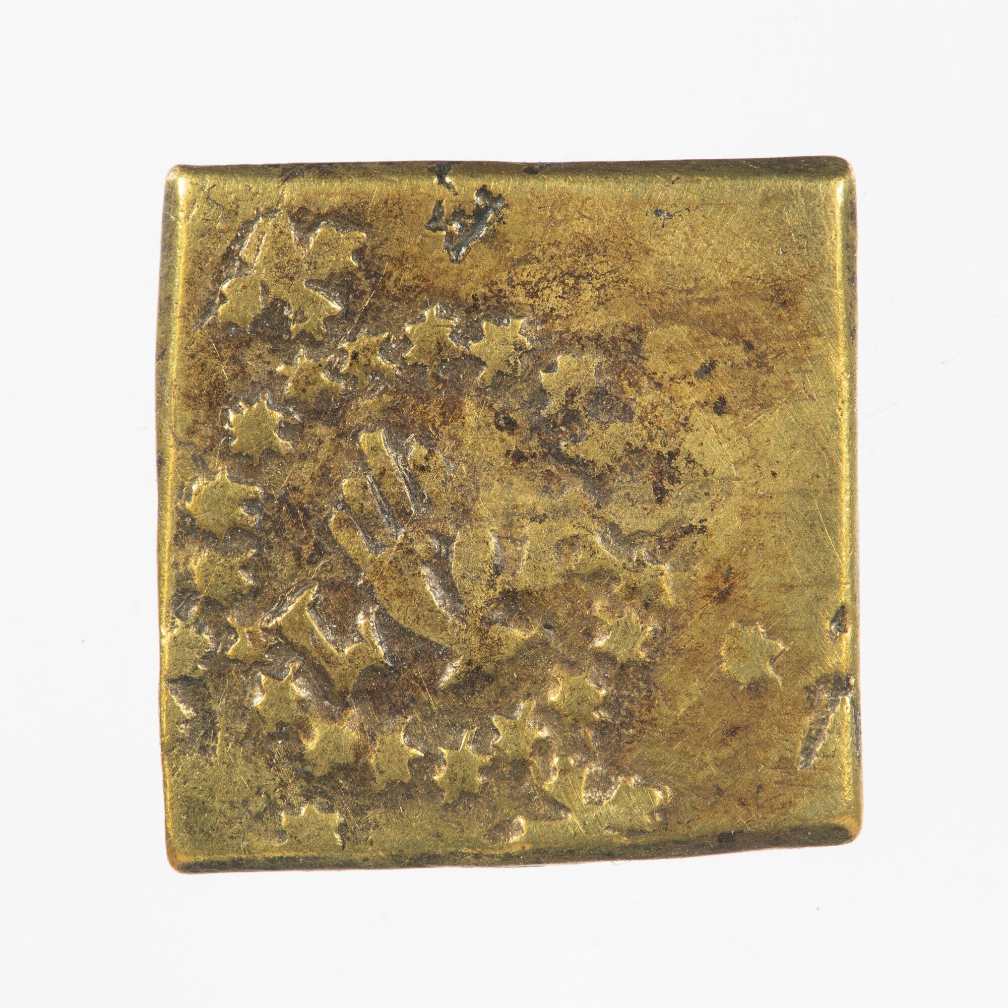Muntgewicht; halve Ecu (1519 - 1547); vz.: gekroond wapenschild met drie Franse lelies en met aan weerszijden gekroonde Franse lelies; kz.: cirkel van sterren met daarbinnen een hand en initialen L - M, en daaromheen kruizen en sterren; herkomst: Antwerpen; gewicht: 1.68 gram