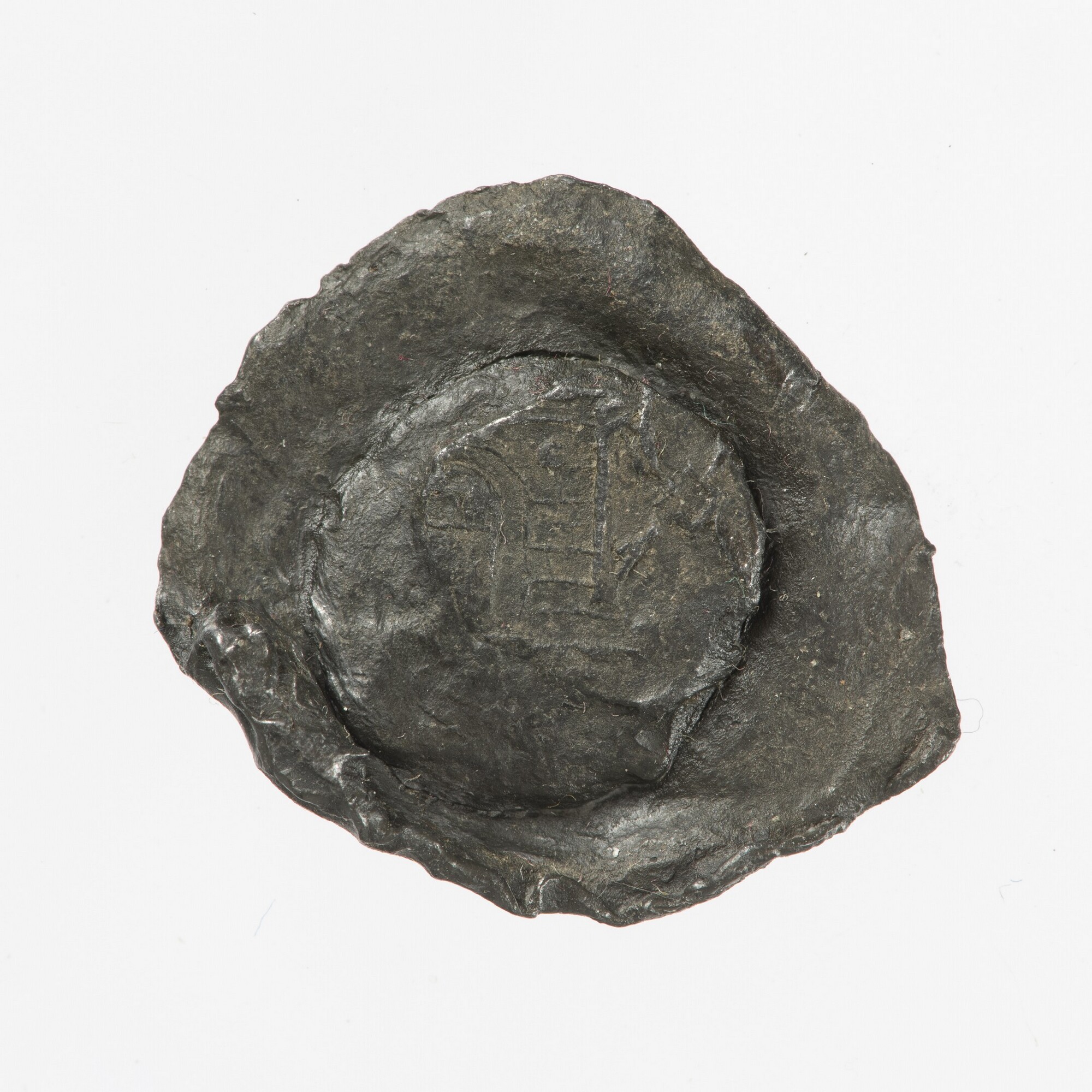 Haringnetlood; vz.: poort met aan weerszijden twee molenkruizen; kz.: telmerk van ingekraste strepen; herkomst: Montfoort