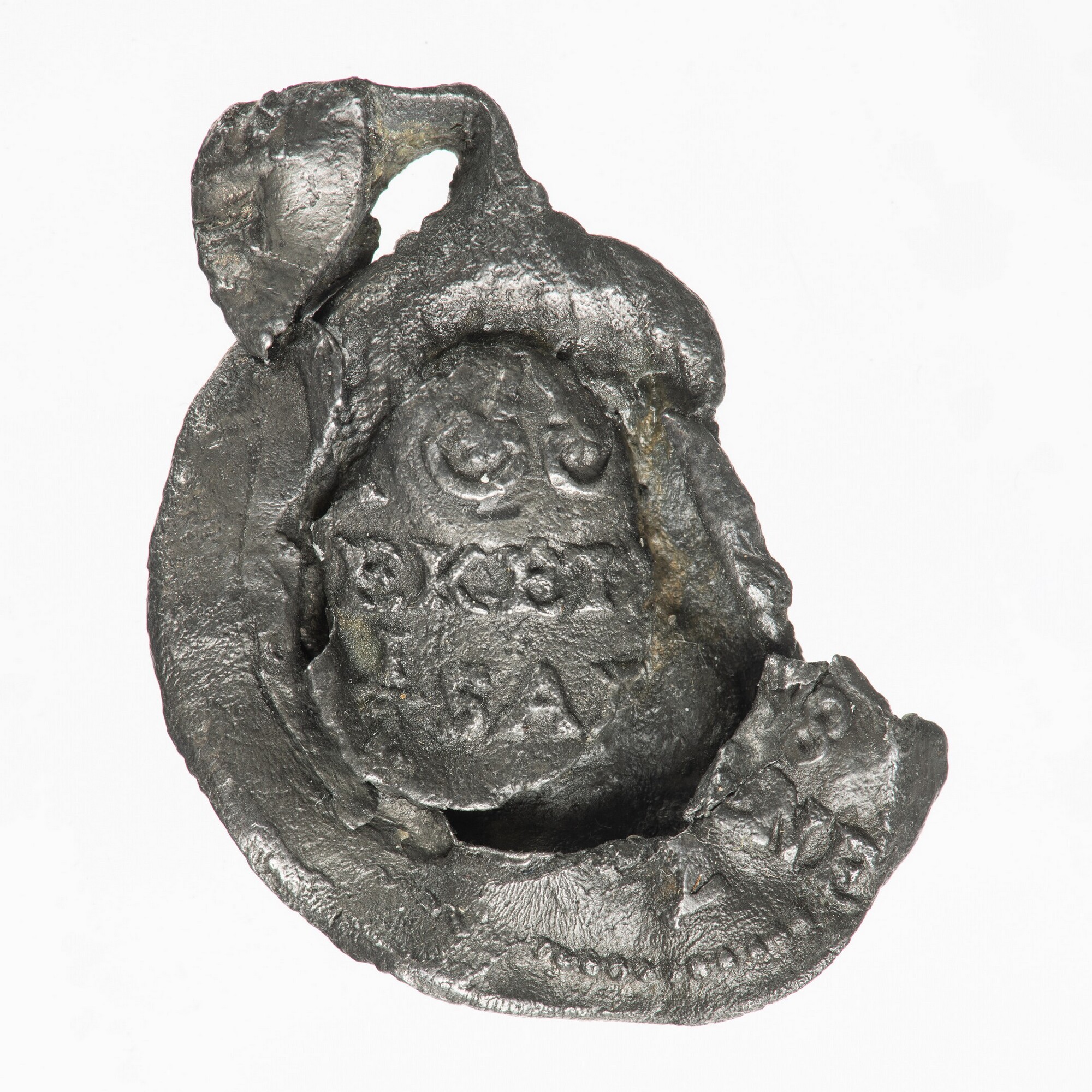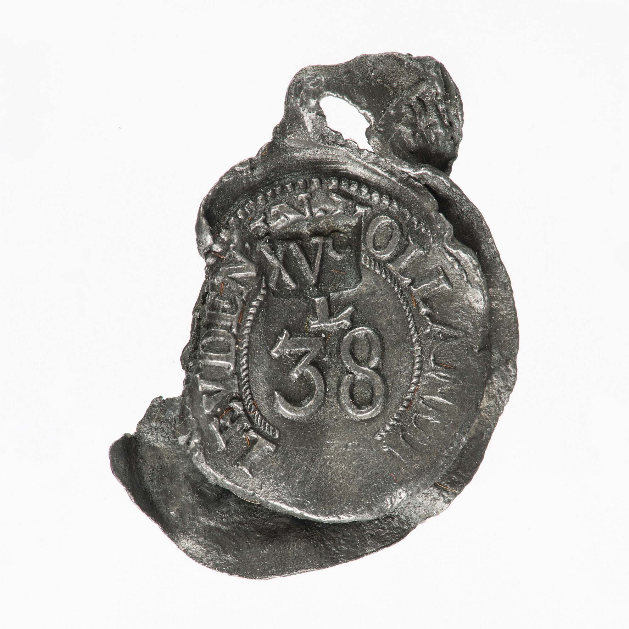 Textiellood; vz.: centraal in twee regels L(engte) / 38 met omschrift LEYDEN IN HOLLANDT en klop XV(O of C); kz.: in drie regels (gekruisde sleutels) 1/8 / EKET[...]NE / 1/2 SAT[Y]N; lip: kruis of onduidelijke letters; herkomst: Leiden