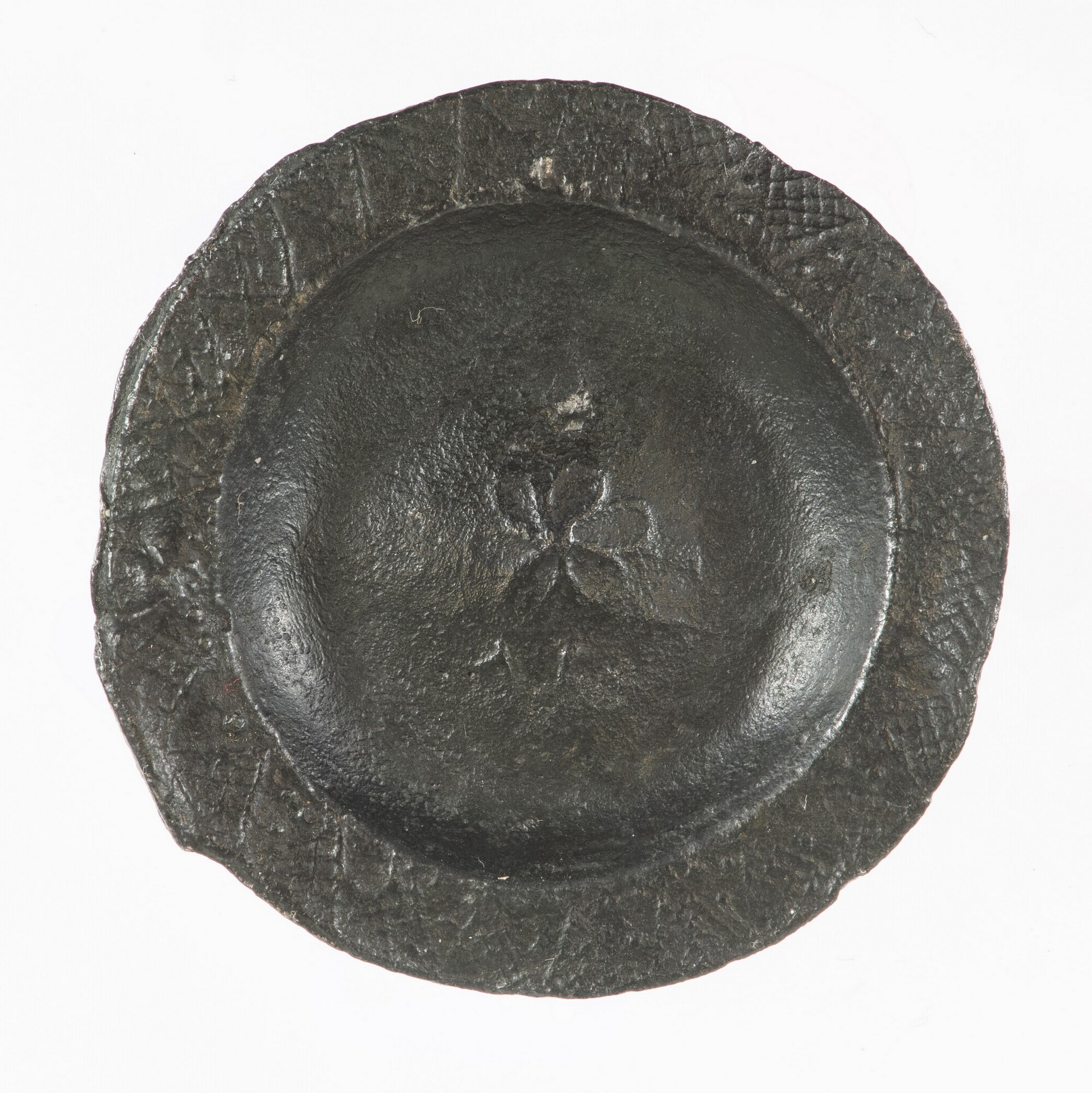 Miniatuur bord; speelgoed; centrale bloem (binnen ster?) met aan de rand afwisselend raster- en bollenversiering in geometrisch patroon