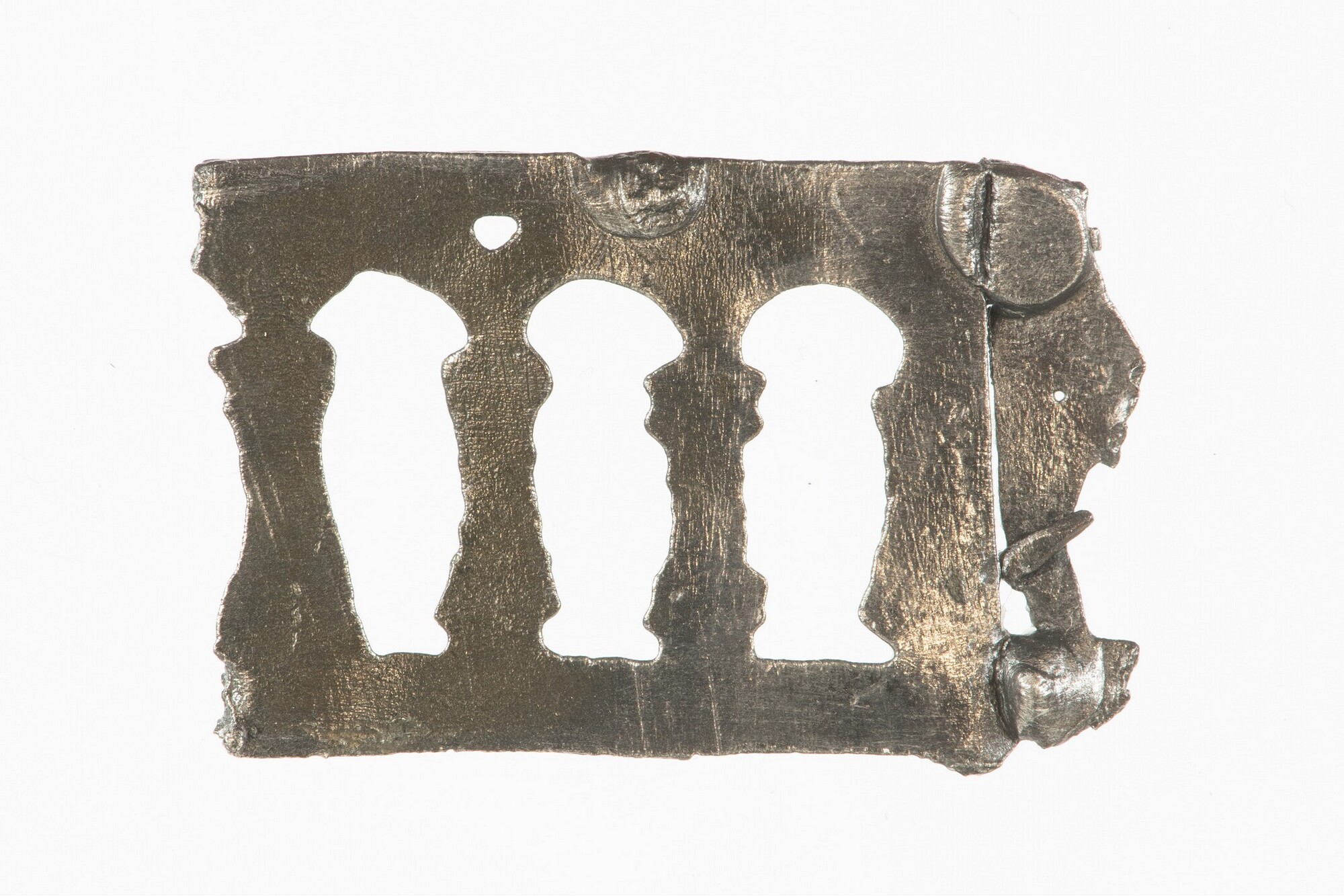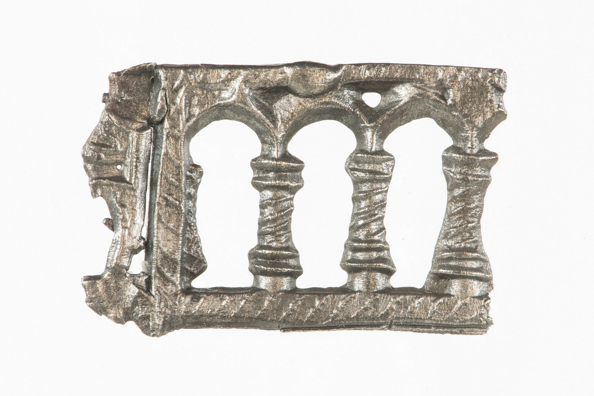 Miniatuur paneel; pilaren en bogen binnen rechthoek; onduidelijke versiering linkerkant; onderdeel van kist?