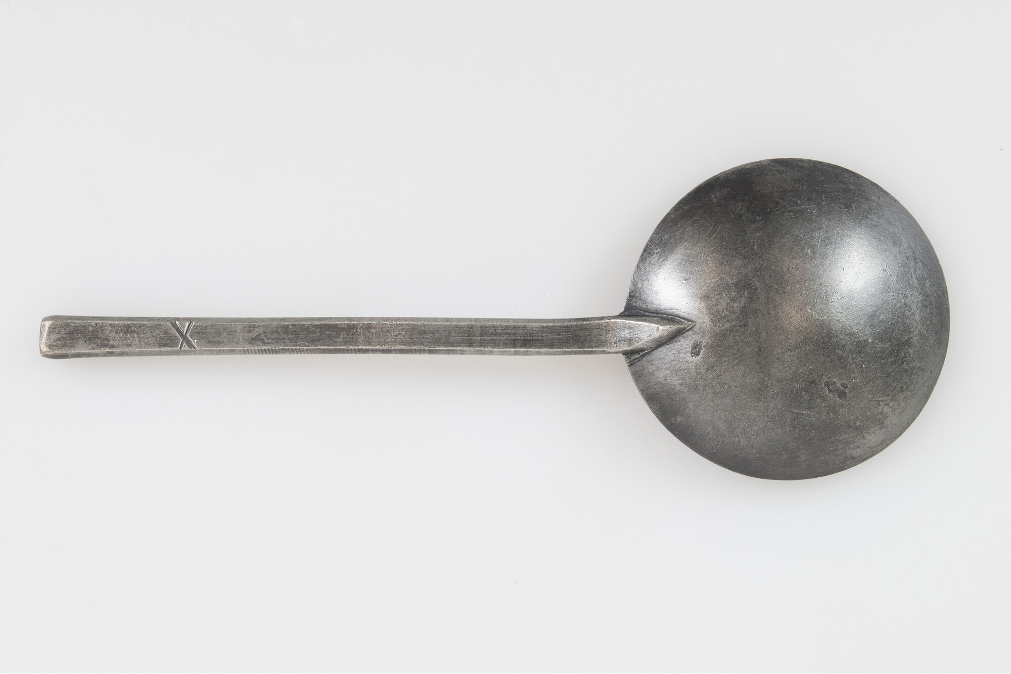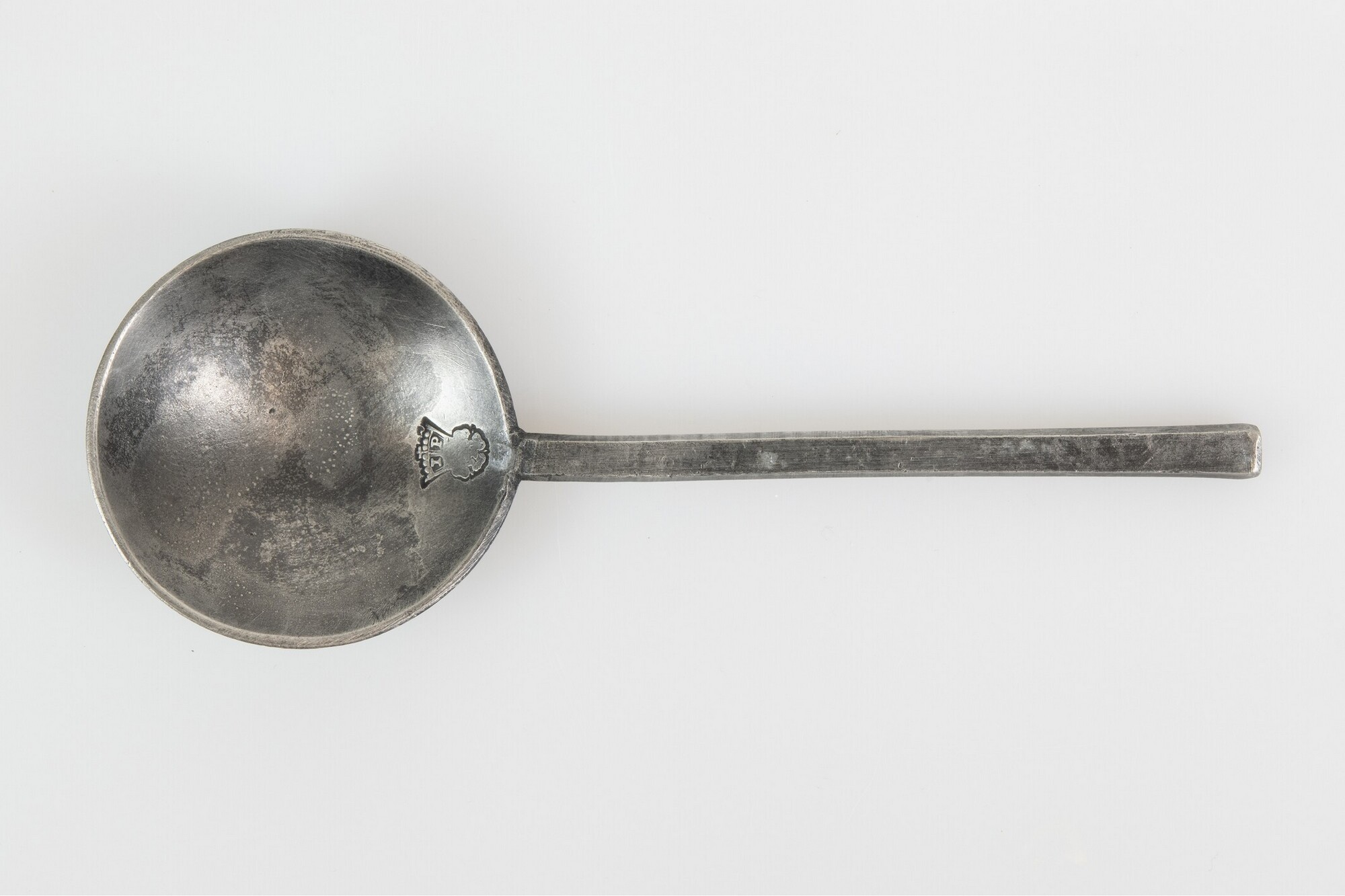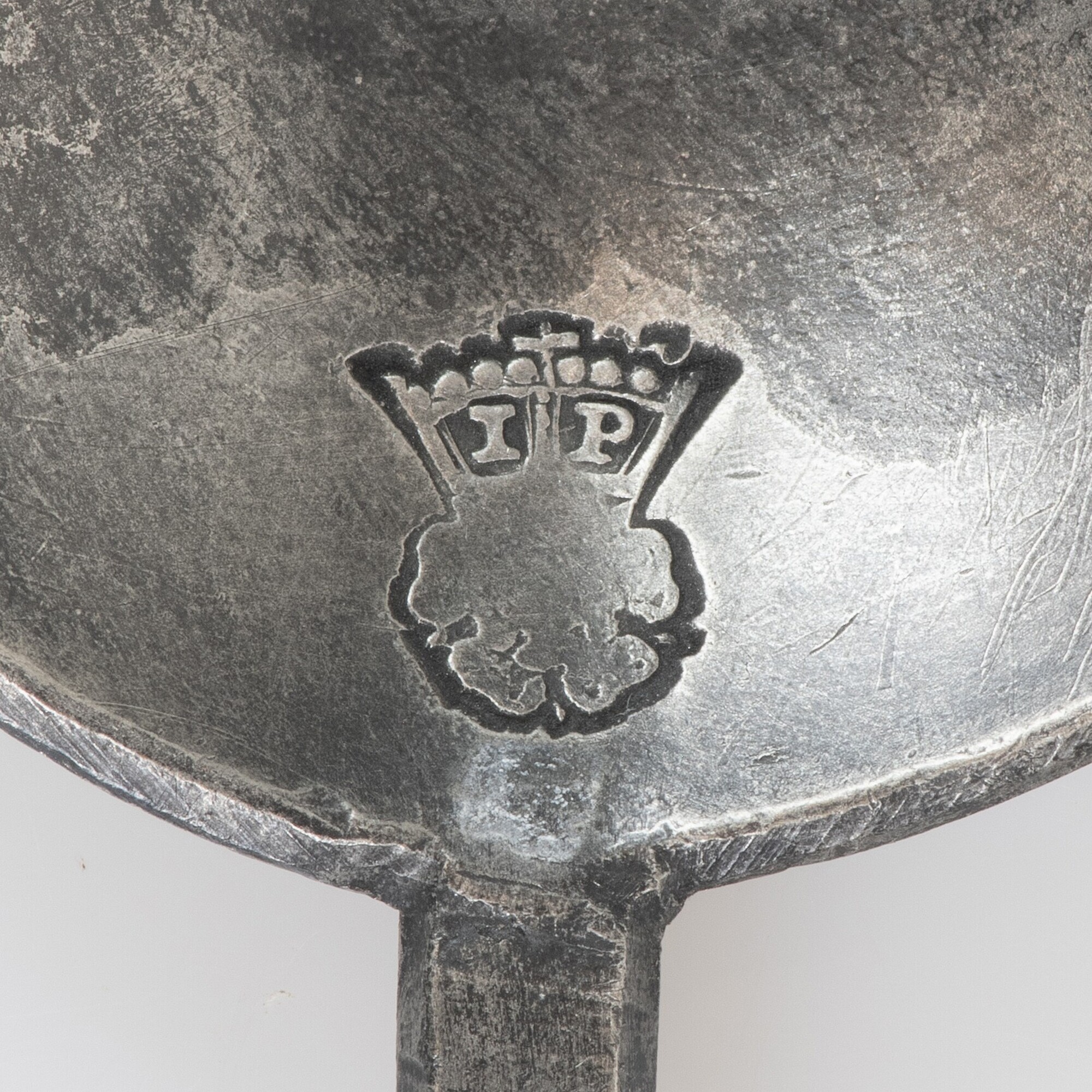 Lepel; lepel met ronde bak, zeshoekige steel, rechte steelbeeindiging; X in keerzijde steel gekrast; merkteken op bak: gekroonde roos met letters IP
