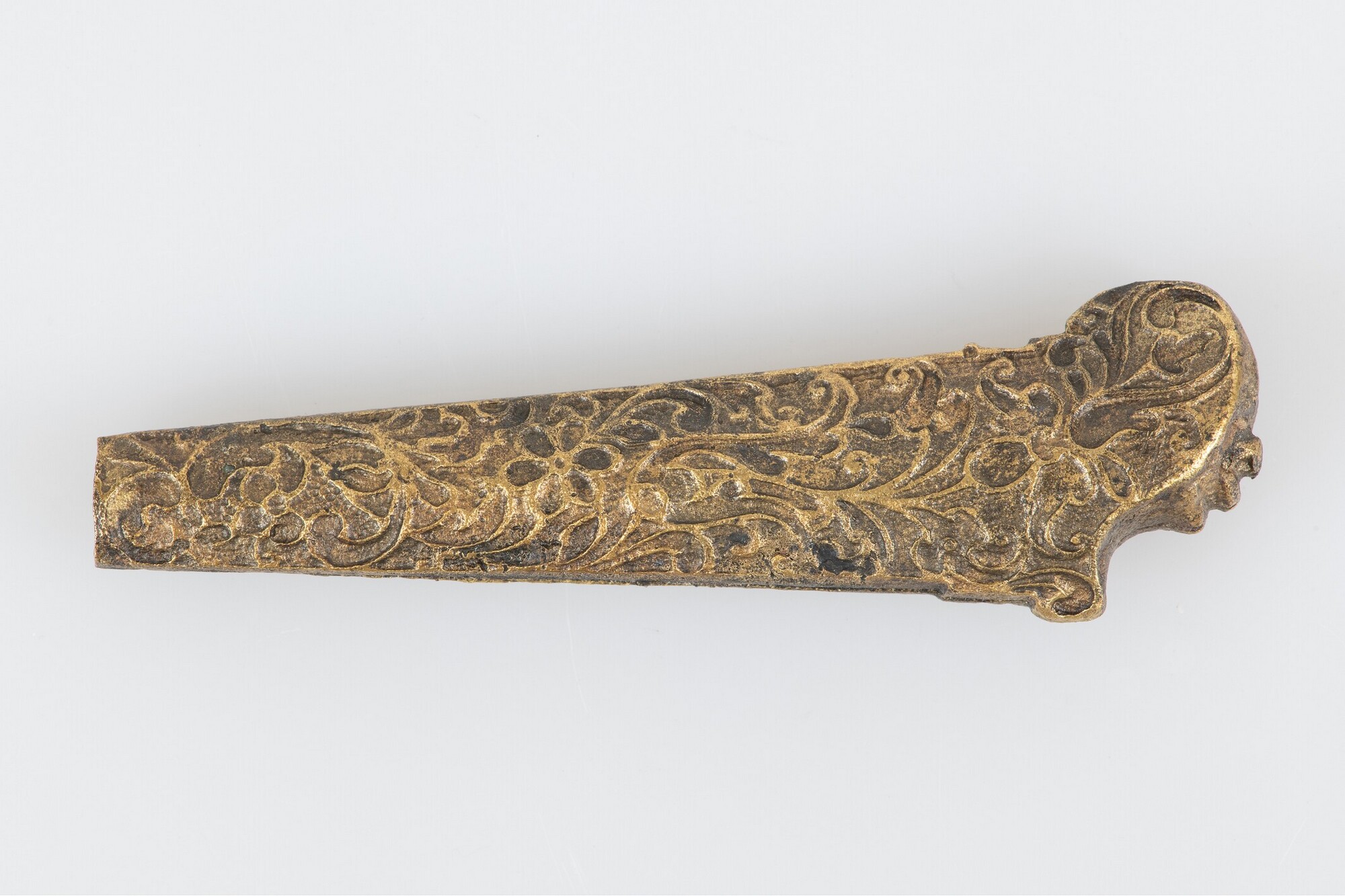 Mesheft; tweedelig; uiteinde versierd met stylistisch gezicht (mascaron); symmetrische florale versiering; origineel ingelegd met email
