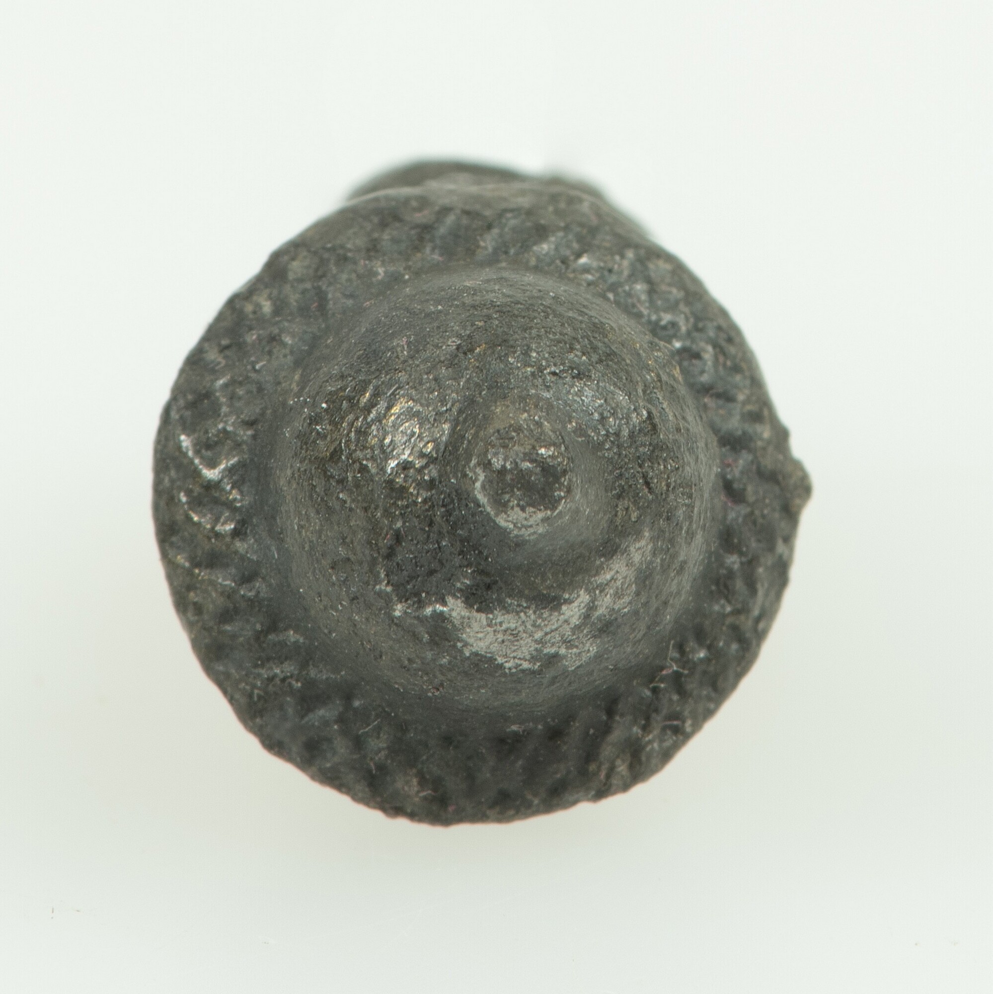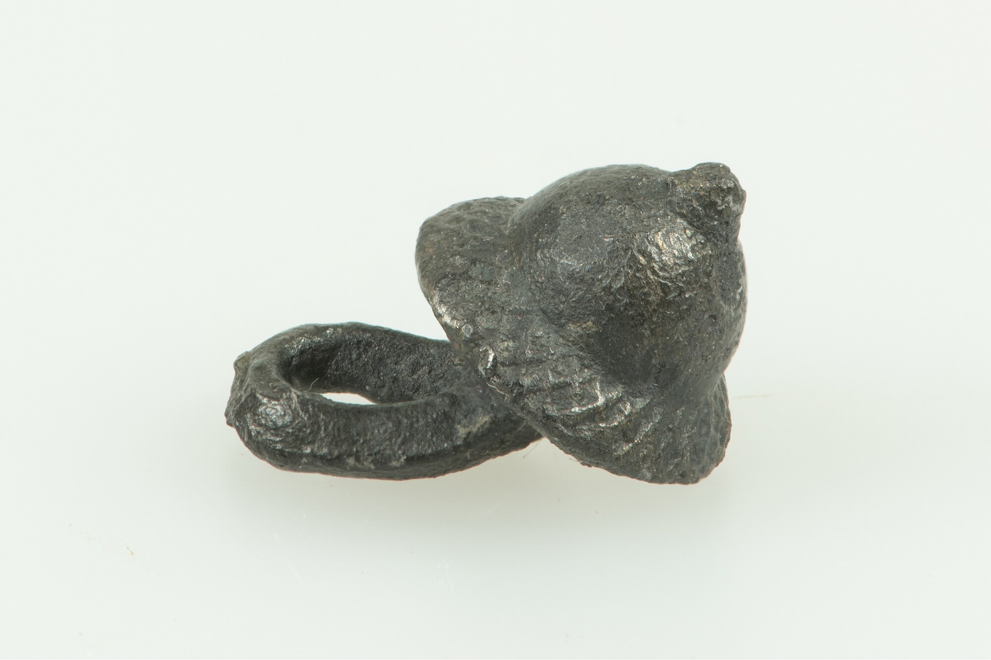 Knoop; draadoog; eikelvormig; ruitversiering langs rand; punt aan uiteinde