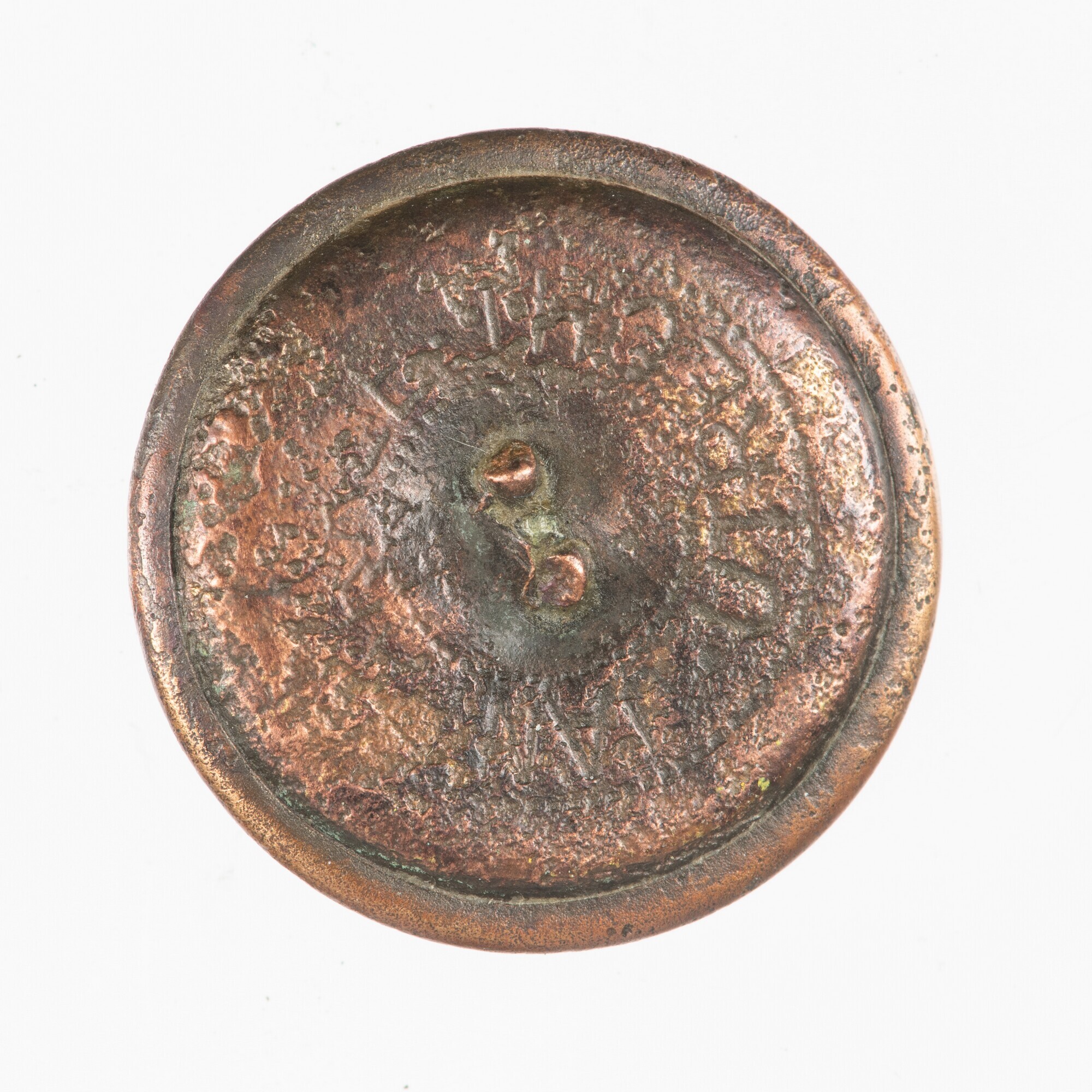Knoop; uniformknoop veld- of overjas Koninklijke Landmacht Jan Parree Type A; vz.: gekroonde leeuw met pluk halverwege de staart en zwaard en gestrikte pijlenbundel in handen op veld van azuur met zes blokken; kz.: oog bevestiging met omschrift JAN [P]AR[RE]E UTRECHT