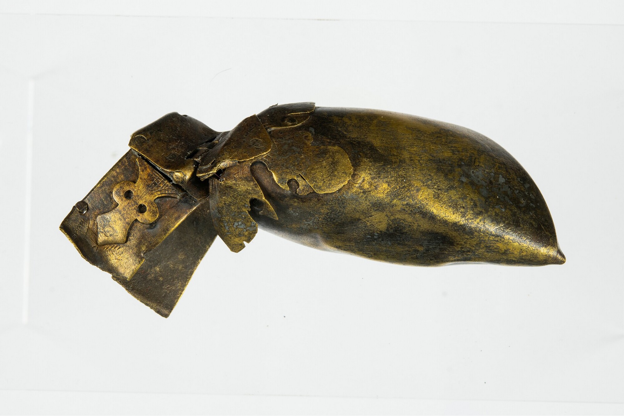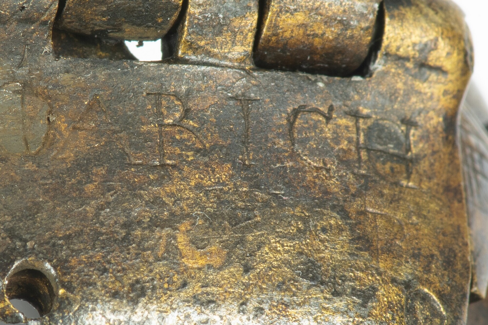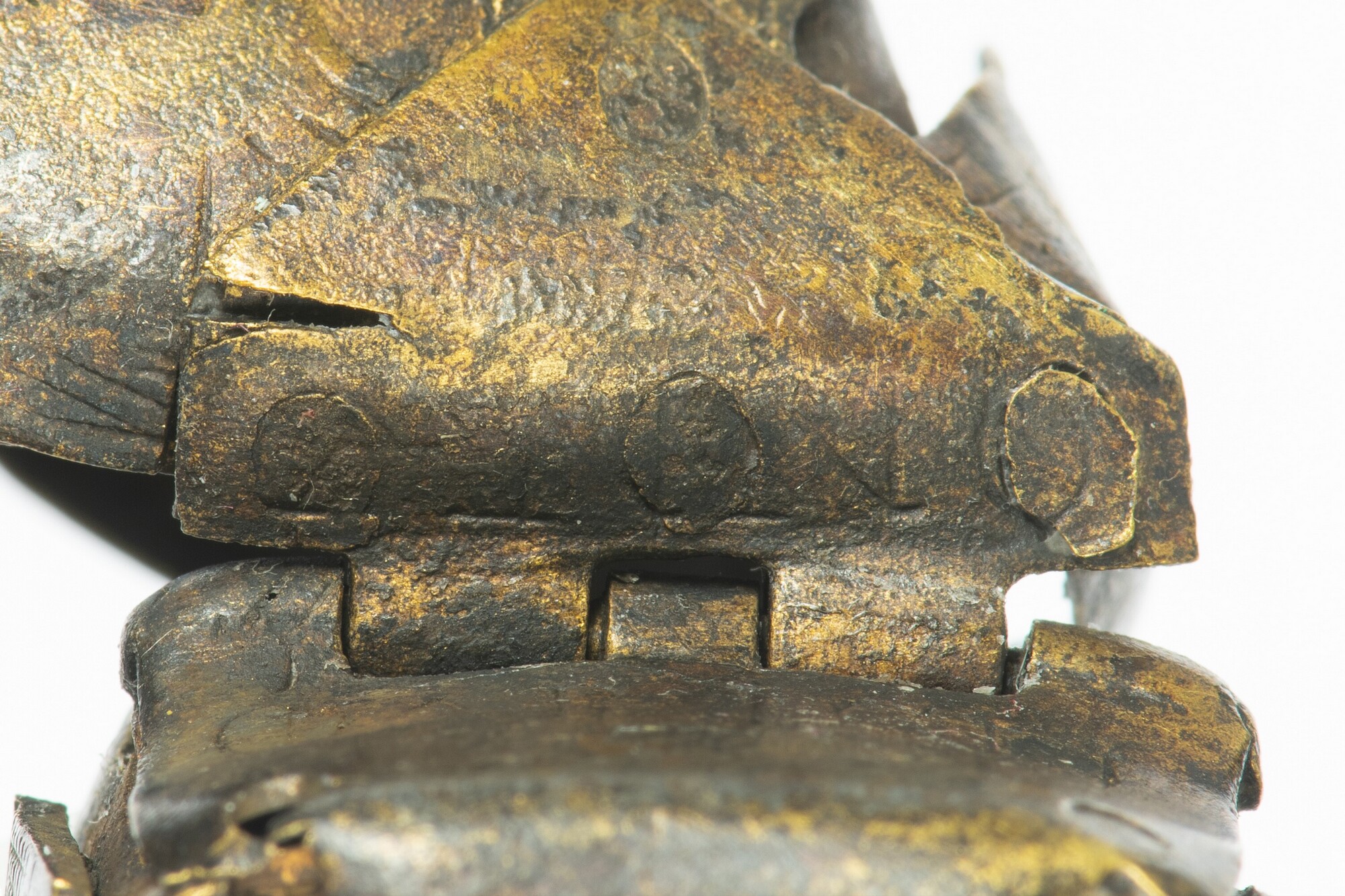 Tabaksdoos; deksel, scharnier en deel zijkant aanwezig; ingegraveerd in scharnier zijn de woorden ANNO / IARICH / [...]P?; lijnversieringen op en zijkanten