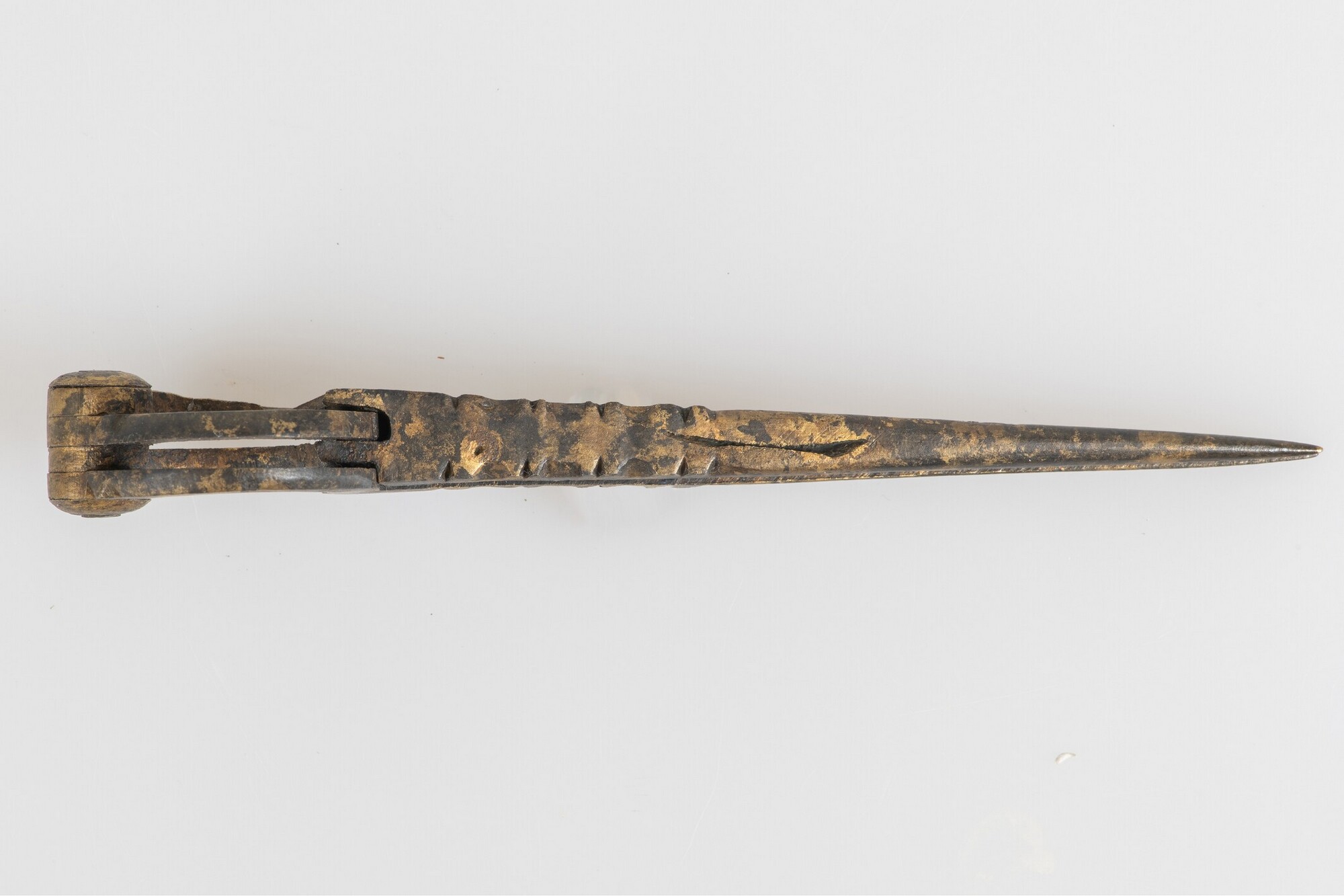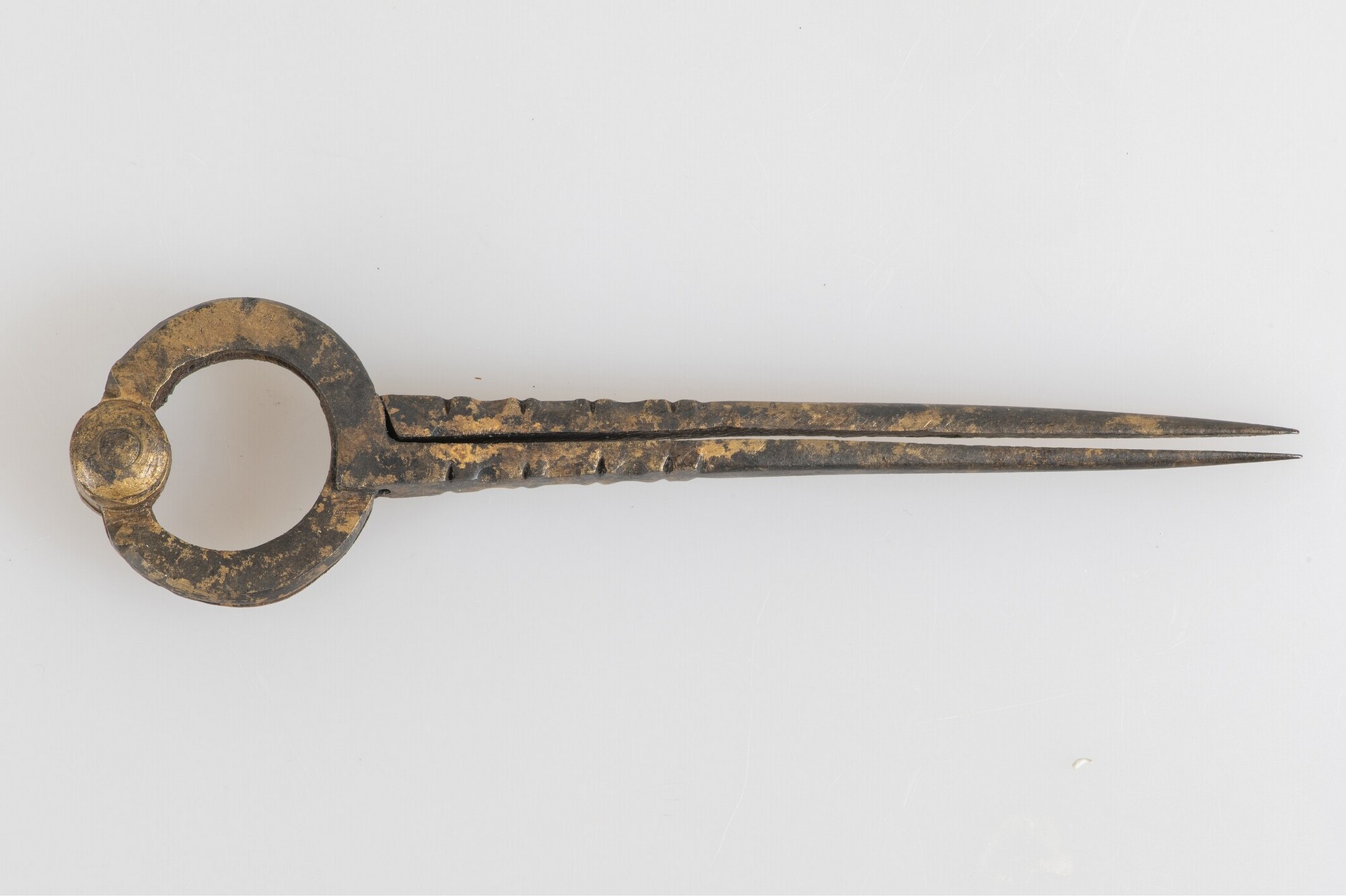 Passer; twee grote ogen met scharnier bovenzijde; twee gesloten benen, met aan de bovenste zijde eenvoudig versierd met inkepingen