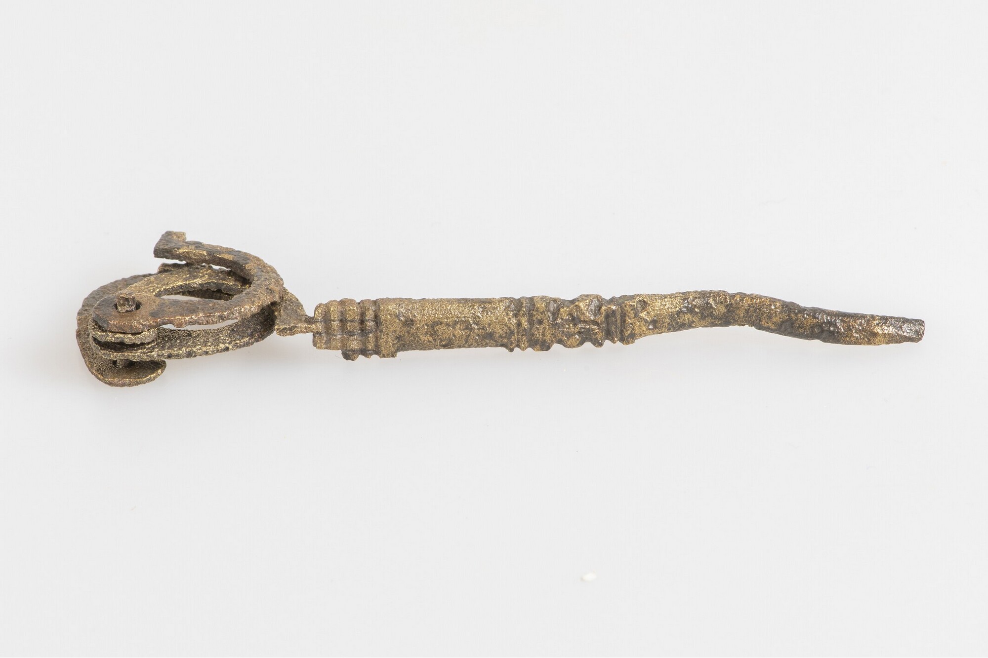 Passer; twee grote ogen met scharnier bovenzijde; gesloten been met versieringen bovenzijde en midden