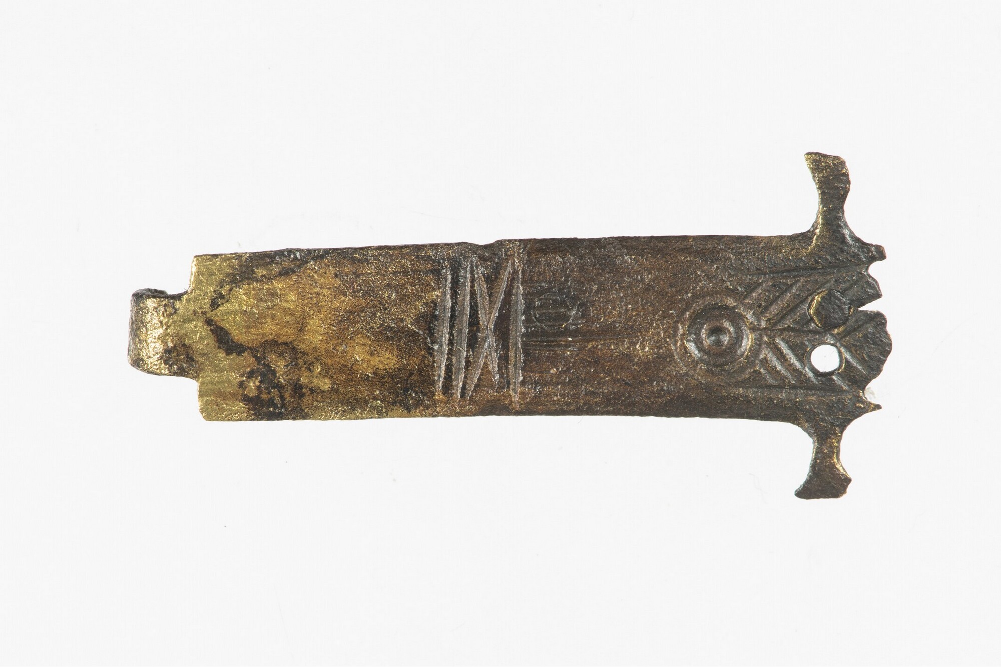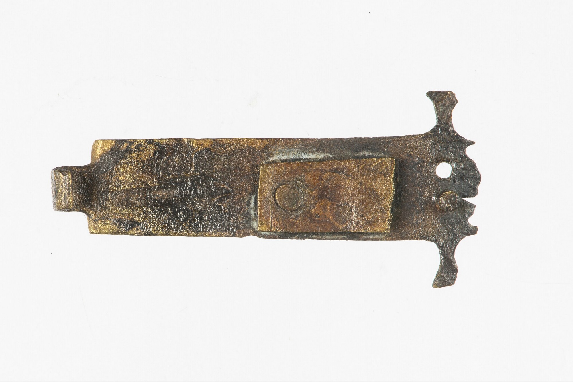 Boekbandsluiting; klinkplaatje achterkant vastgeklinken met twee nagels door voorzijde; sluithaak; versierd met zaag- en vijlwerk in lijn-, raster- en cirkelversiering