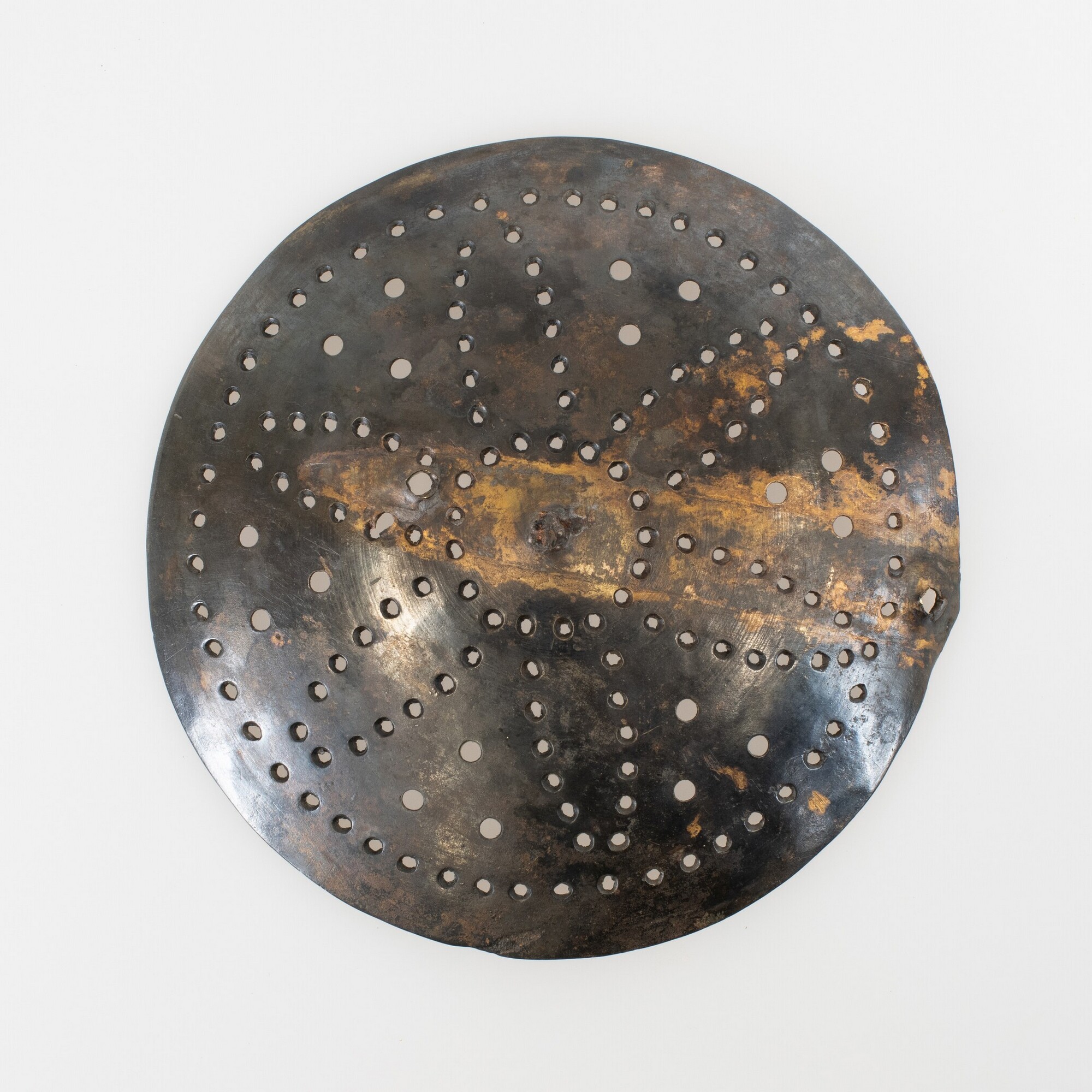 Schuimspaan; ronde bak met stervormige gaten met drie punten tussen de 'stralen' en daaromheen een rij met gaten; bevestigingsgat; steel ontbreekt; ijzeren klinknagel in centraal gat; twee klinknagelgaten midden