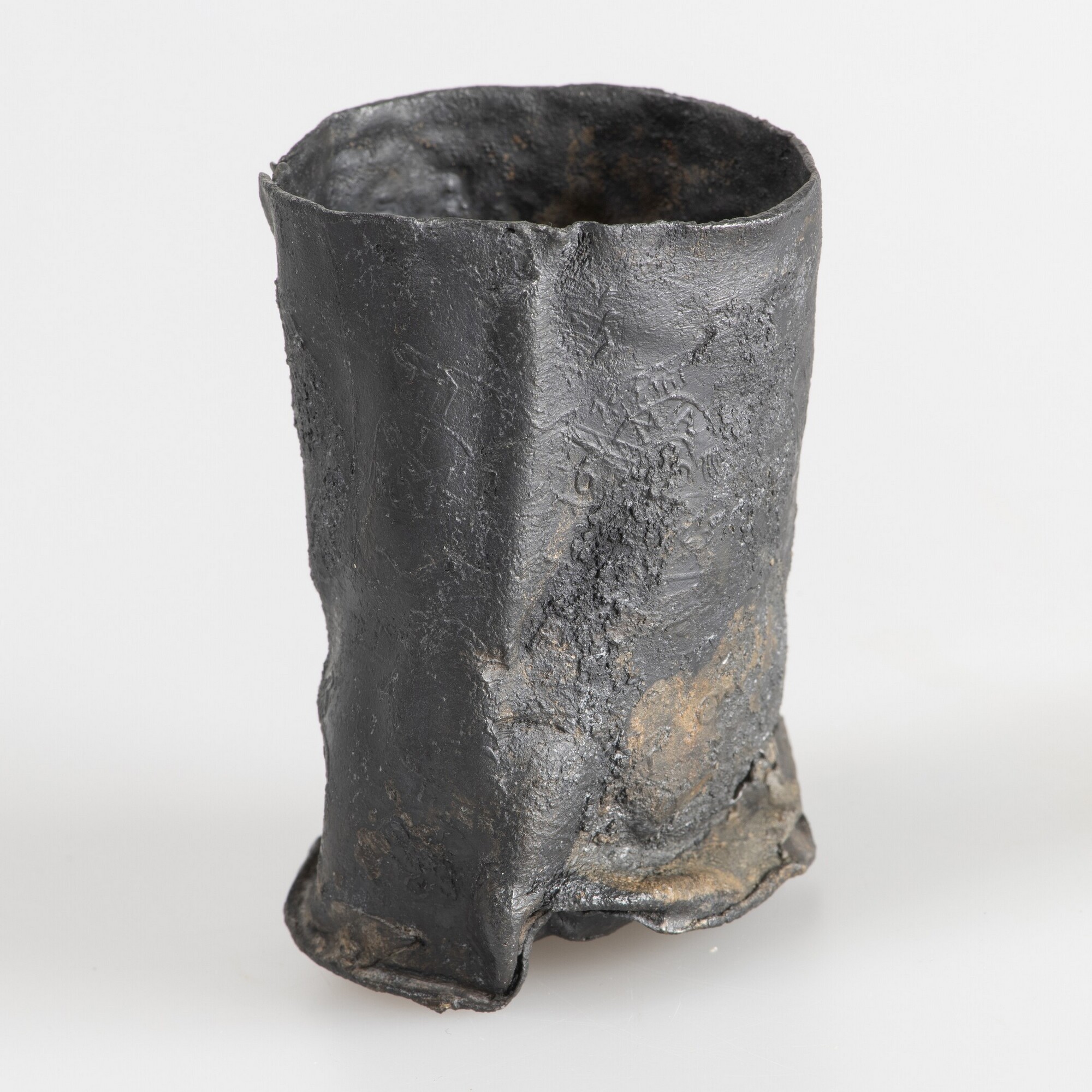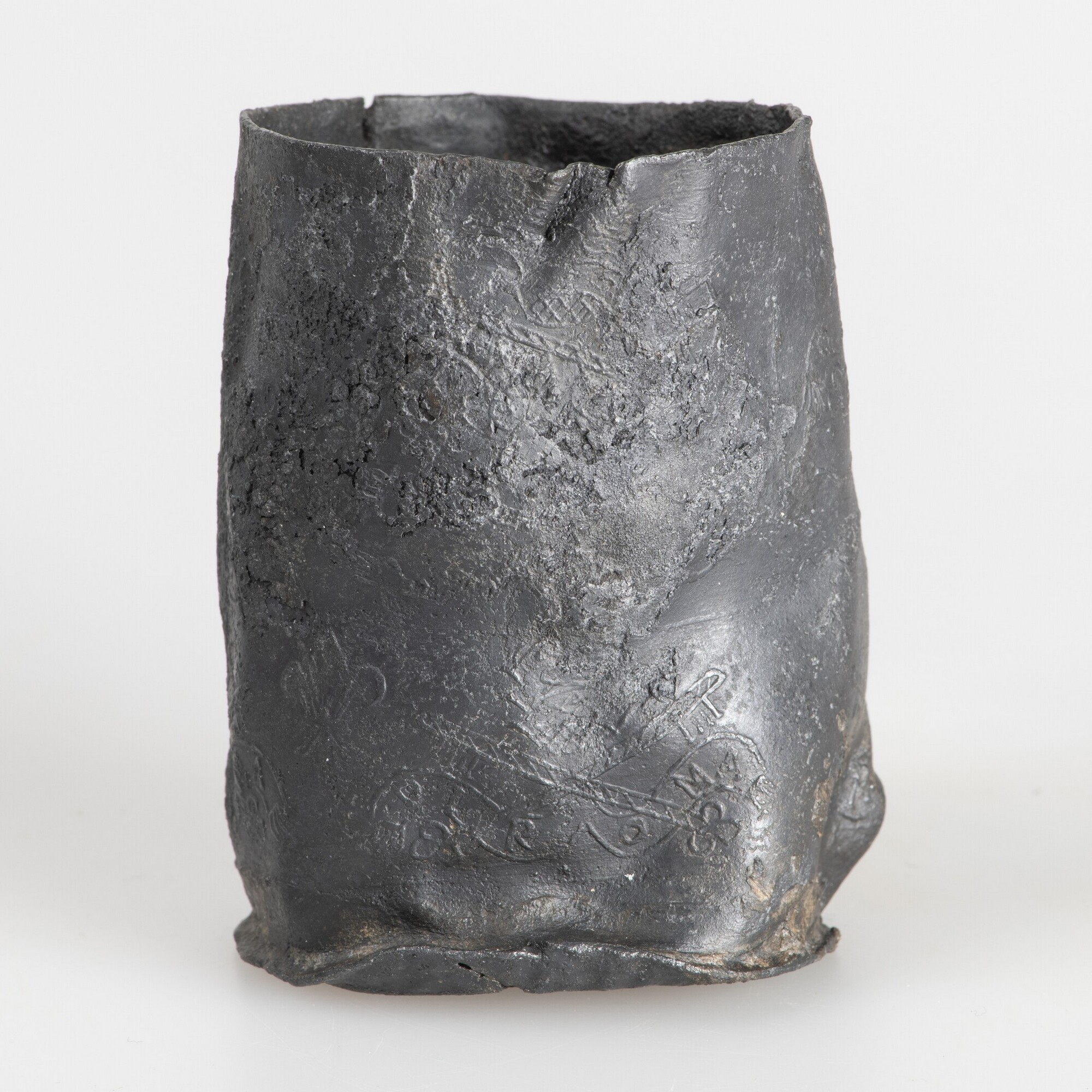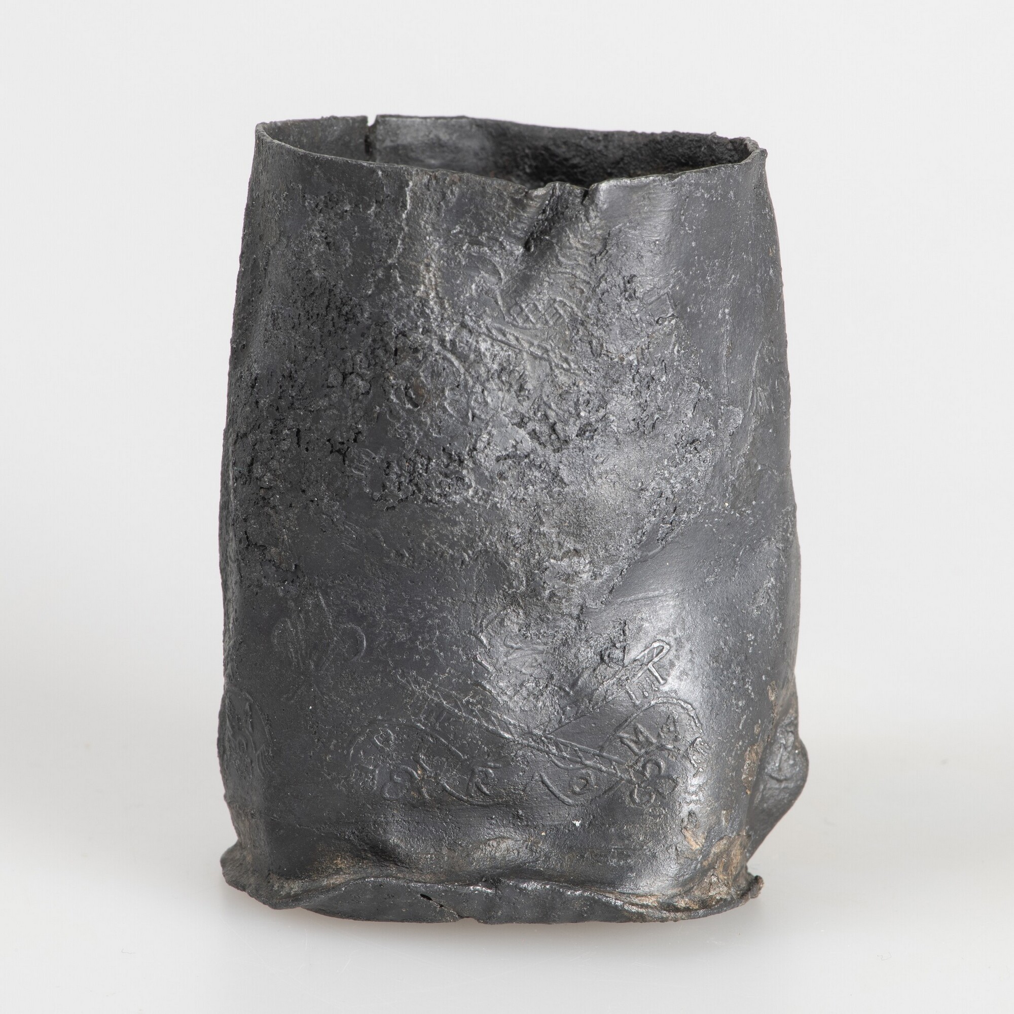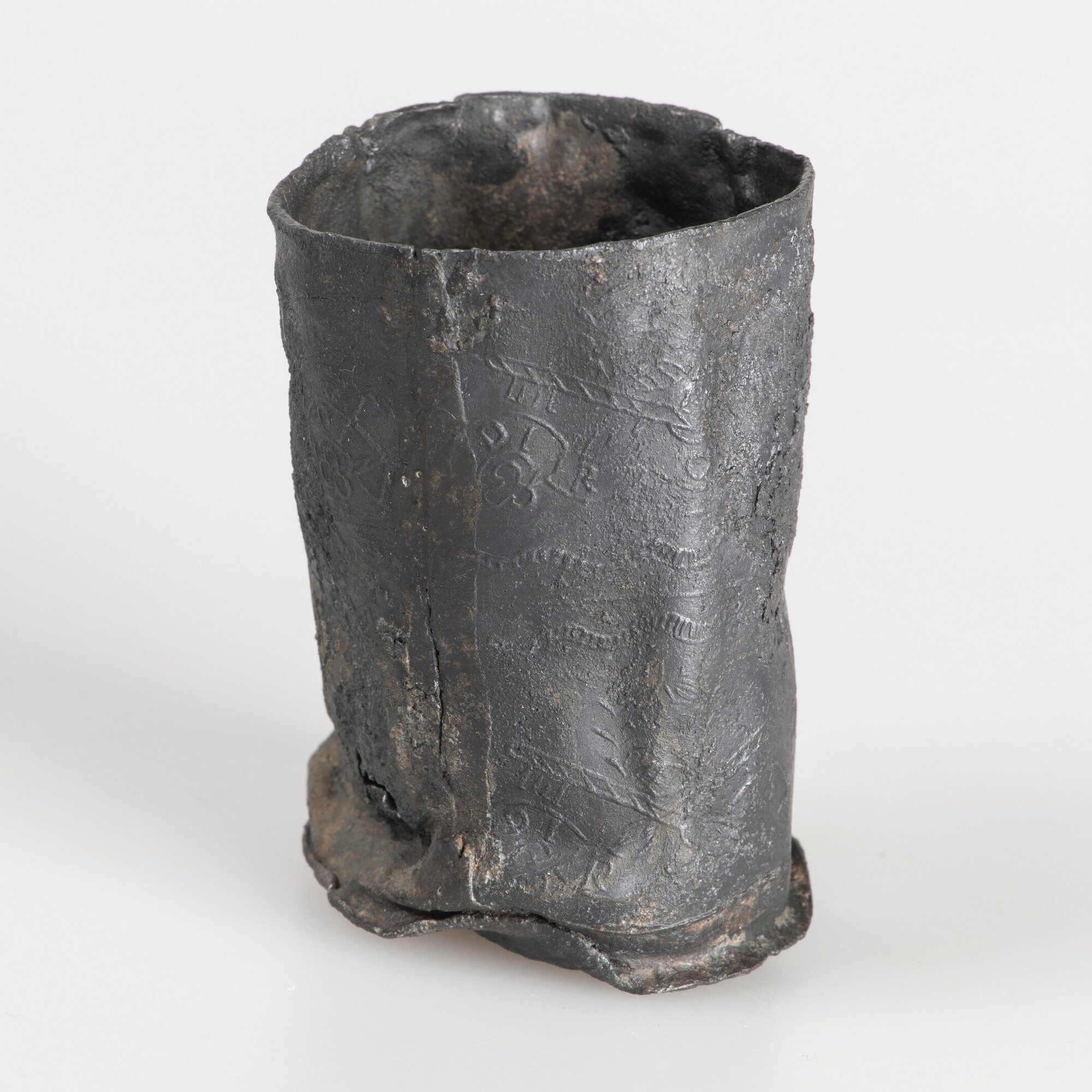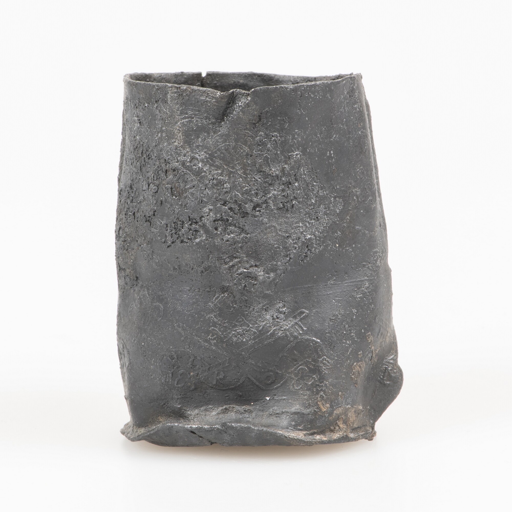 Reliekhouder; deksel ontbreekt; beker met twee rijen van Franse lelies en stempels van pauselijk tiara, gekruisde sleutels en banderol met opschrift DI RO MA, gescheiden door twee rijen met golfversieringen
