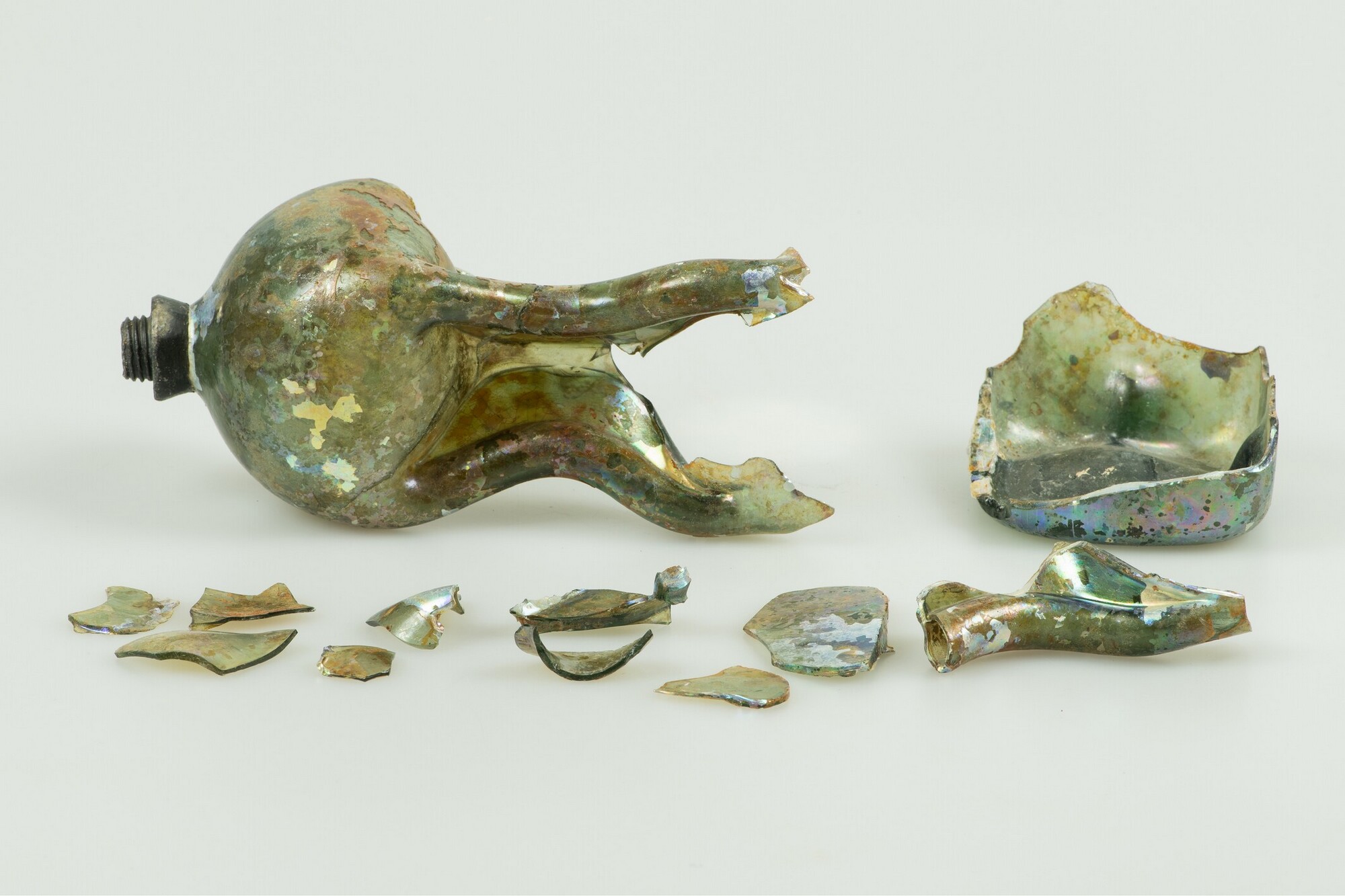 Kelderfles; gl-fle-129; hoge kuttrolf bestaande uit twee delen die in het midden versmald overgaan in vijf verticale buizen, licht opgestoken bodem met pontilmerk; kraag van loden schroefdop aanwezig