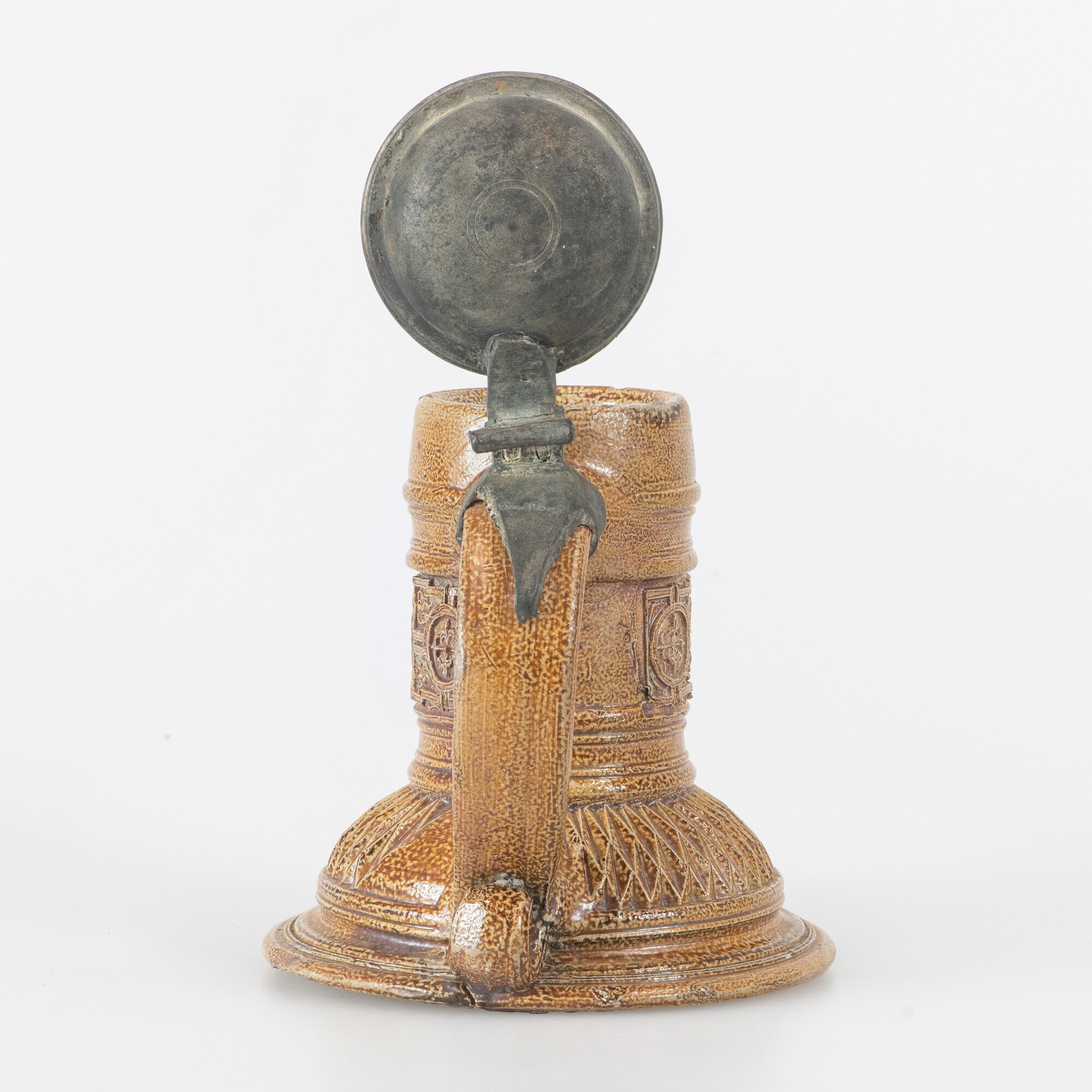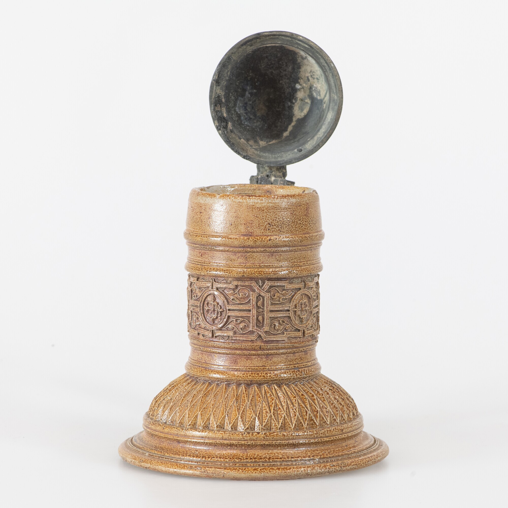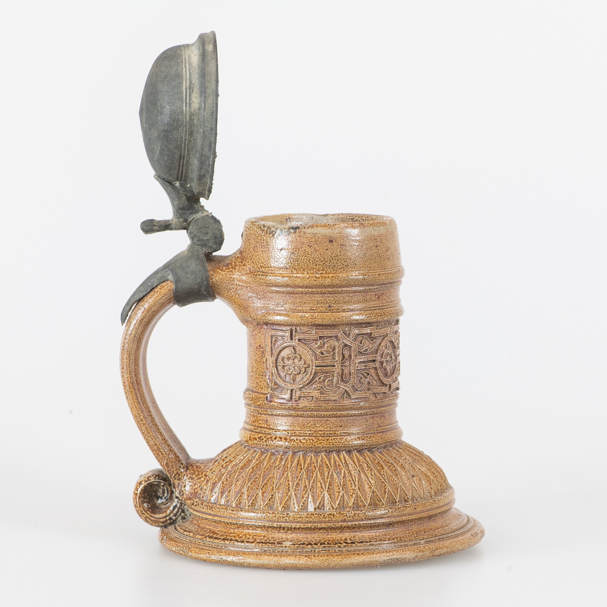 Kan (fragment); steengoed kan met tinnen deksel; s2-kan-37; bolle kan met hoge buik met ribbel, cilindrische hals met kraagrand, ribbels op halsaanzet en op hals, verticaal lintoor met krul aan de onderzijde; steengoed met oppervlaktebehandeling: ijzerengobe en zoutglazuur; fries met geometrische en florale motieven op hals, kerfsneeversiering op schouder; bol tinnen deksel met montuur op ...