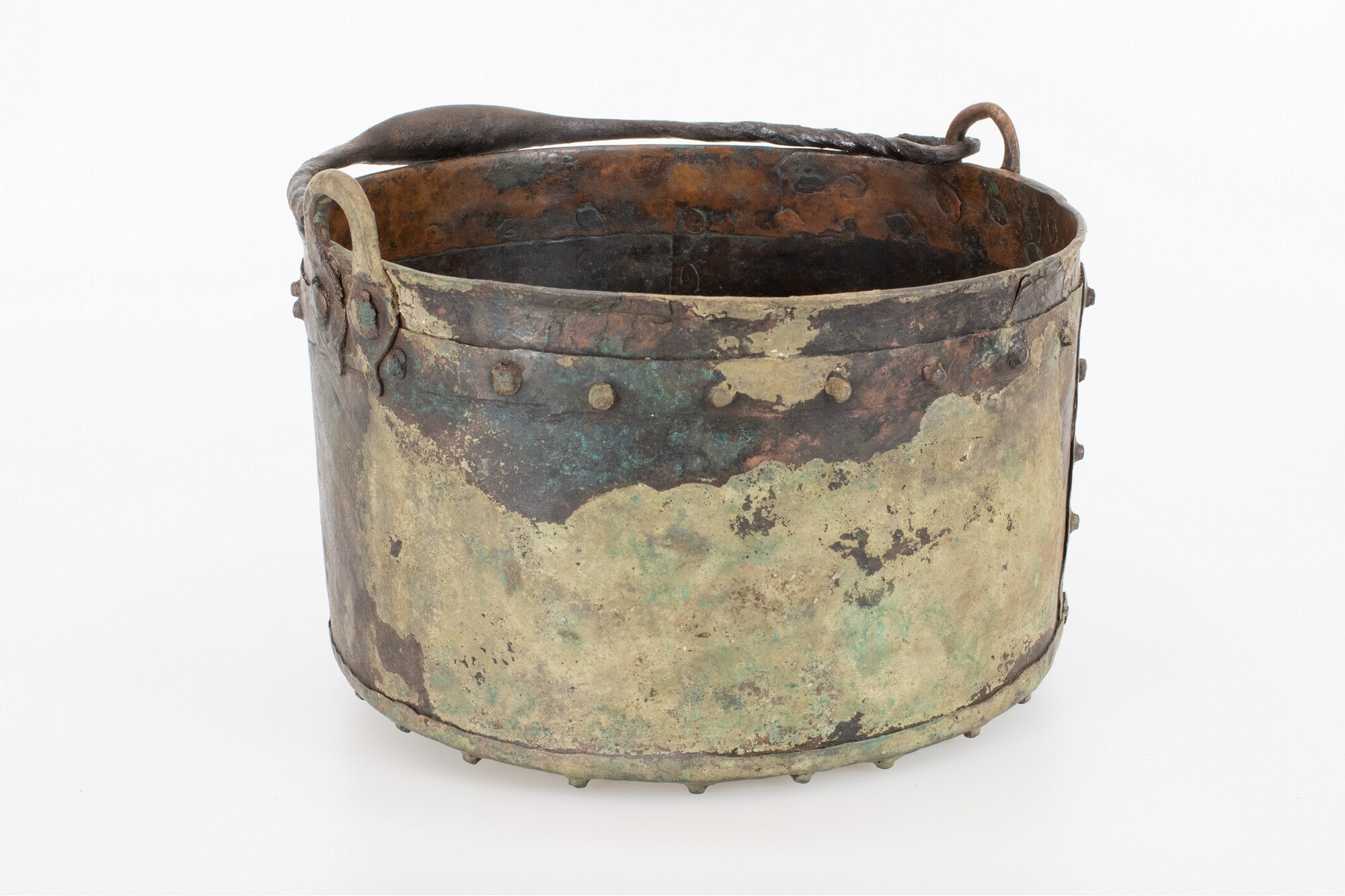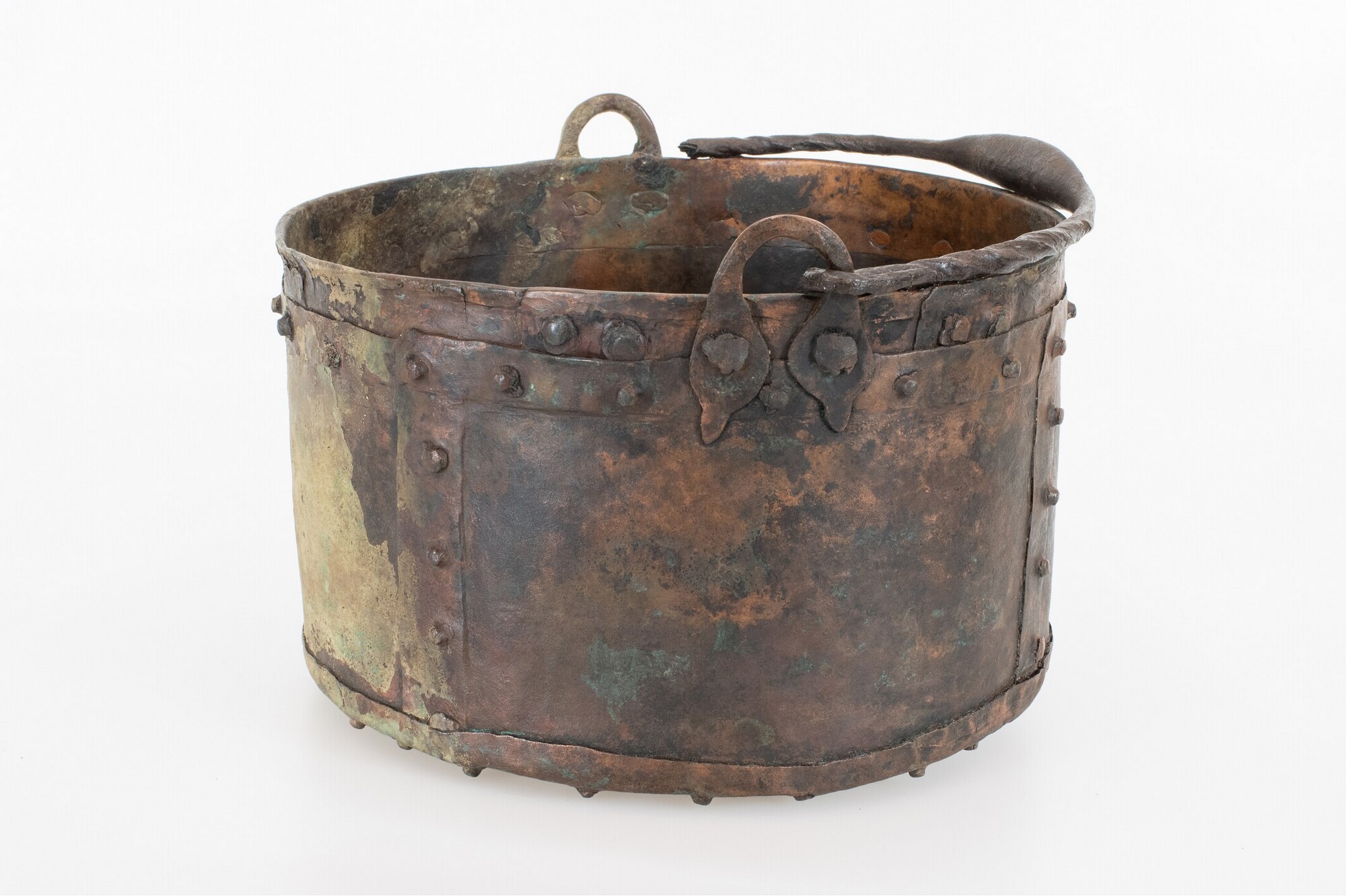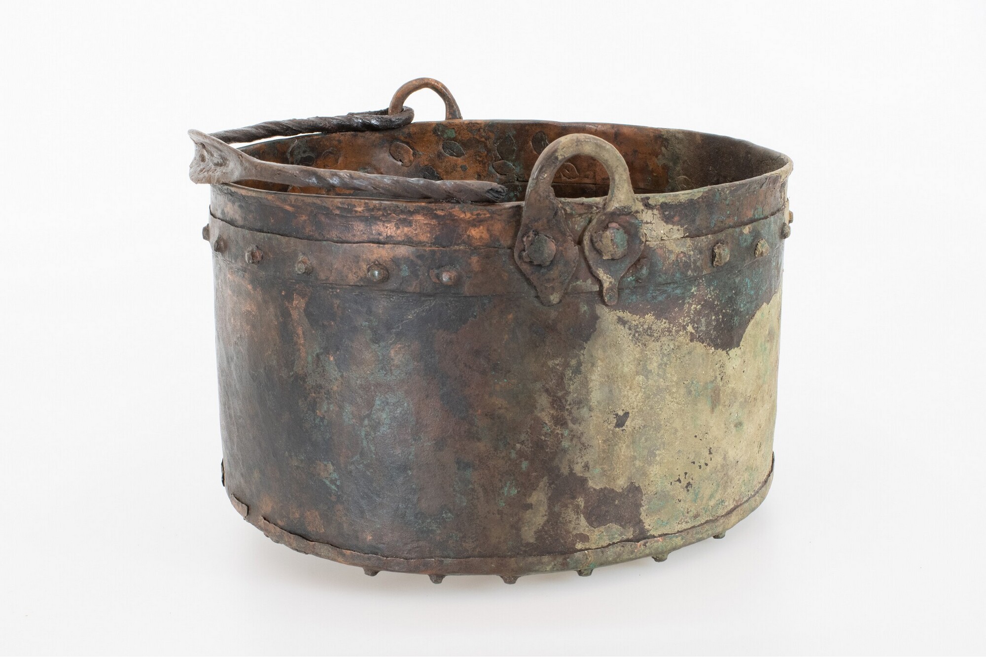 Ketel; cilindrisch op een platte bodem; zowel de hangoren als de messing band zijn met koperen en messing (holle) klinknagels bevestigd. Reparatie in de bodem met een koperplaat (lekstop). Het hengsel is getordeerd met een verbrede handgreep in het midden