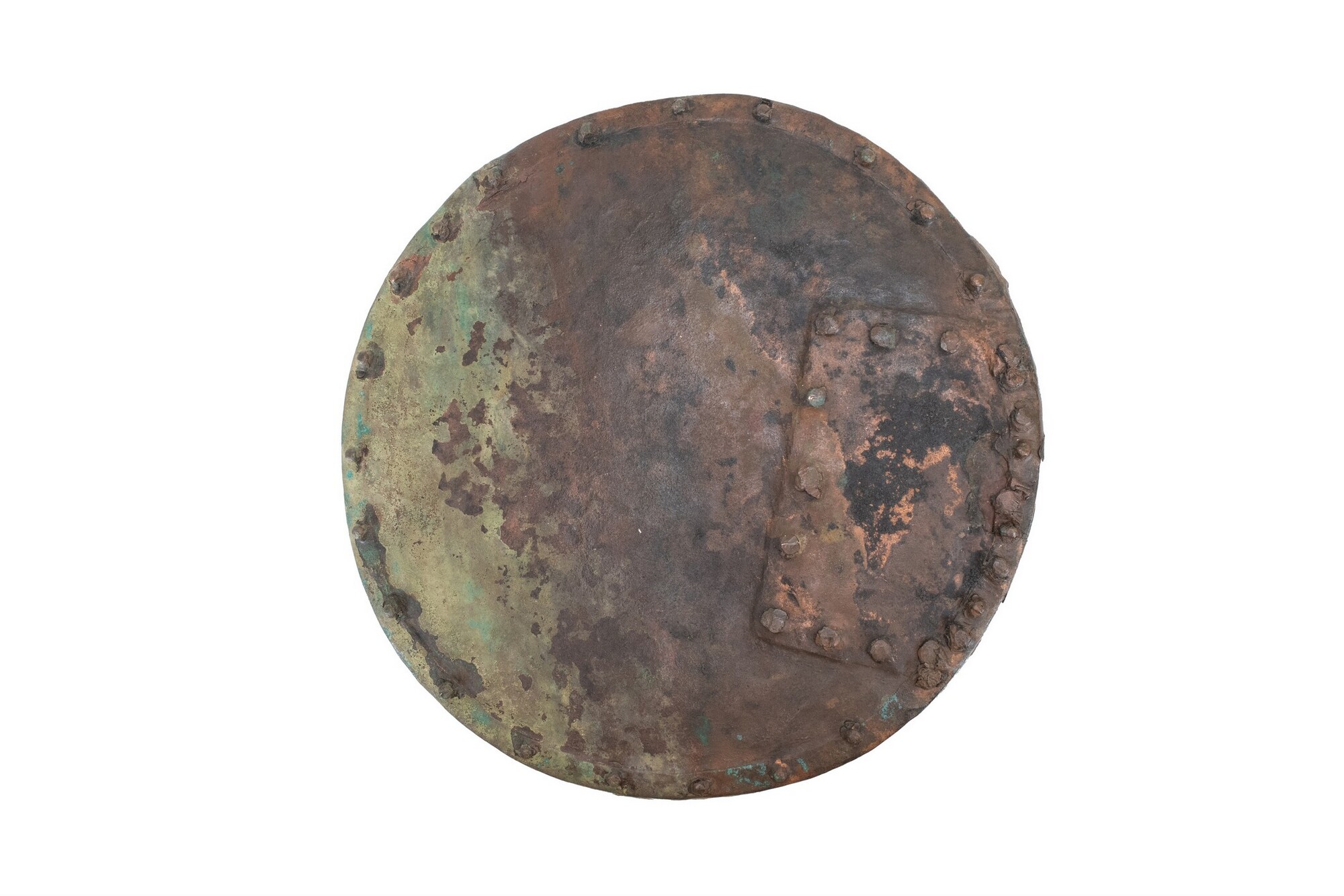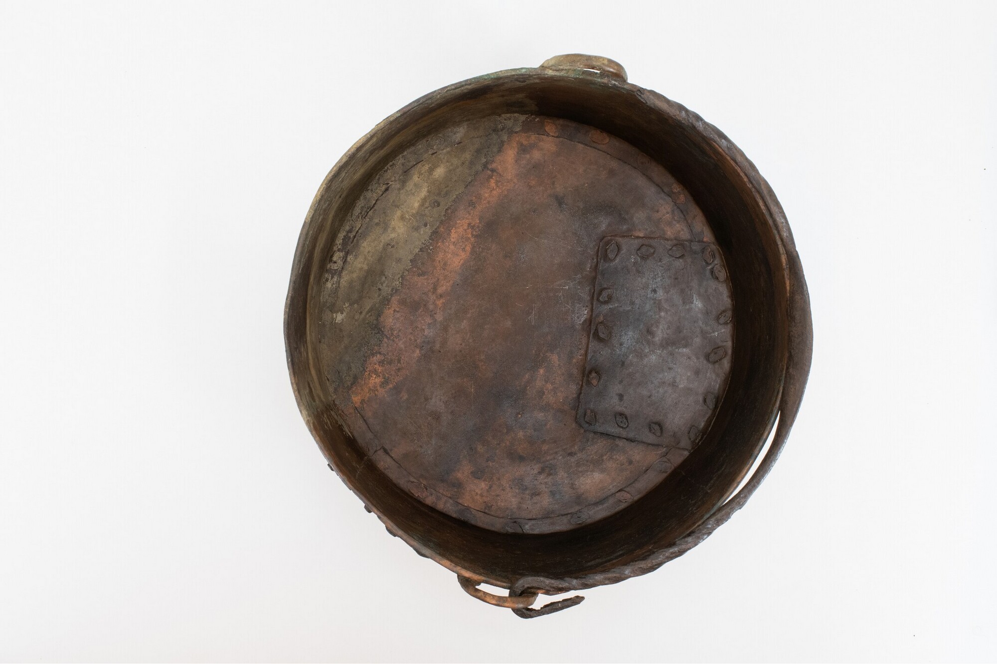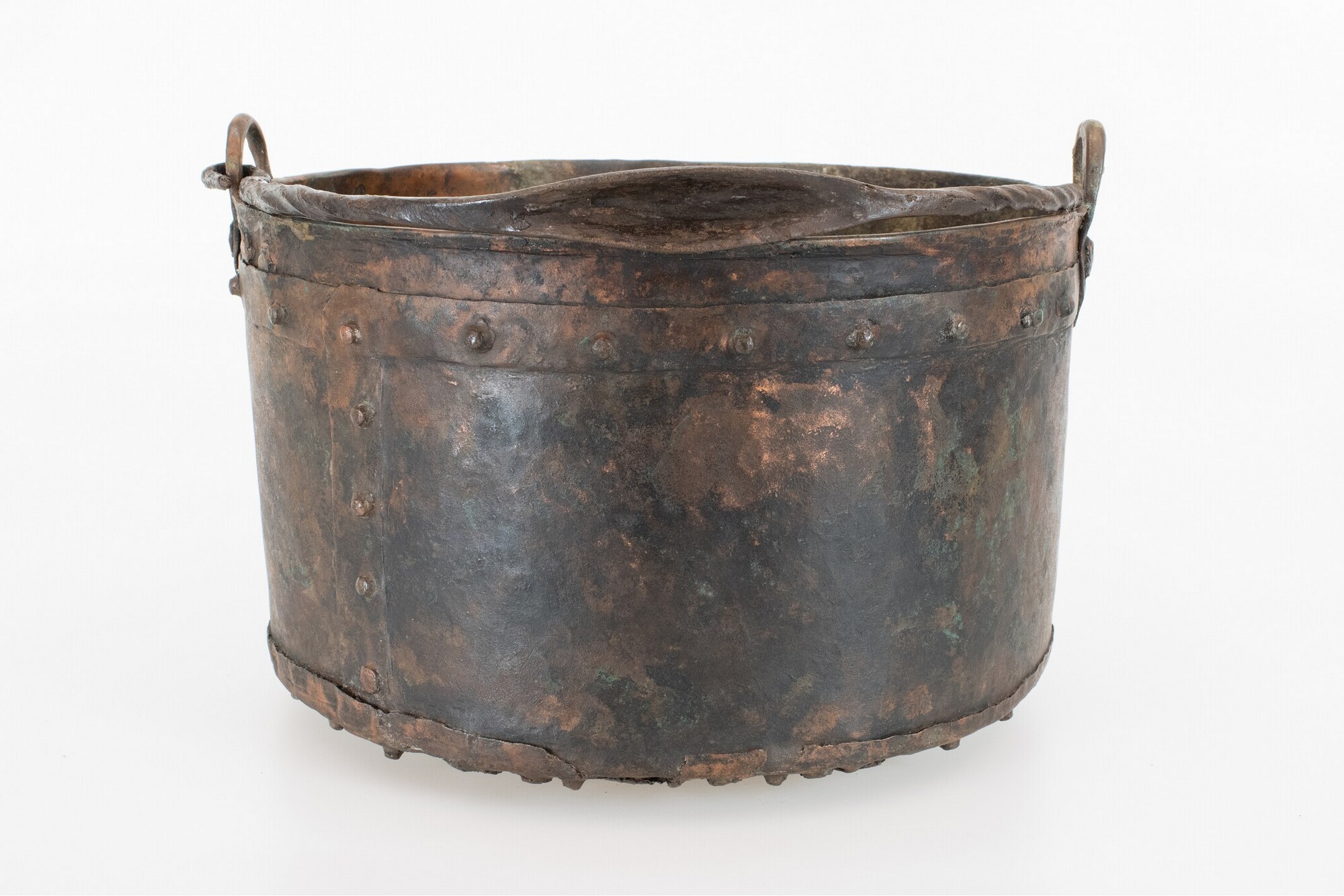 Ketel; cilindrisch op een platte bodem; zowel de hangoren als de messing band zijn met koperen en messing (holle) klinknagels bevestigd. Reparatie in de bodem met een koperplaat (lekstop). Het hengsel is getordeerd met een verbrede handgreep in het midden