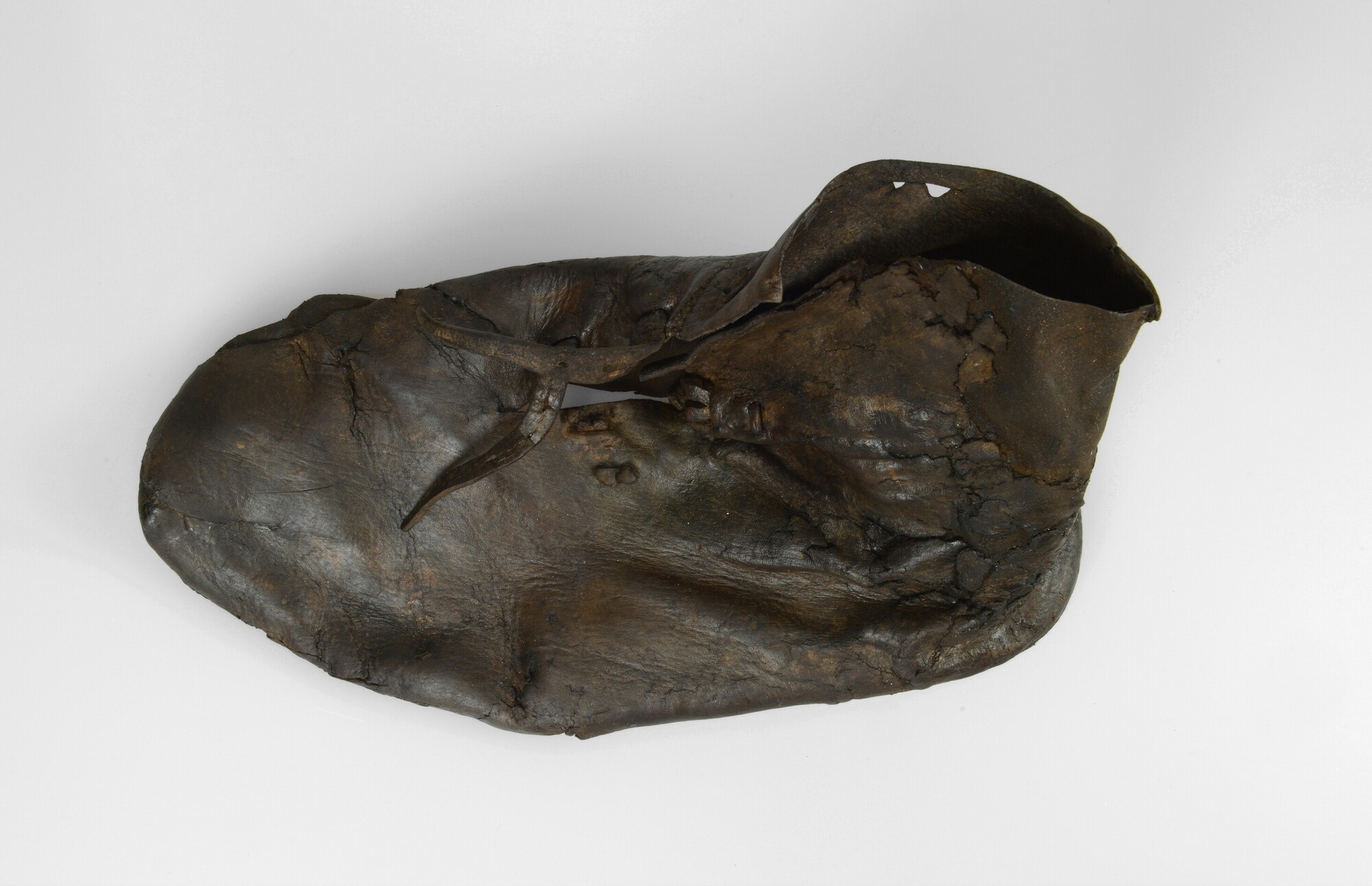 Schoen; Goubitz type 2; hoog opstaande enkelschoen; sluiting met permanente gesp (gesp ontbreekt); twee riempjes met daarin duidelijke gaten; de zool is gefragmenteerd bewaard gebleven en niet gerestaureerd
