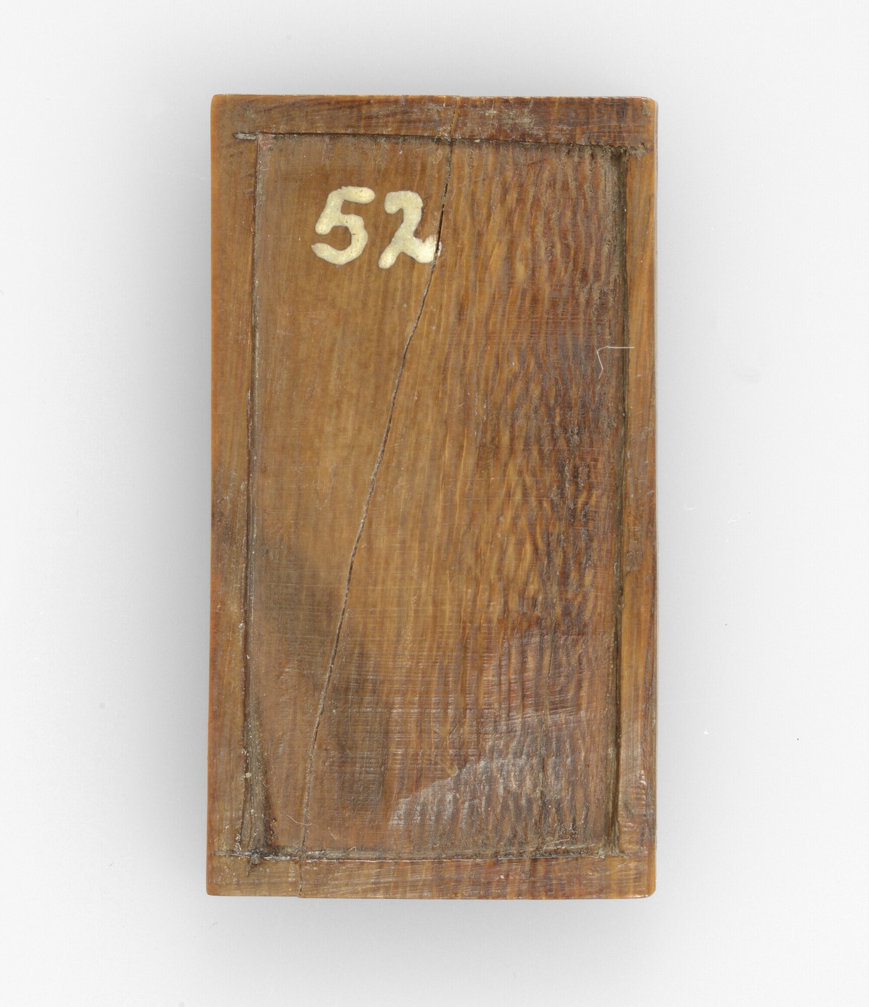 Paneel; mogelijk onderdeel reisaltaar; reliëfvoorstelling van een Augustijner kanunnik met twee bijbels binnen een gewelf in gotische stijl; vondstomstandigheden: gevonden aan de oostkant van het eiland, vondstdatum: 03-09-1935