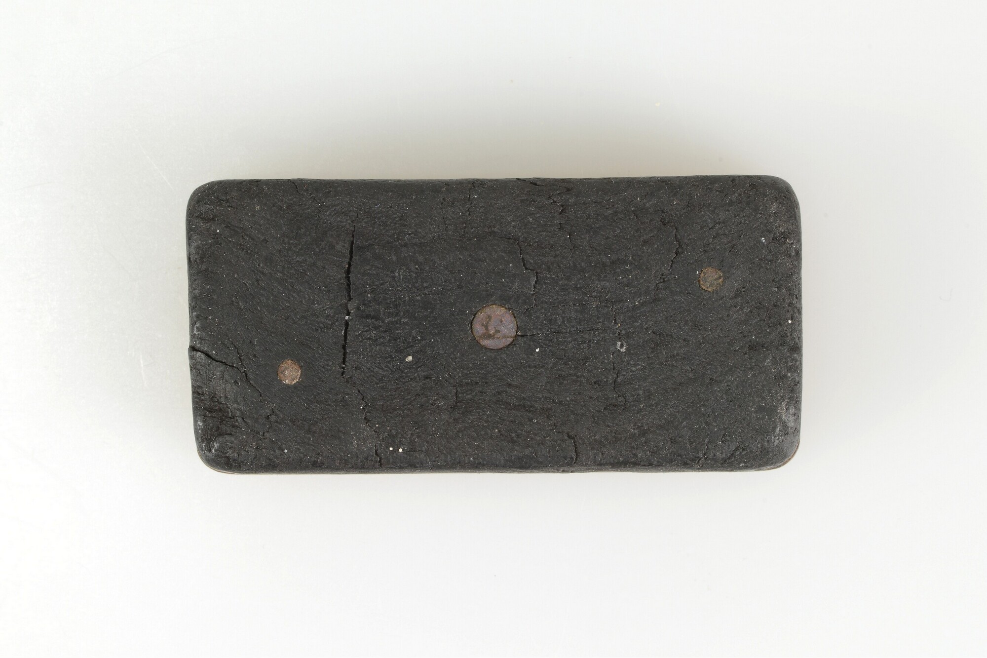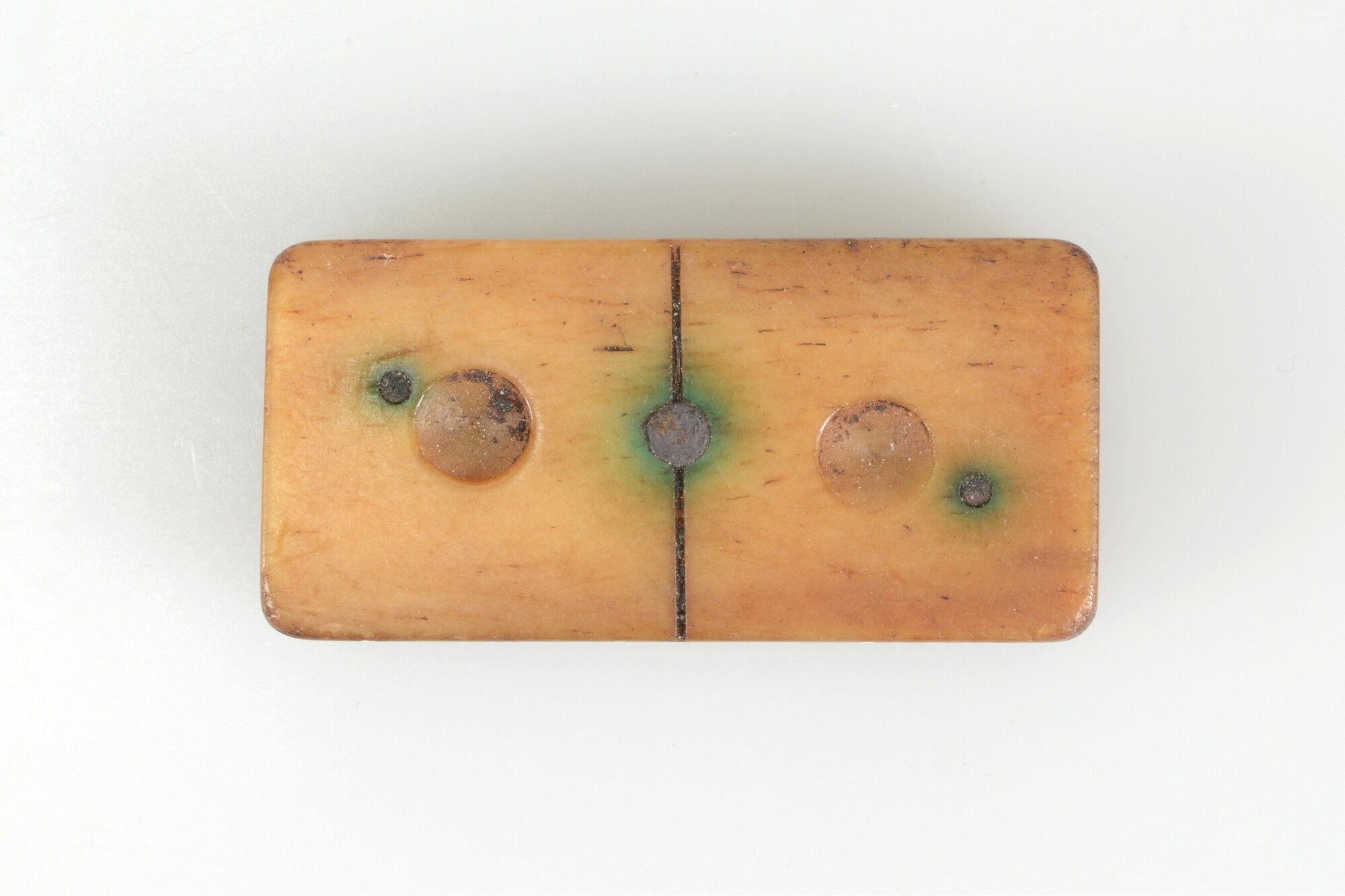 Dominosteen; rechthoekig met aan beide kanten één stip; het bovenstuk van been is met drie nagels bevestigd aan het onderstuk van hout