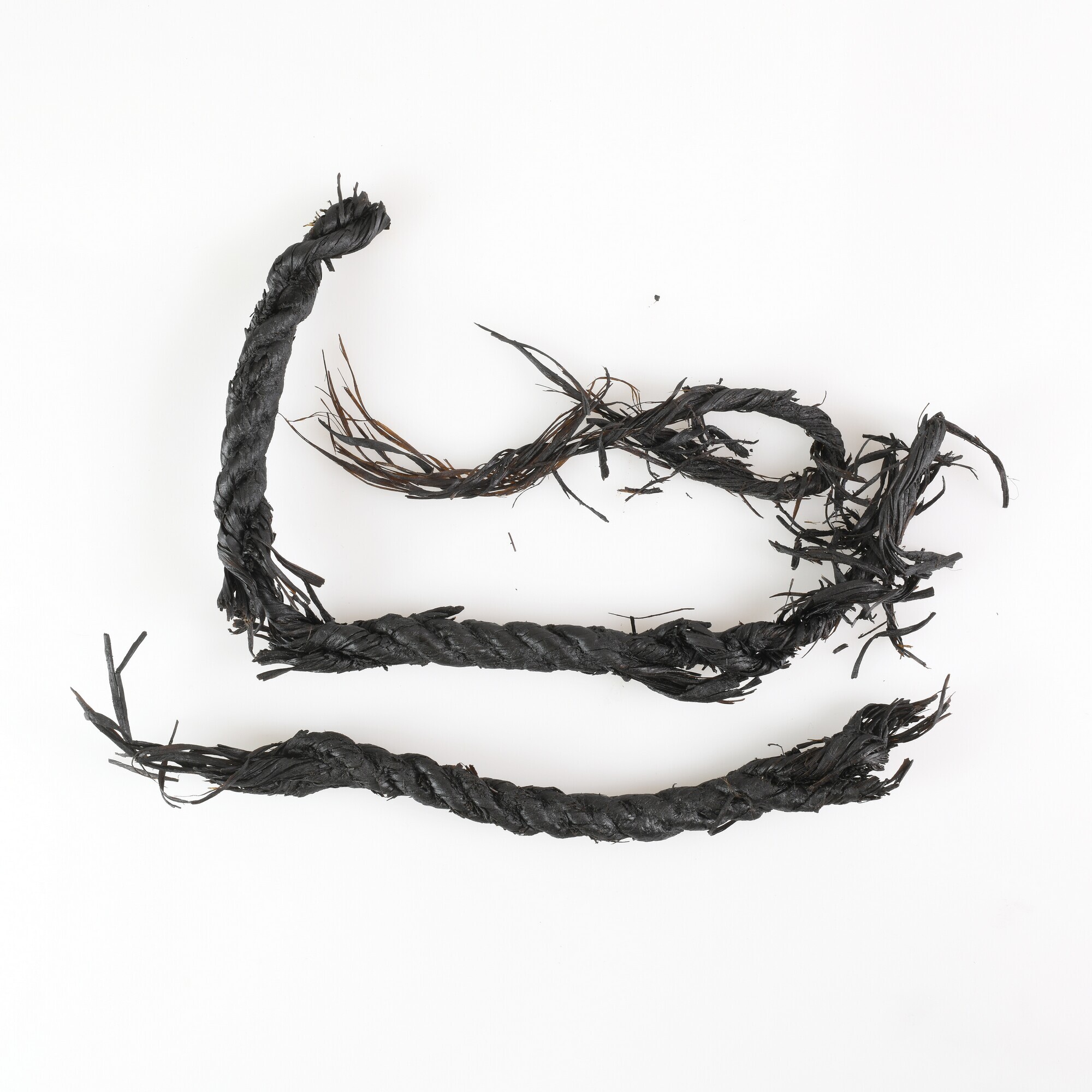 Touw; twee fragmenten gevlochten touw van hennep of vlas