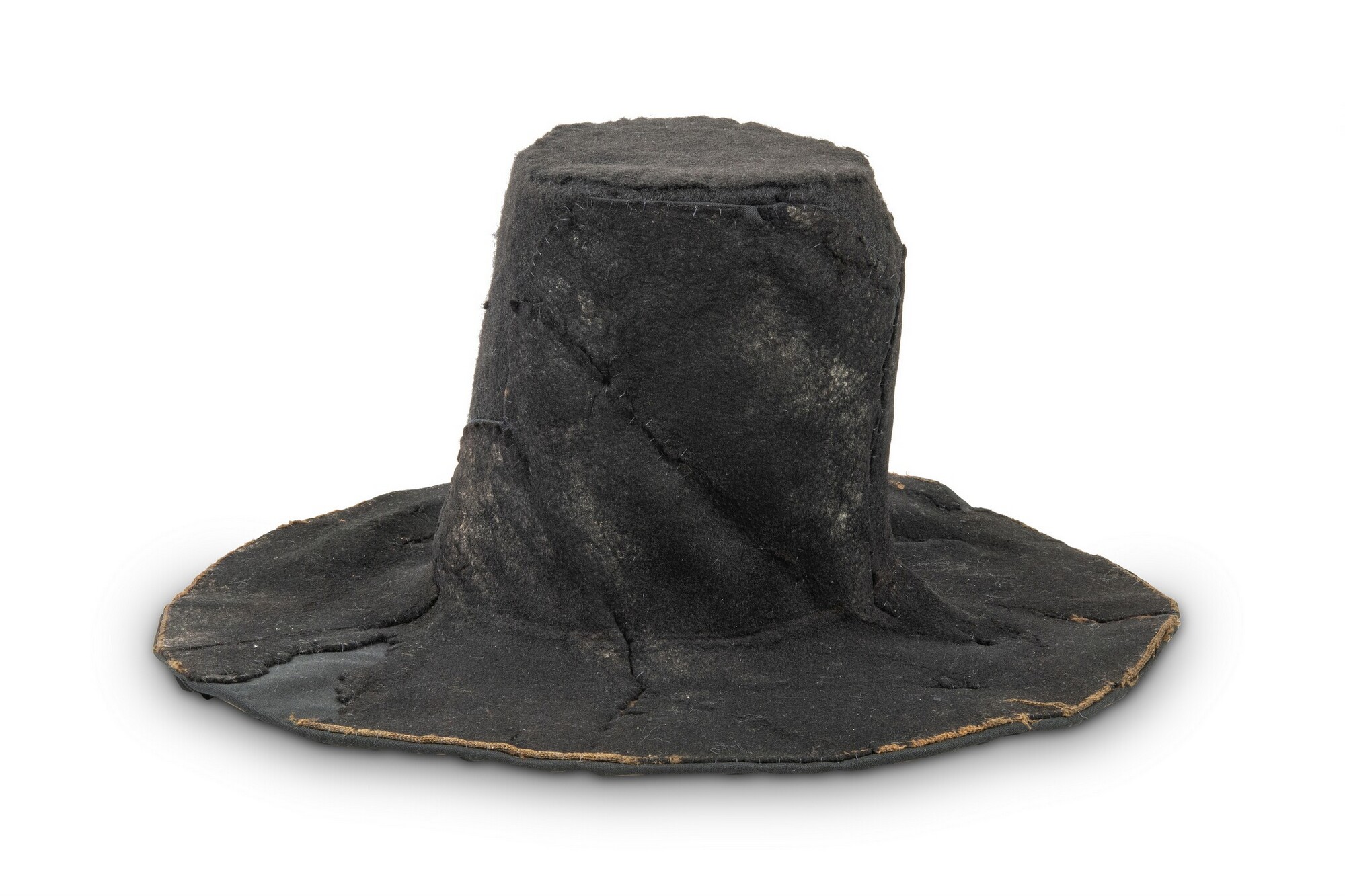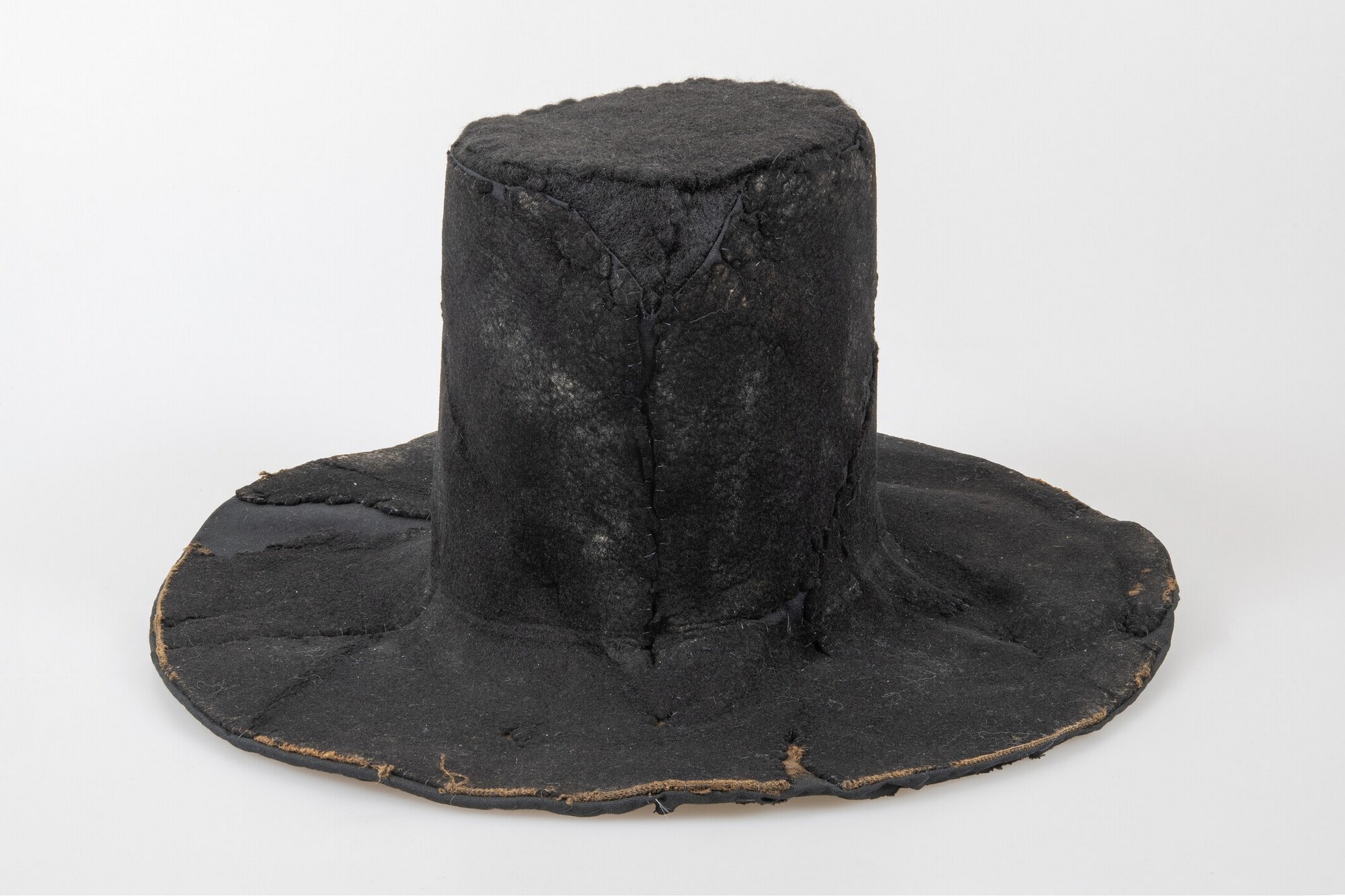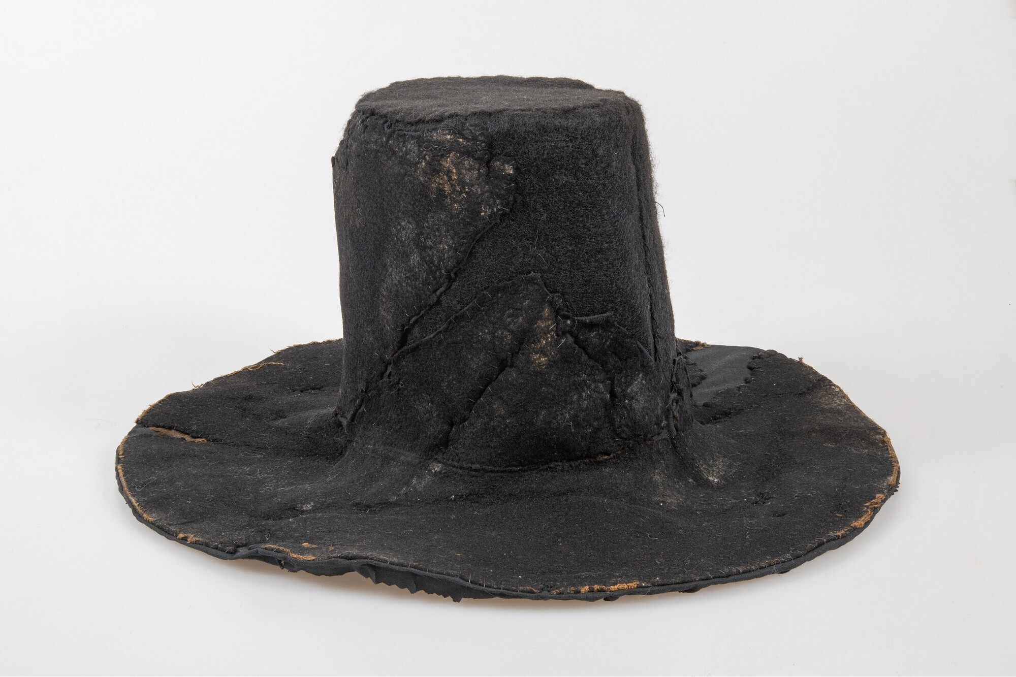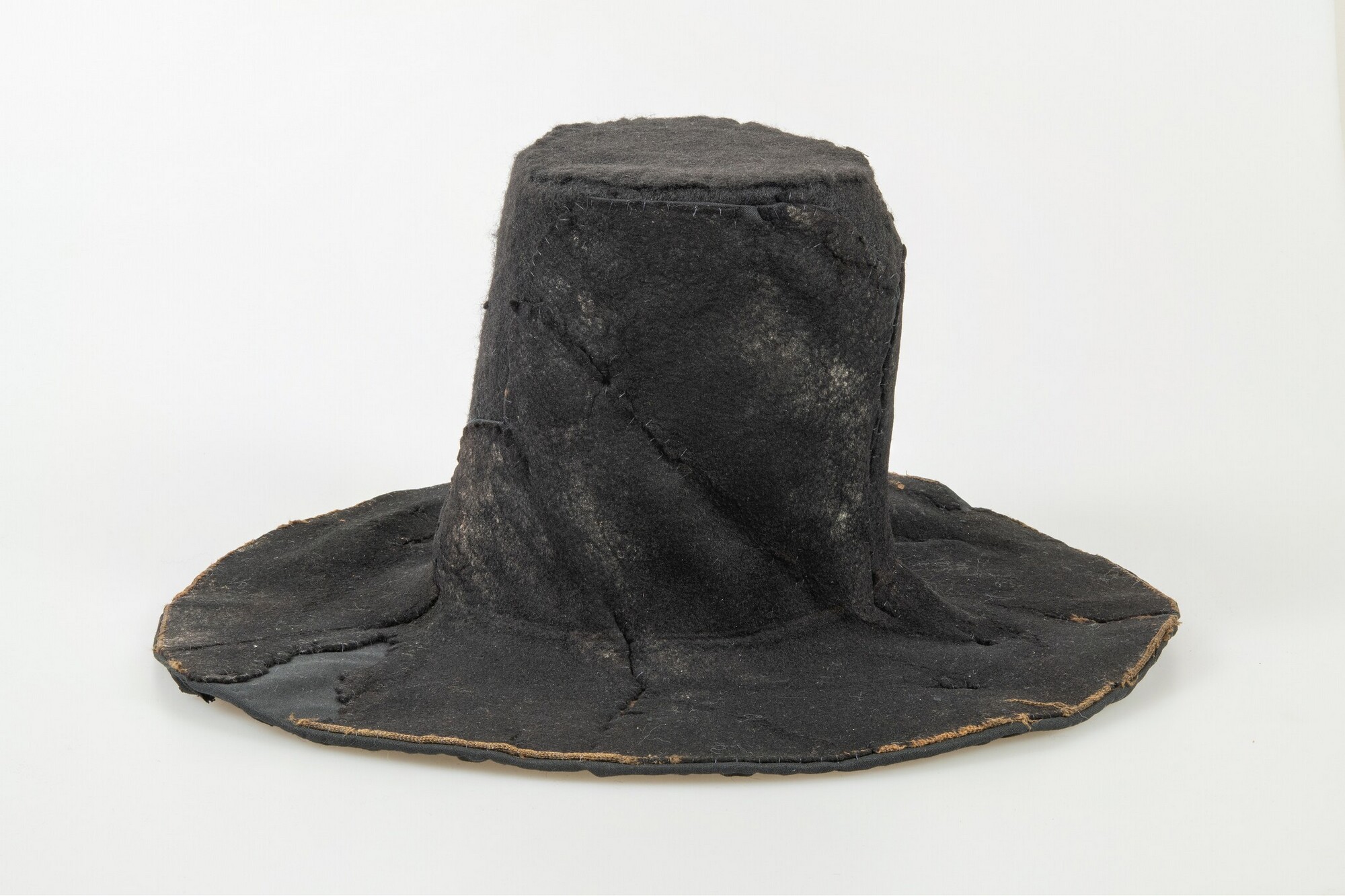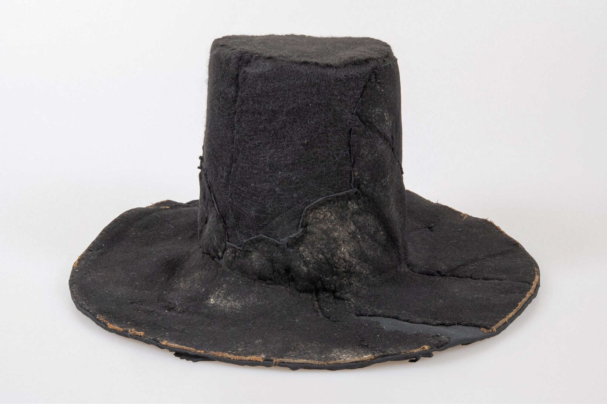 Vilten hoed met resten van een zijden voering in de binnenzijde. In de stof een afdruk van een hoedenlint