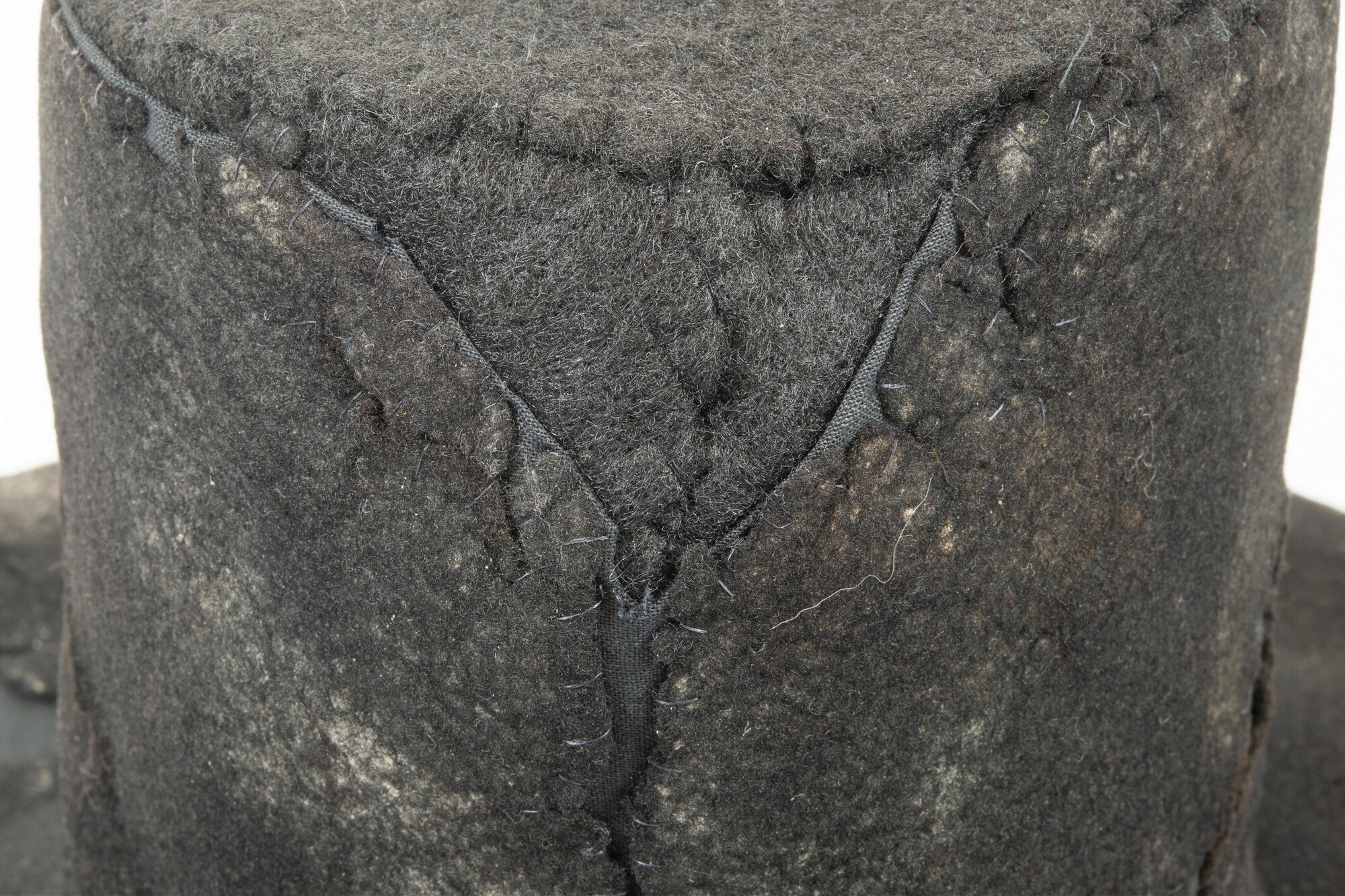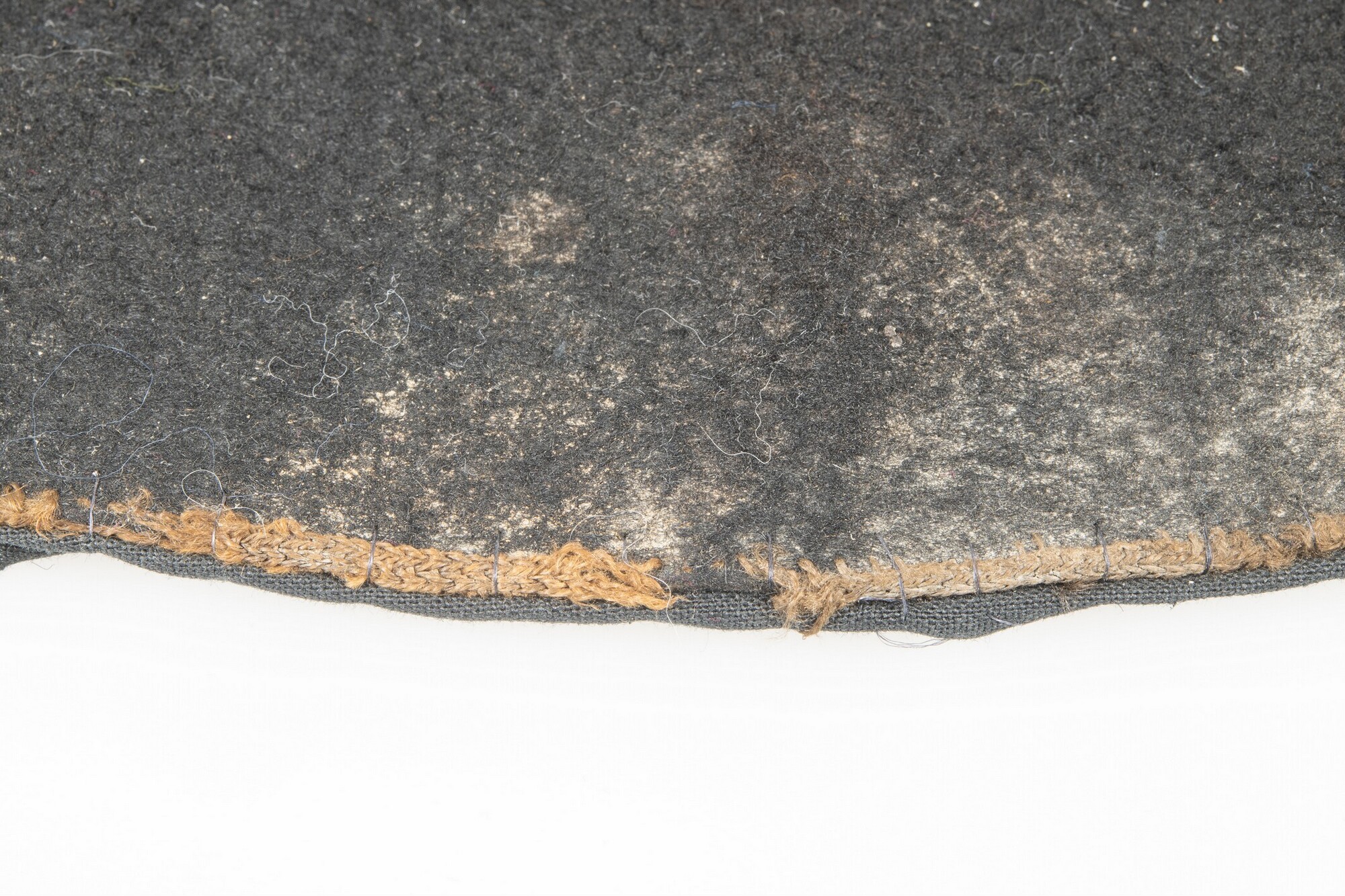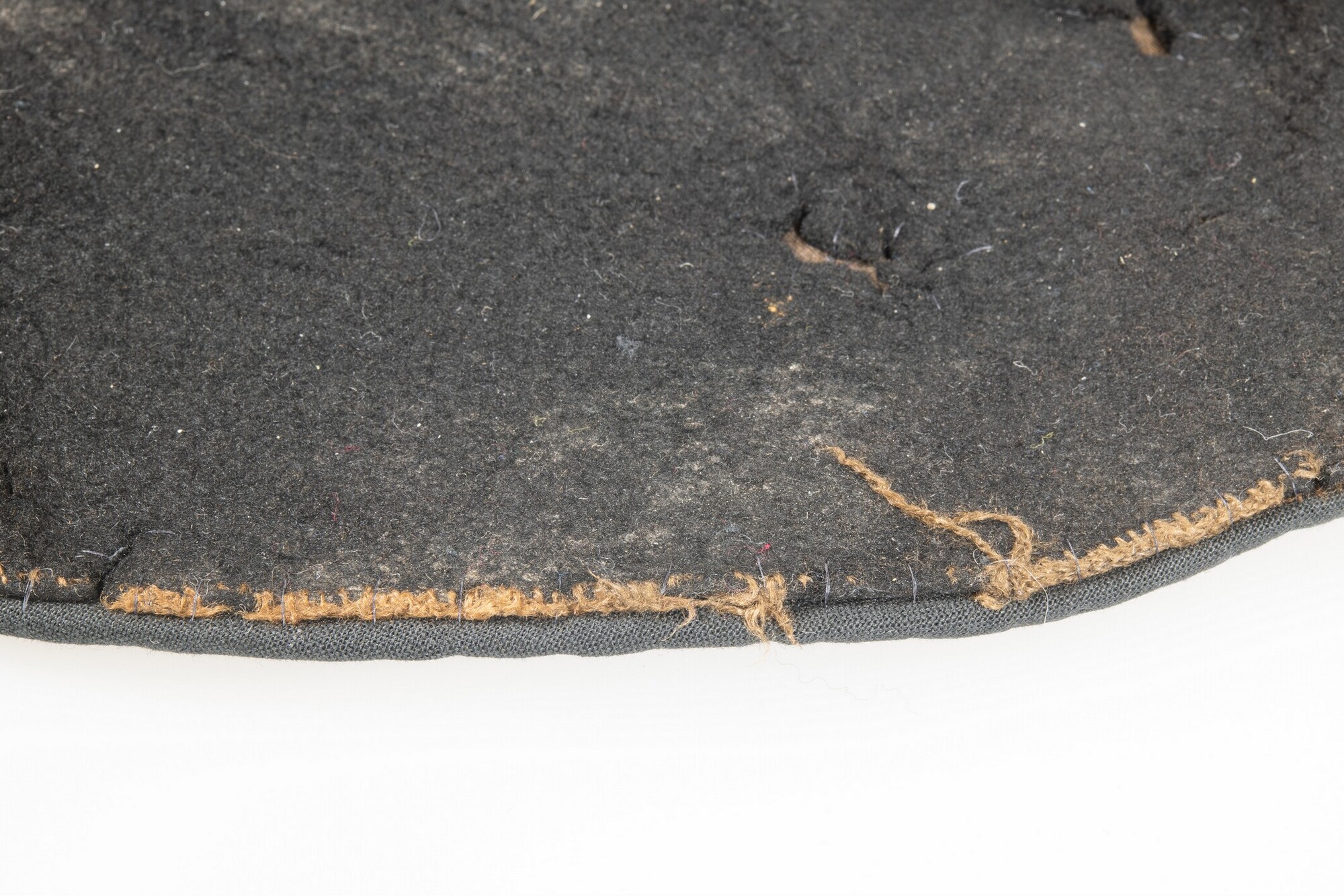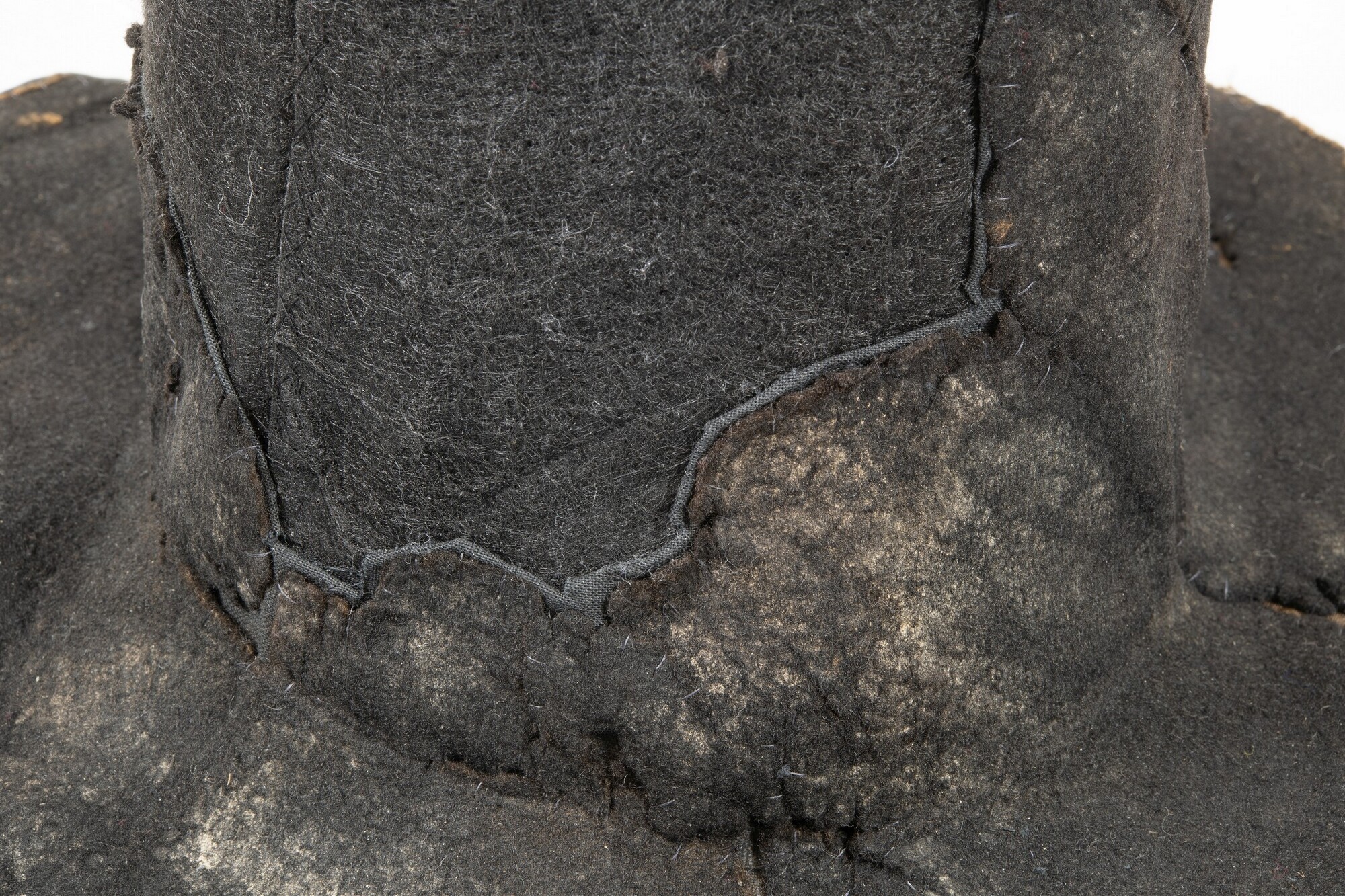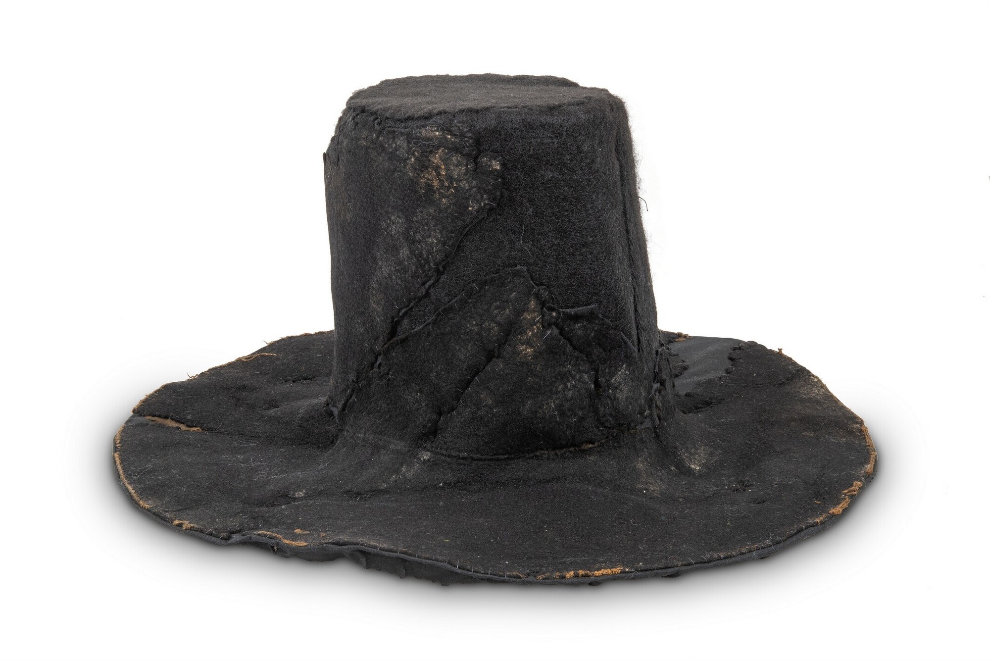 Vilten hoed met resten van een zijden voering in de binnenzijde. In de stof een afdruk van een hoedenlint