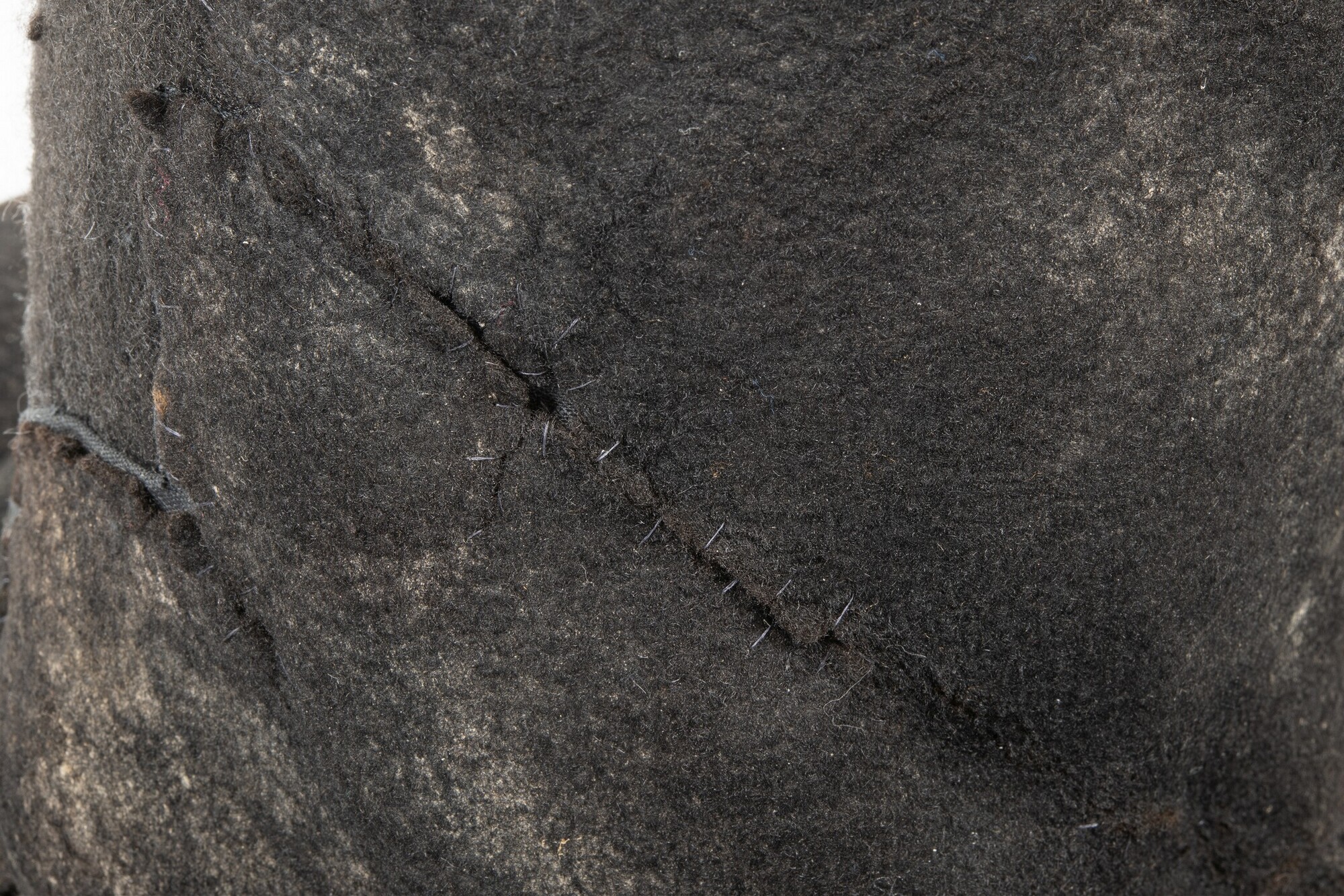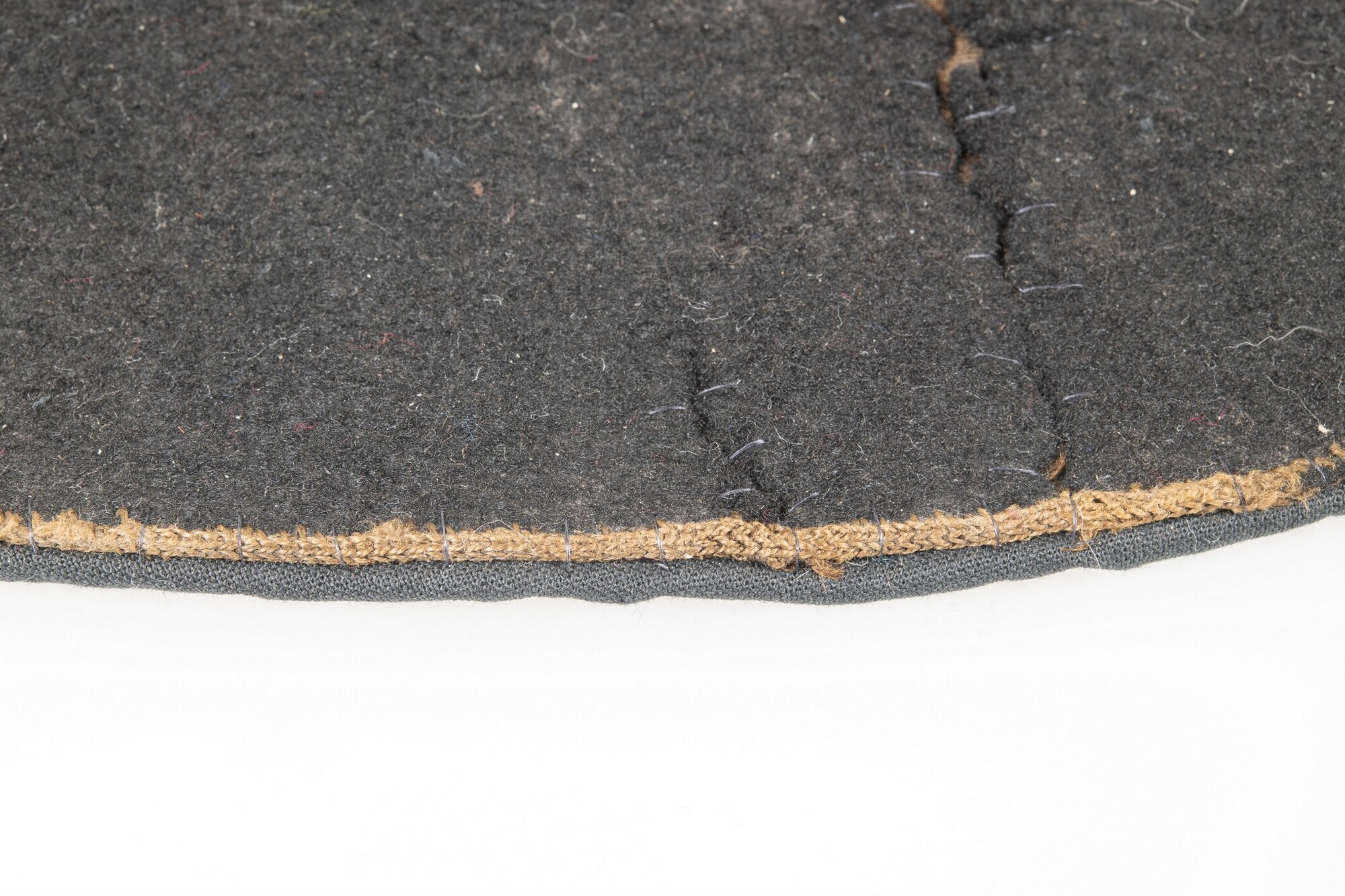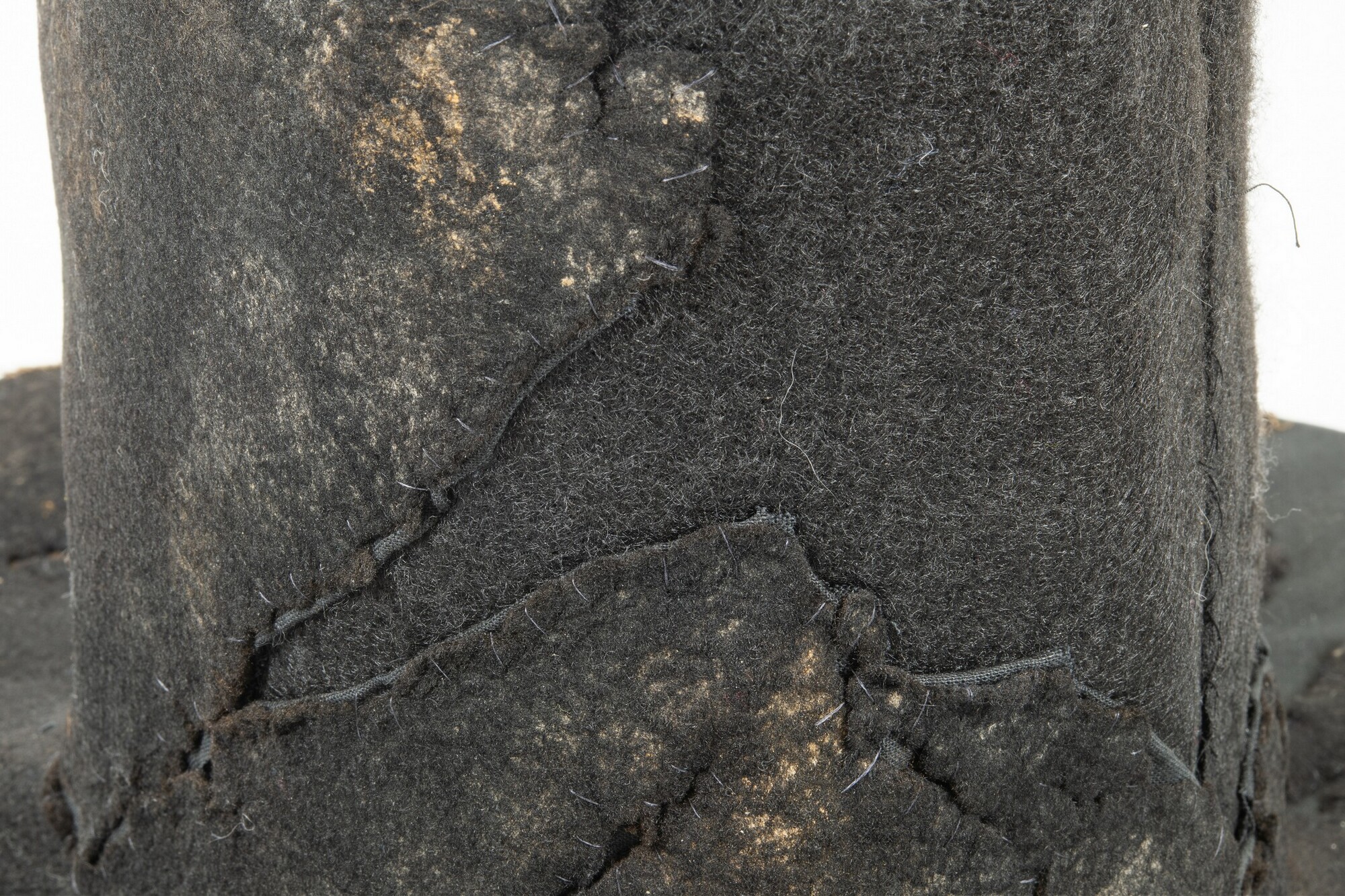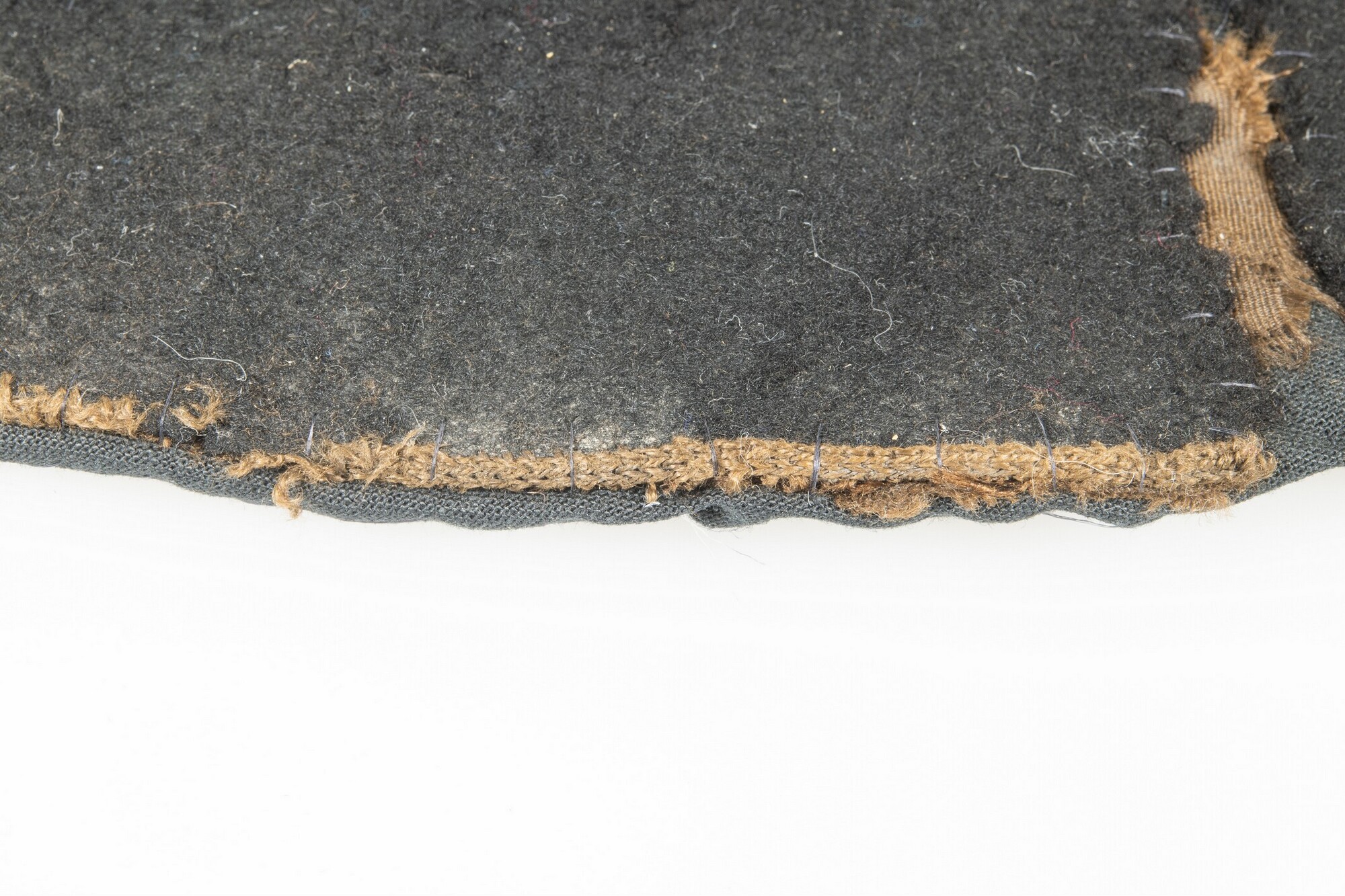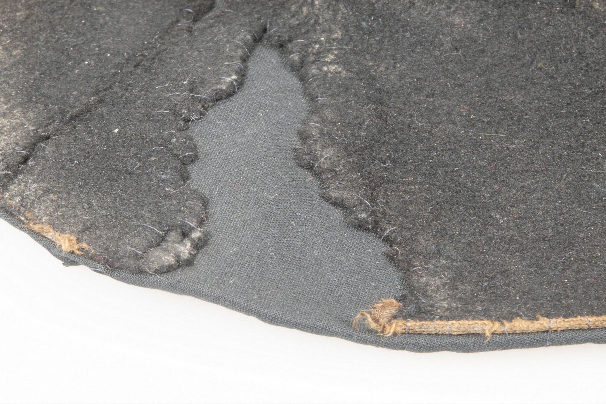 Vilten hoed met resten van een zijden voering in de binnenzijde. In de stof een afdruk van een hoedenlint