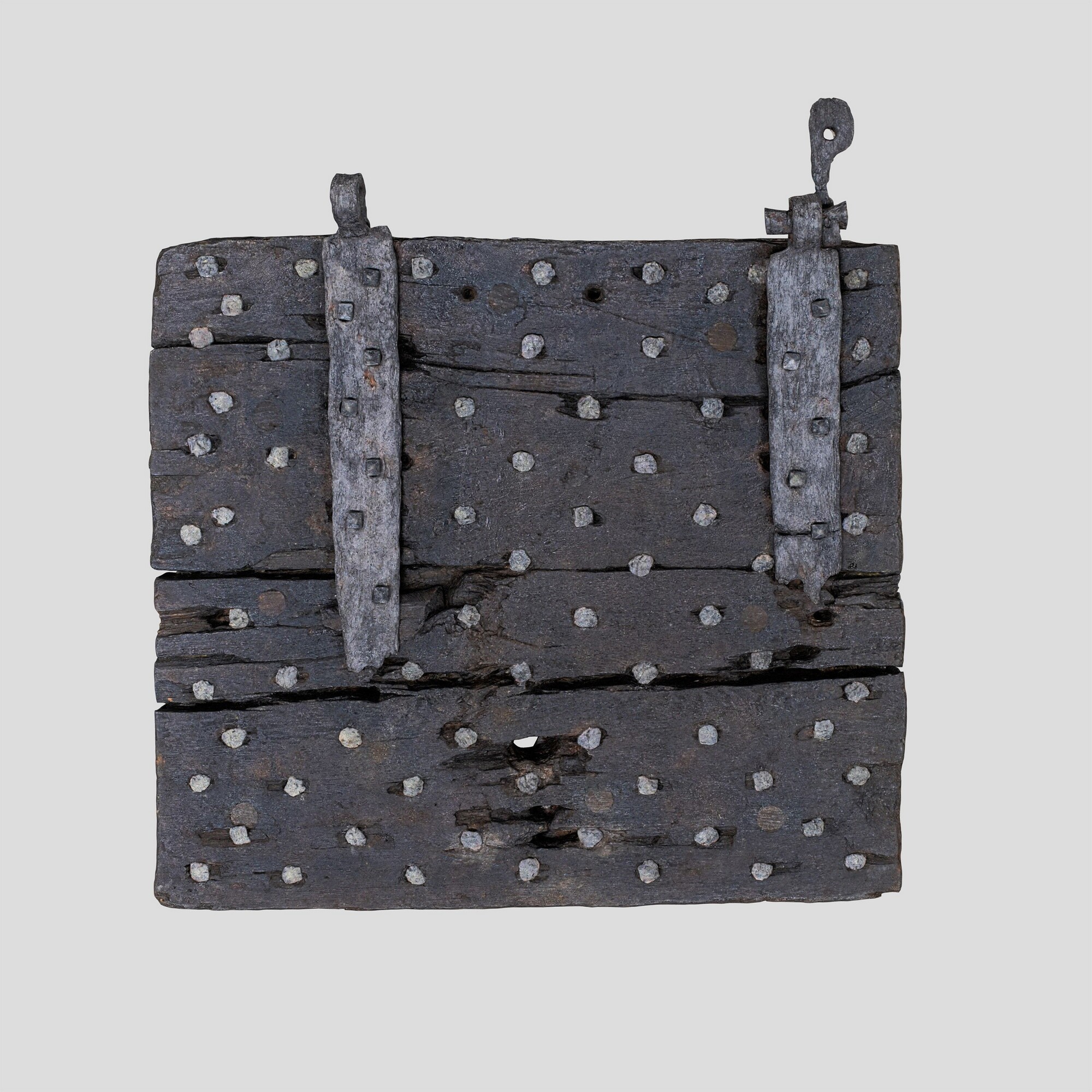 Luik; laadpoort. Het luik is bijna vierkant, namelijk 68 bij 63 cm, maar wel enigszins trapeziumvormig: aan de ene kant is hij 68 cm groot, aan de andere kant 64 cm. Het object is gemaakt van twee lagen eikenhouten planken die haaks op elkaar zijn bevestigd met veel ijzeren nagels die systematisch over het hele ...