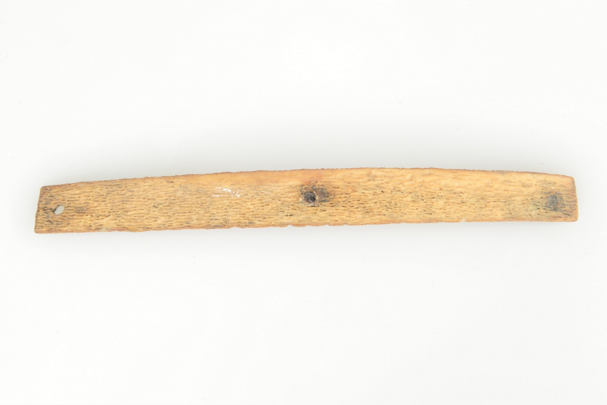 Kam; incompleet (één helft); drie gaatjes om te verbinden met de ontbrekende helft, met resten van ijzer; inkervingen aan de randen