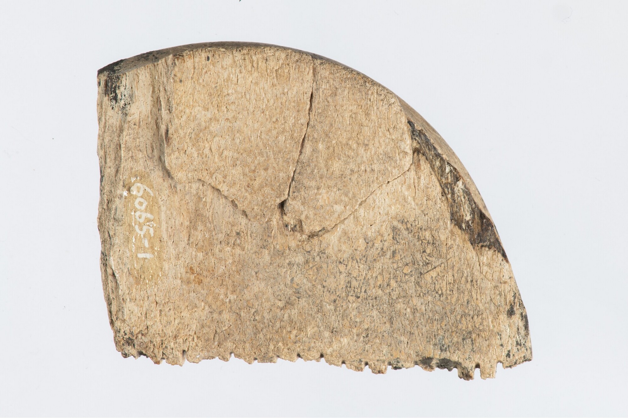 Kam; fragment, circa 2/3 compleet; tanden ontbreken; boogvormig; uitzonderlijk gedecoreerd met langs de rand een bandversiering en op de onderrand lijn- en ruitversiering; voorzijde gepolijst en keerzijde onbewerkt; vervaardigd uit schouderblad; 3 verlijmde fragmenten