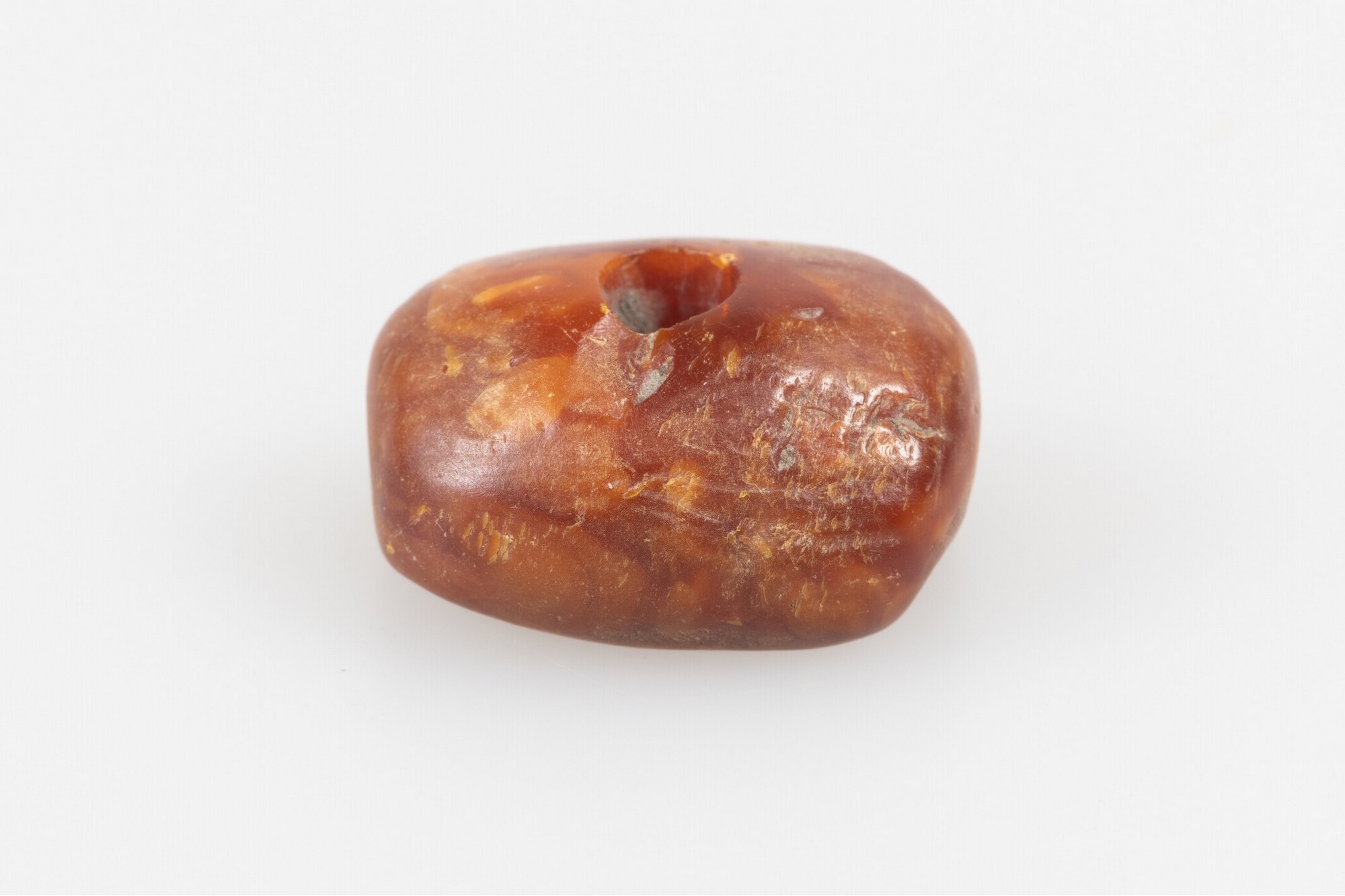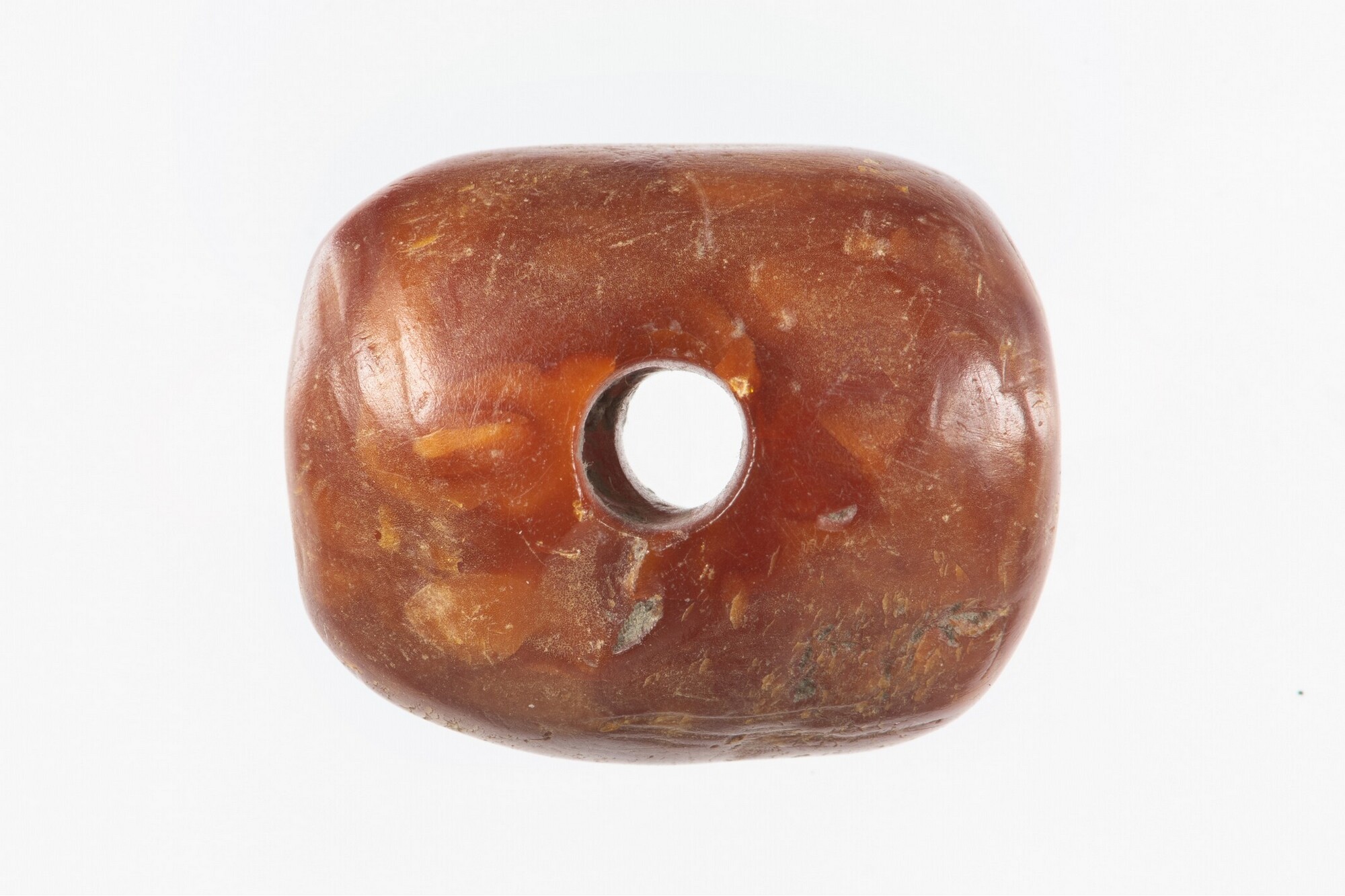 Kraal; vierkante kraal met doorboring in het midden, afgesleten zijkanten; vondstomstandigheden: greppel F1