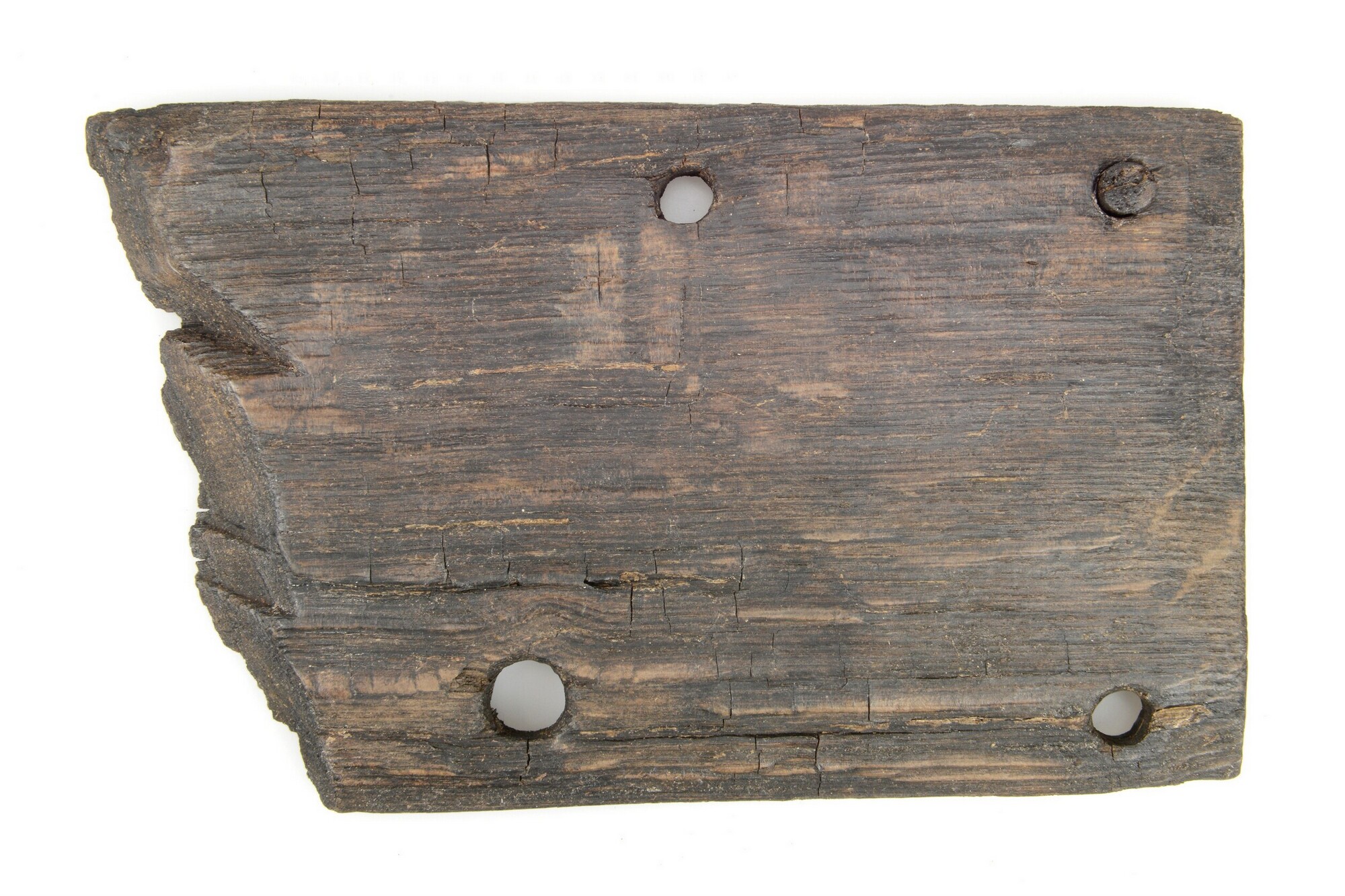 Huidplank vaartuig; secundair gebruikt in waterput 61; rechthoekig met vier verbindingsgaten waarbij in een de eikenhouten gaten de deuvel aanwezig is; tussen de moslatten werd breeuwsel aangetroffen (inventarisnummer 6068-10)