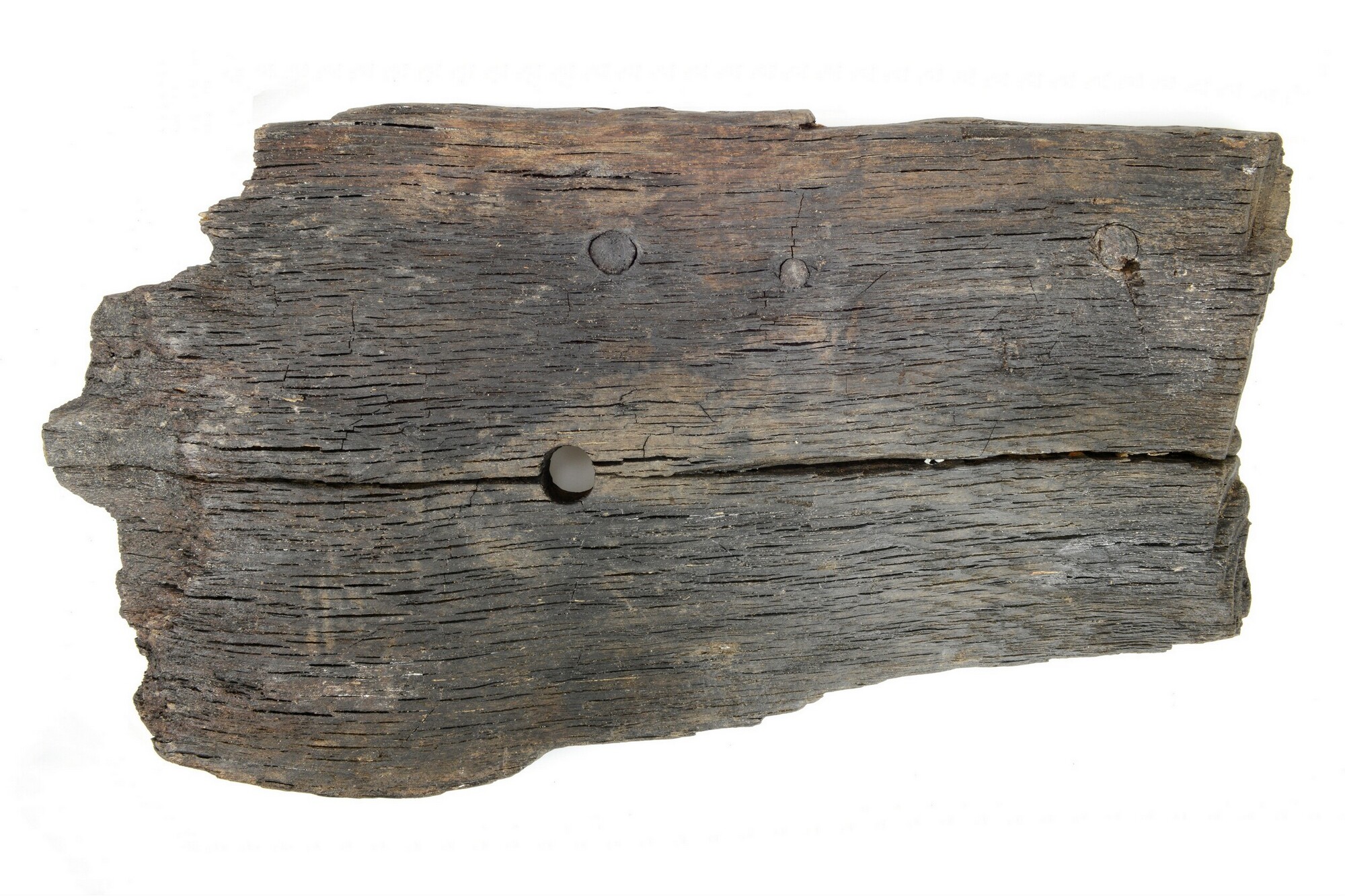 Huidplank vaartuig; secundair gebruikt in waterput 61; rechthoekig met vier verbindingsgaten waarbij in één gat de eikenhouten deuvel aanwezig is
