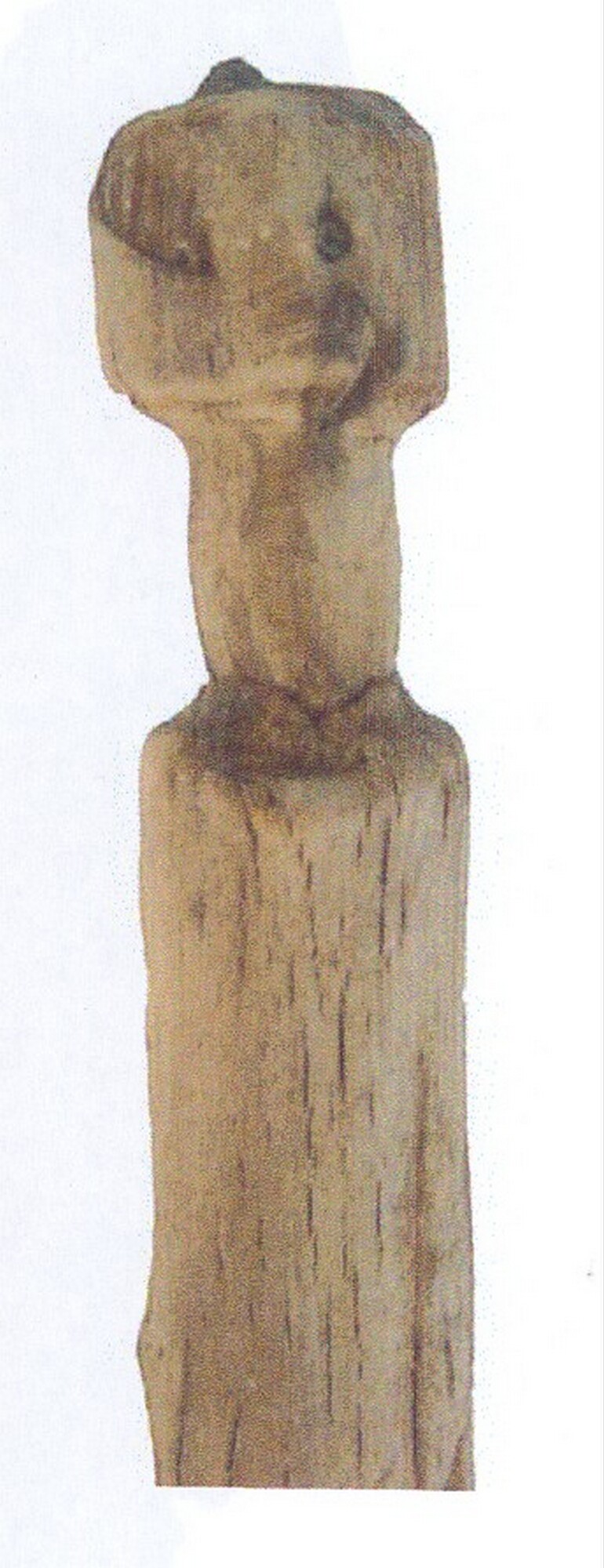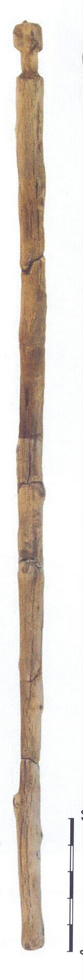 Stok, bewerkt; kornoelje; aan 1 zijde een uitgesneden versmalling van 2 cm breed waardoor de stok een aan één kant een soort knop krijgt; aan de andere zijde is de stok recht afgesneden