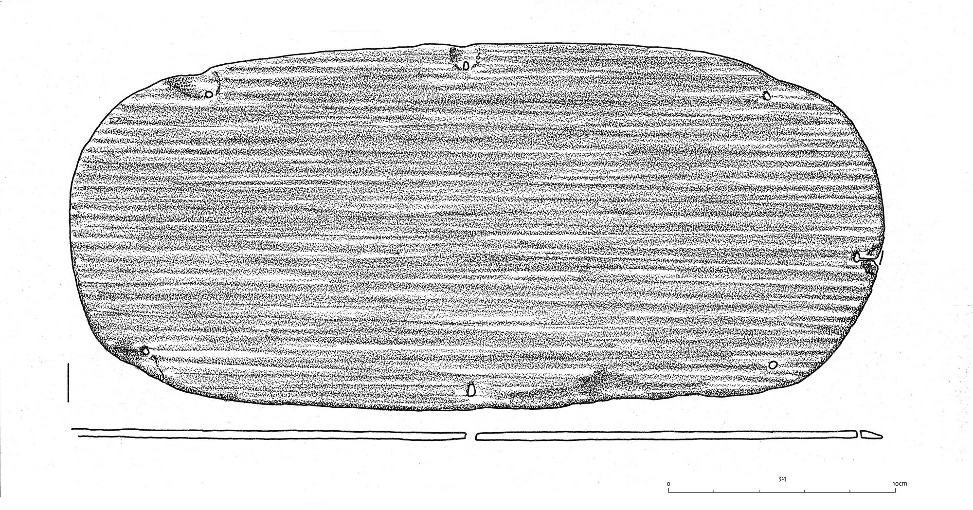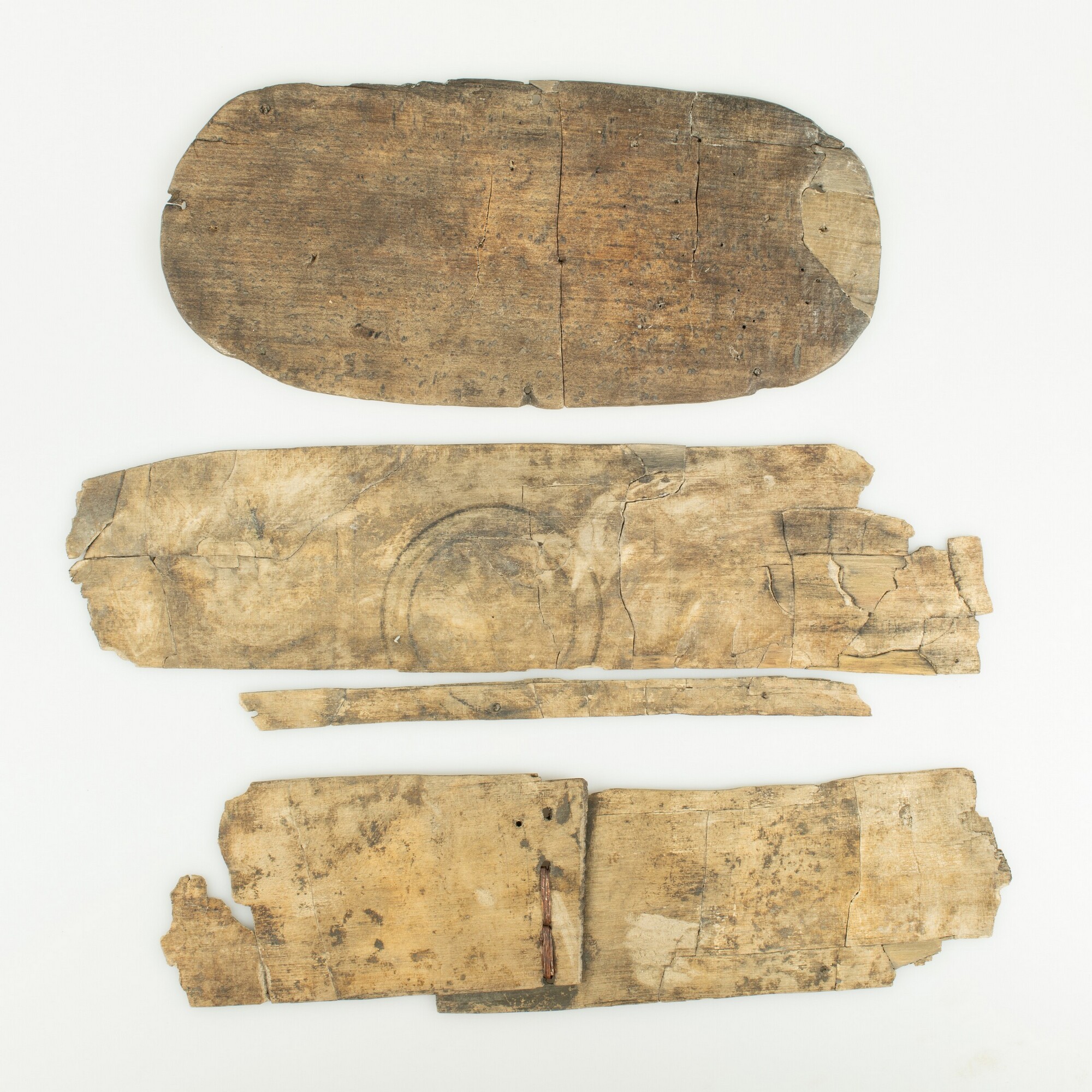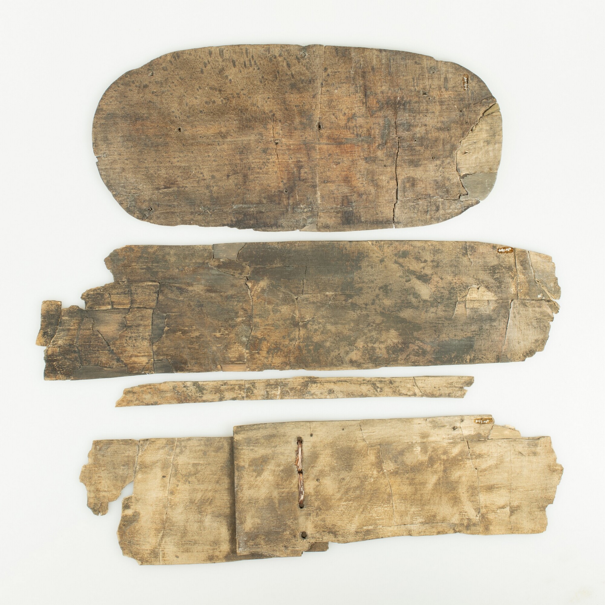 Spaandoos; fragmenten van een ovale spaandoos. De wand- en bodemplaat zijn tangentiaal uit stamhout gesneden, waarbij waarschijnlijk van een trekmes gebruik is gemaakt. De bodemplaat is compleet bewaard, samen met drie grote fragmenten van de oorspronkelijk uit één dunne plaat vervaardigde, in een ovaal rondgebogen wand. Op de uiteinden van de wandplaat bevinden zich vier ...