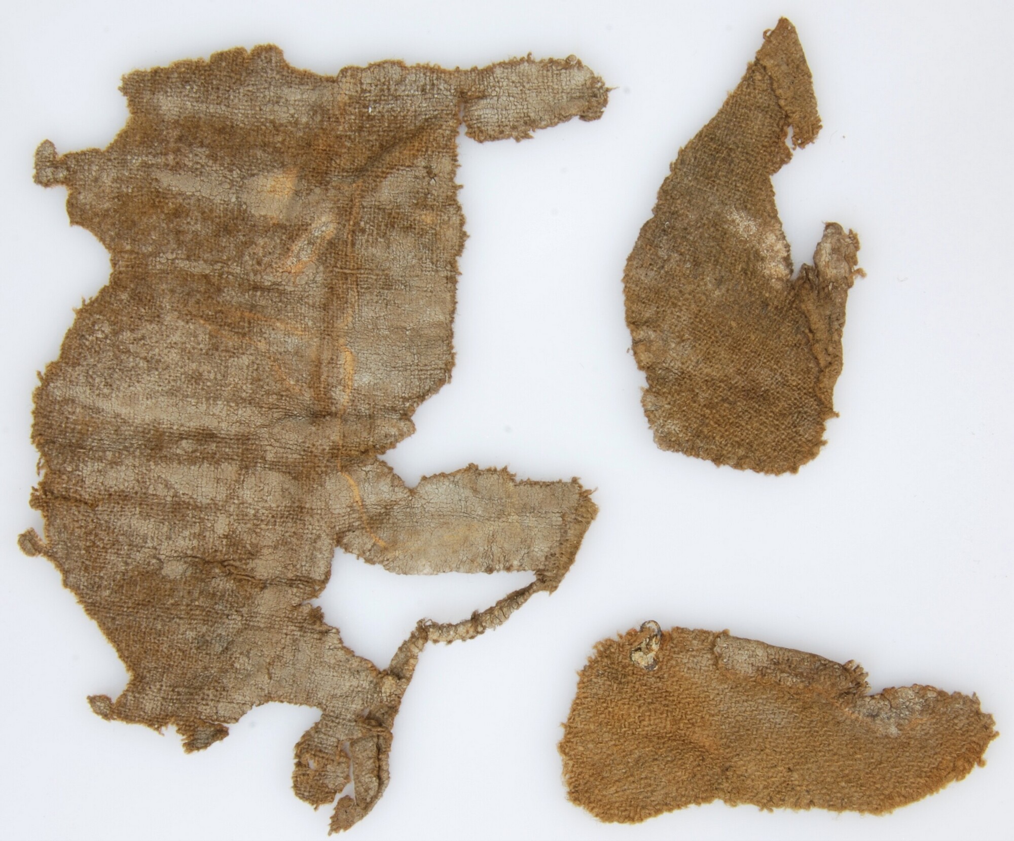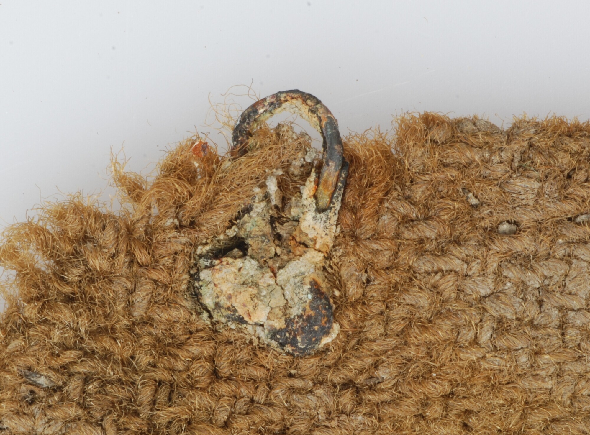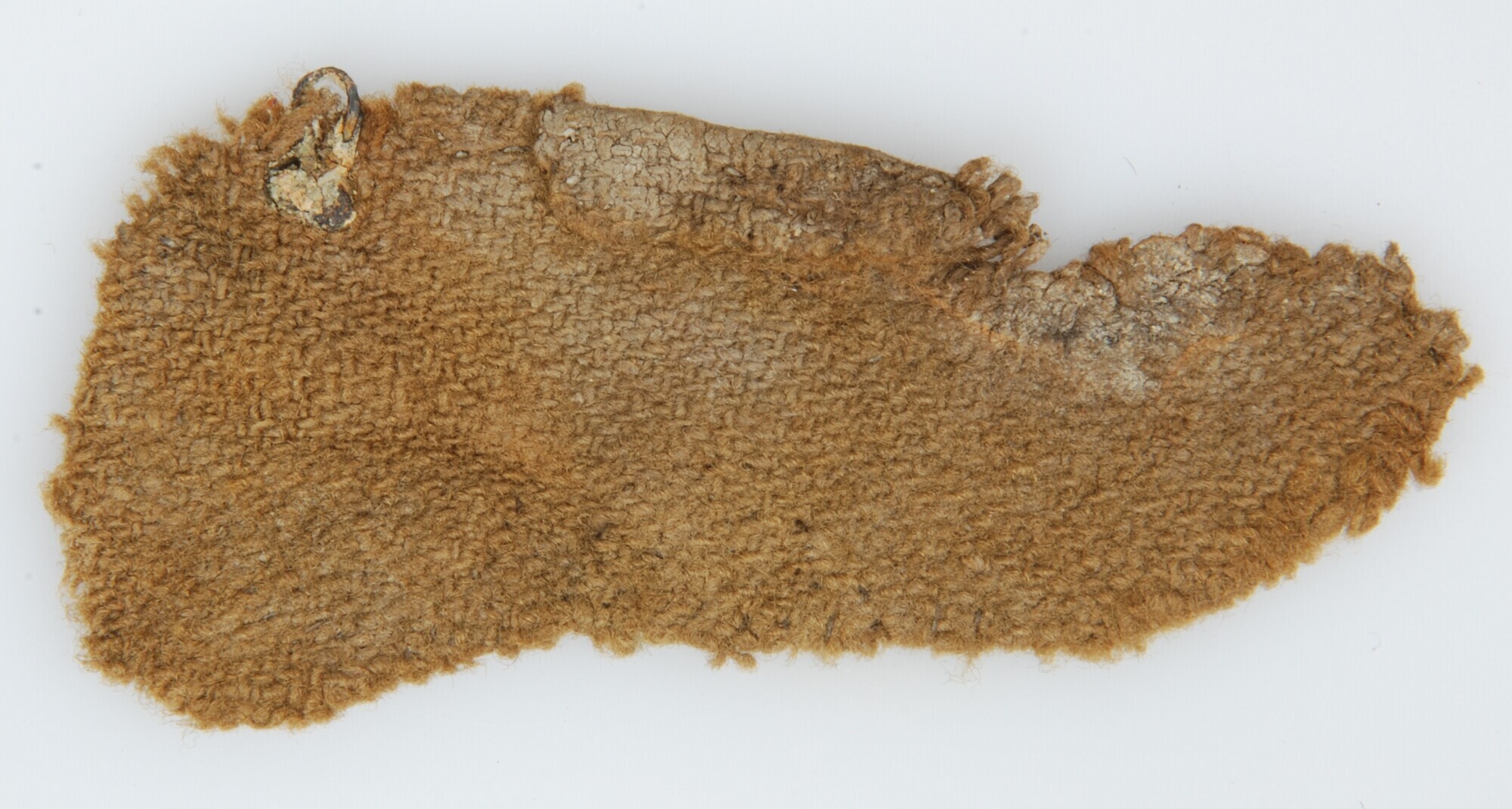 Kleding (onderdeel); kruiskeper binding; deze binding komt niet vaak voor; de aanwezigheid van een groen geoxideerd kledinghaakje aan de binnenkant van dit weefselfragment doet vermoeden dat dit fragment afkomstig is van een kledingstuk; twee naden