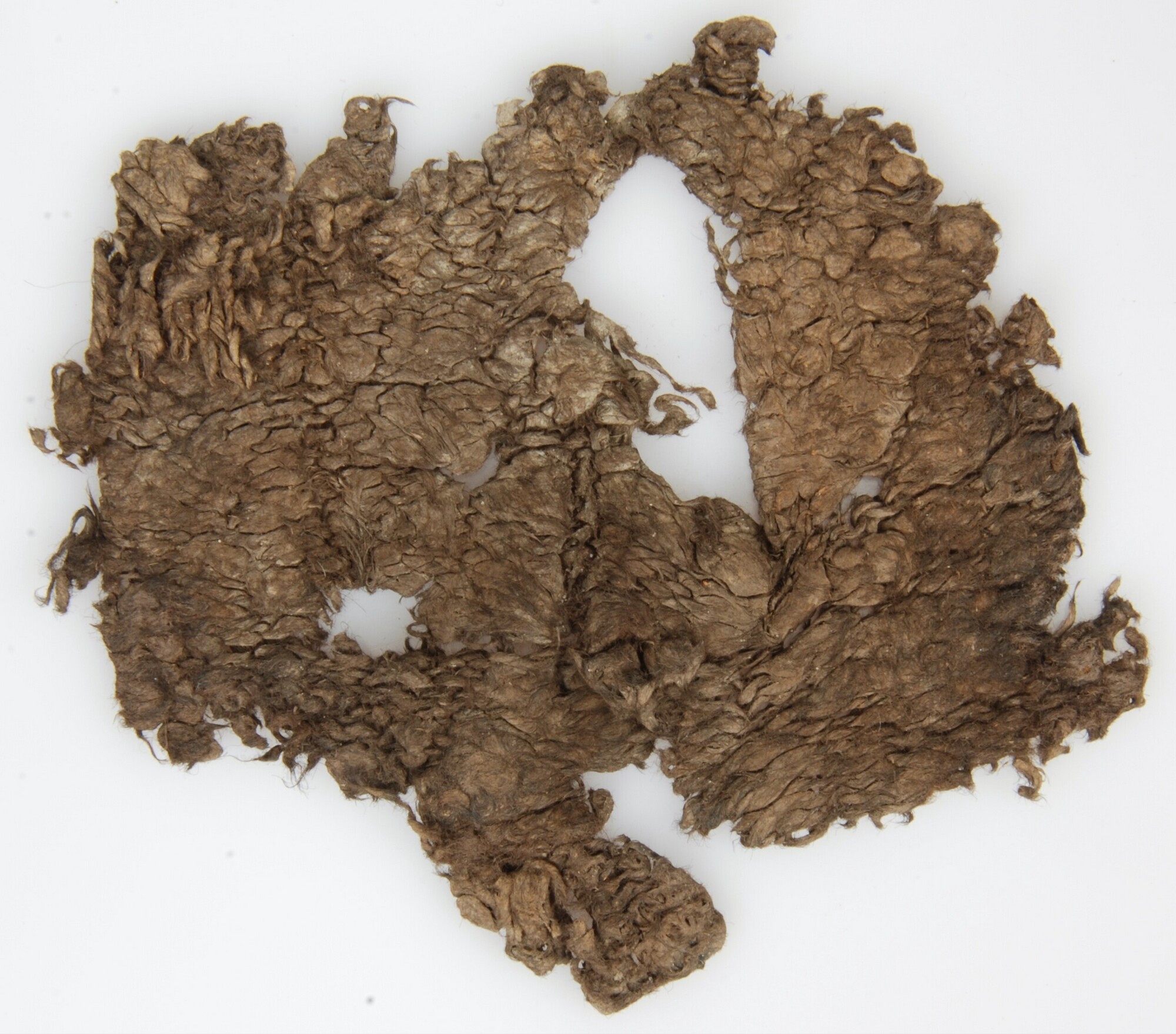 Breiwerk; fragment dat doordrenkt is met pek; grof gebreid in tricotsteek met 20 tot 25 steken per 10 cm en 25 naalden per 10 cm. S (Z,Z)-getwijnd garen gebruikt