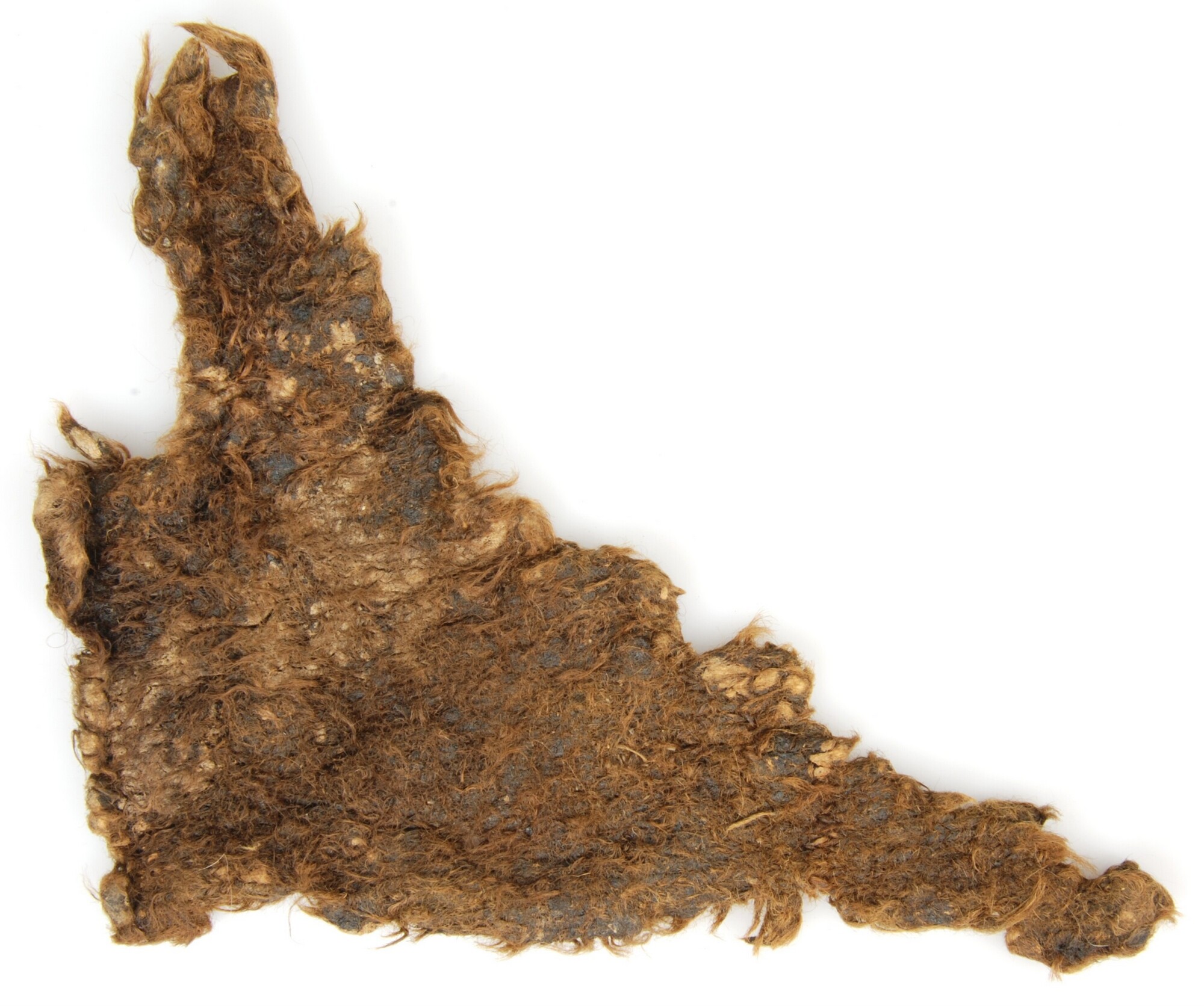 Breiwerk; fragment dat doordrenkt is met pek; grof gebreid in tricotsteek met 20 tot 25 steken per 10 cm en 25 naalden per 10 cm. S (Z,Z)-getwijnd garen gebruikt; mogelijk bevindt zich langs een van de zijden een opzetrand