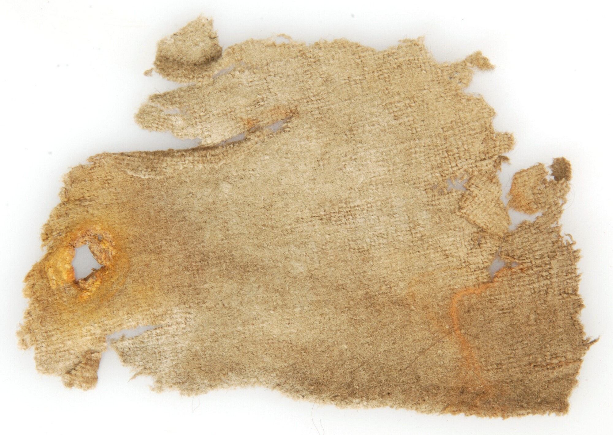Kwast; effenbinding (2x5 matig); rechthoekig fragment van textiel met langs de rand een gat waar de spijker door heen geslagen was; het fragment is sterk vervilt