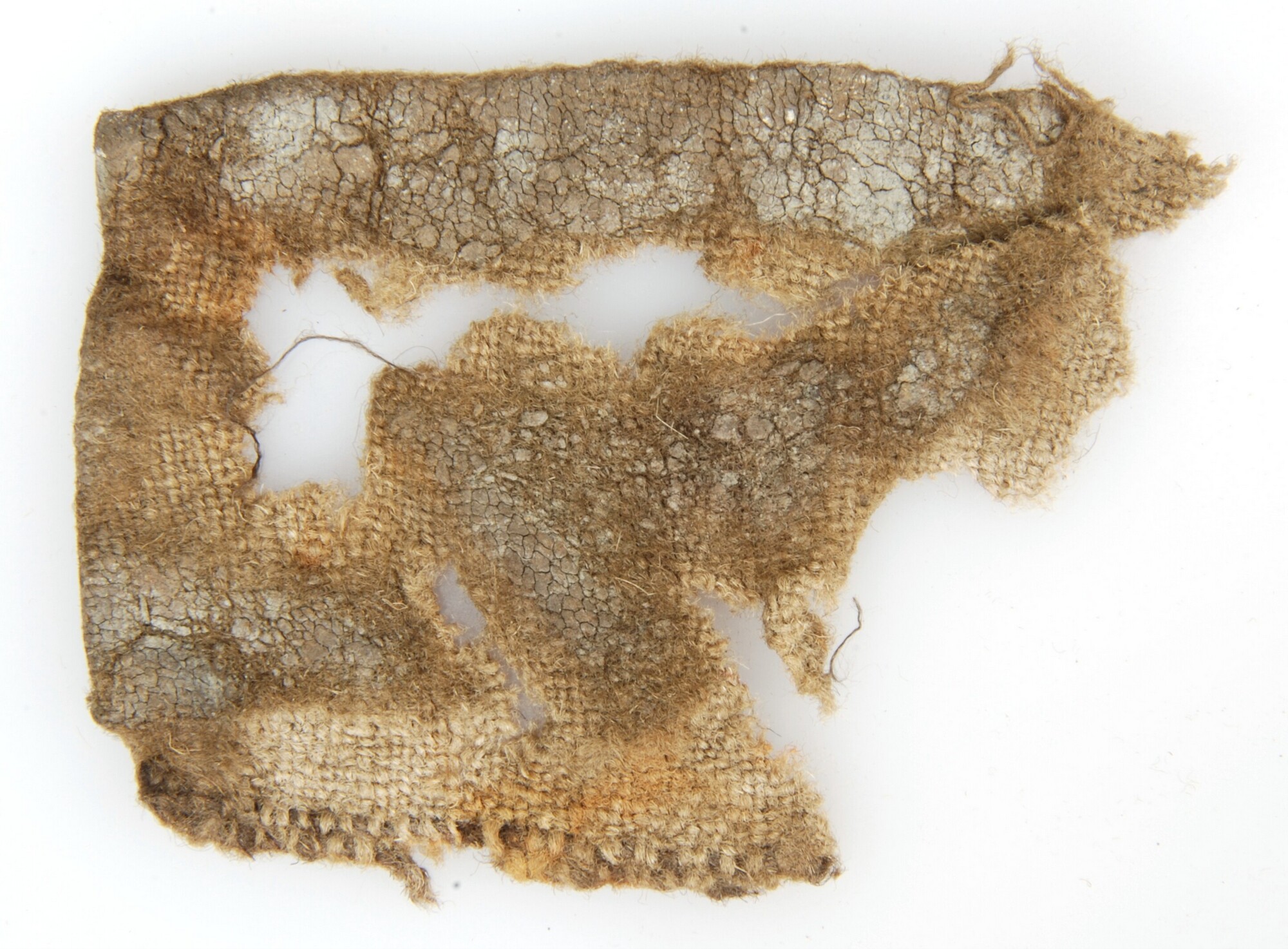 Kwast; effenbinding; voor de versteviging van de zijkant heeft men minimaal twee dikke Z (S,S)- getwijnde draden genomen, waardoor de (beschadigde) zelfkant minimaal 0.4 cm breed is geweest; rechthoekig fragment weefsel dat onderdeel is van kwast; donkerbruin weefsel