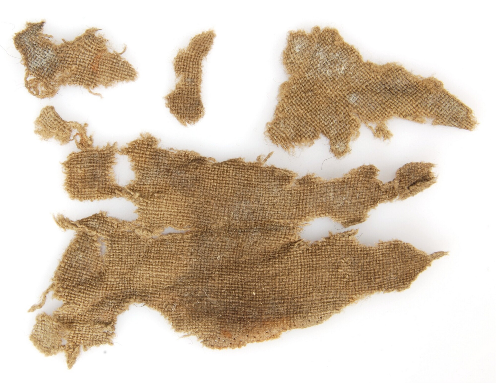 Kwast; effenbinding; dicht, bruin weefsel bestaand uit vijf fragmenten die toebehoren aan een kwast; het grootste fragment heeft één rij naaigaatjes
