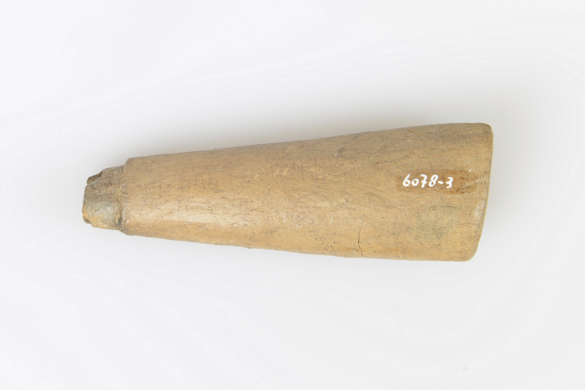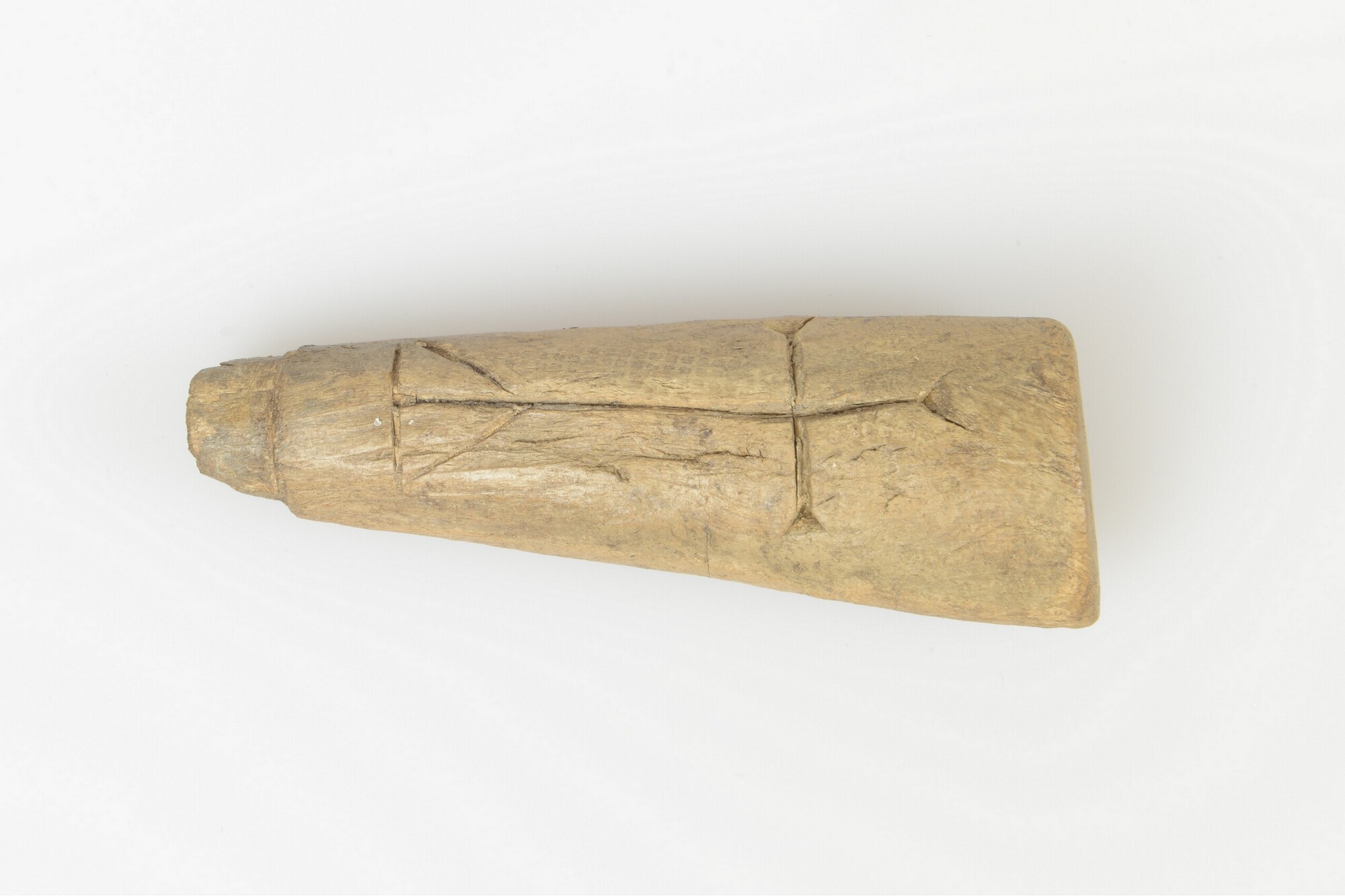 Mesheft; inkeping voor heftbeschermer (ontbreekt); schacht versierd met een gravering in de vorm van een kruis; aan het uiteinde zijn enkele zaagsporen zichtbaar