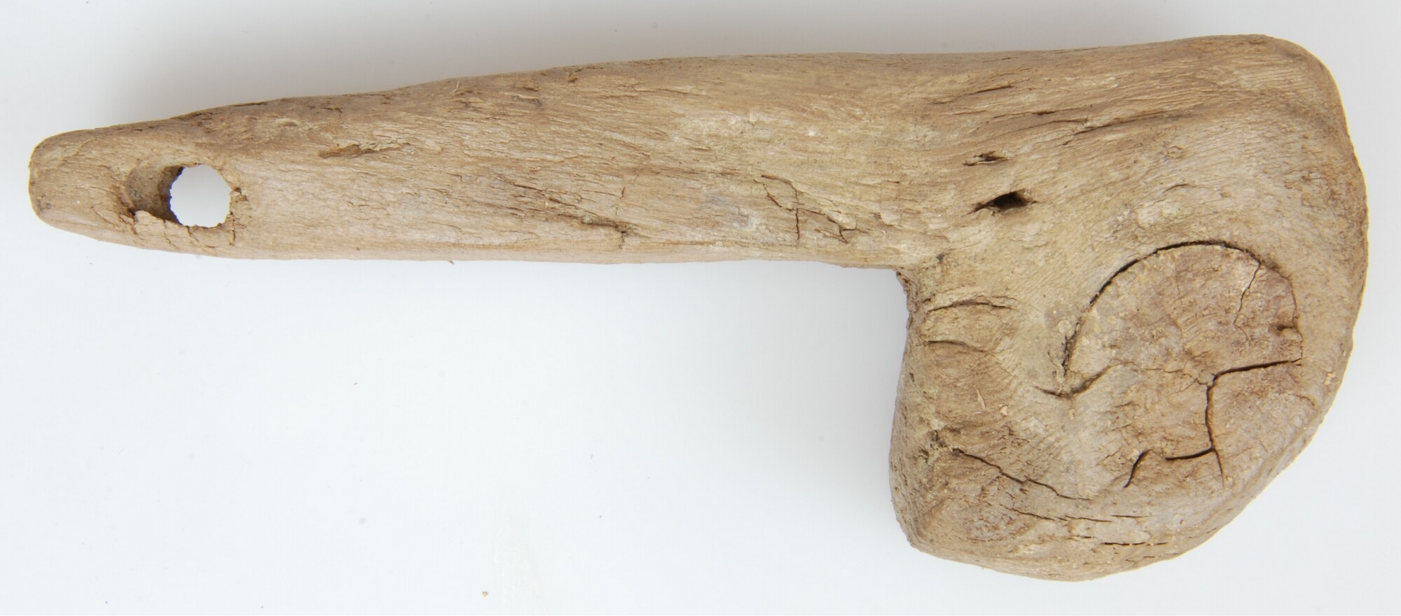 Pin; knoestige kop met daaraan een schacht; het object is gemaakt van een klein onderdeel van een grotere stam; mogelijk gebruikt op een schip als pinslot, een scharnierachtige slotverbinding; doorboring aan het uiteinde van de schacht