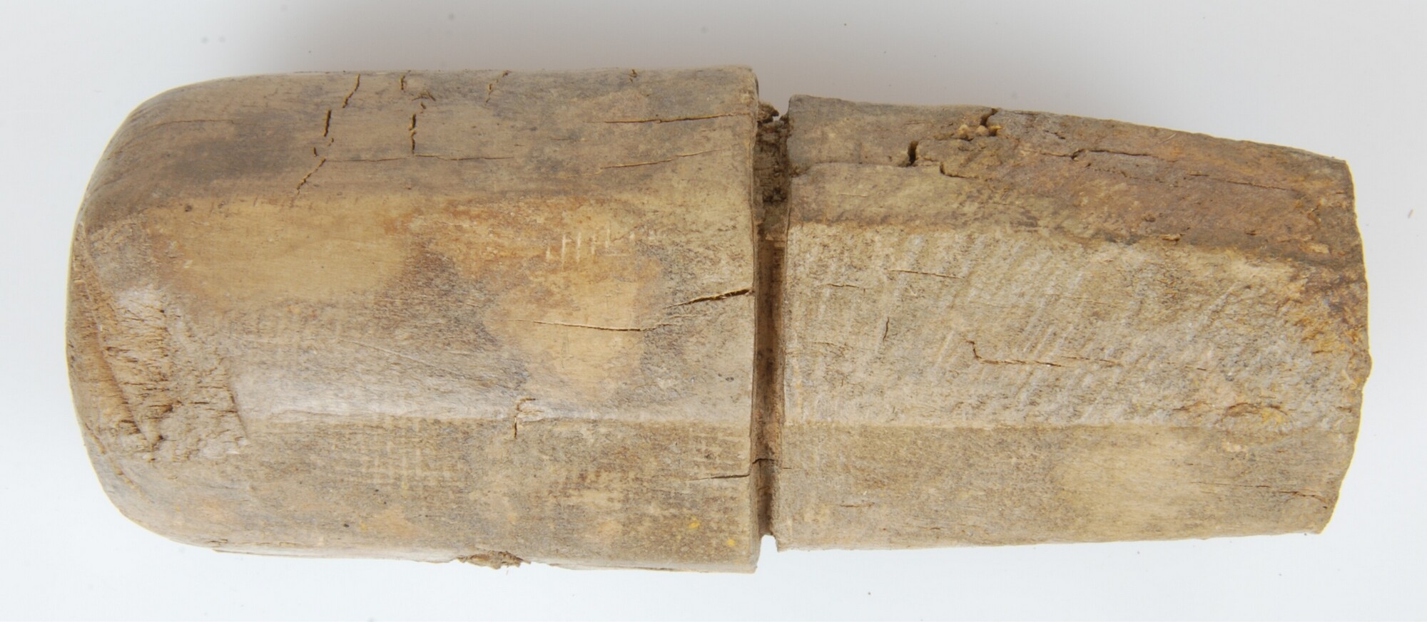 Peillood (?); rond uiteinde en aan de andere kant een achtkantige doorsnede; gemaakt uit een relatief klein stuk van een grotere stam; aan de binnenkant zit een klomp metaal (deels ijzer)