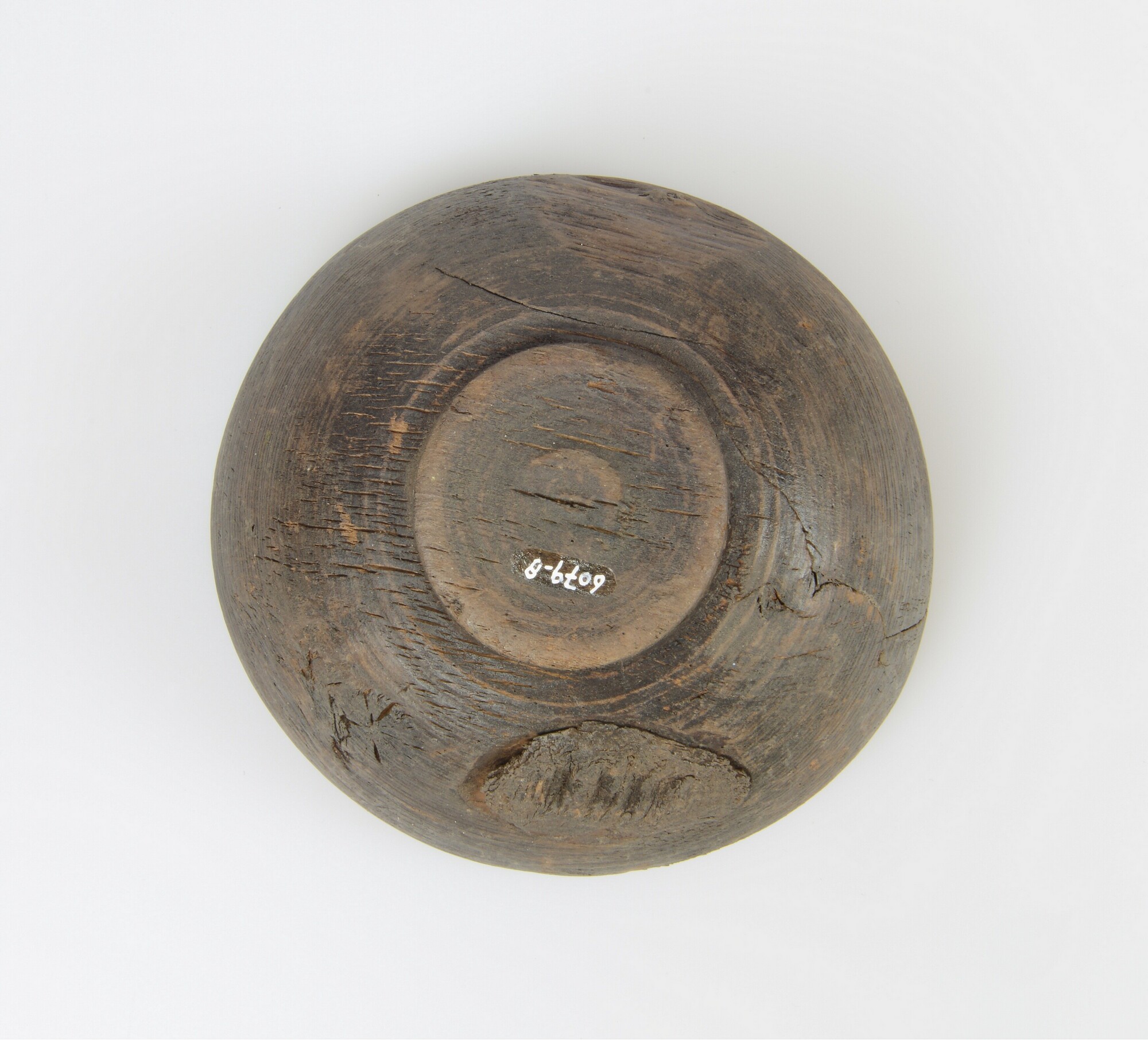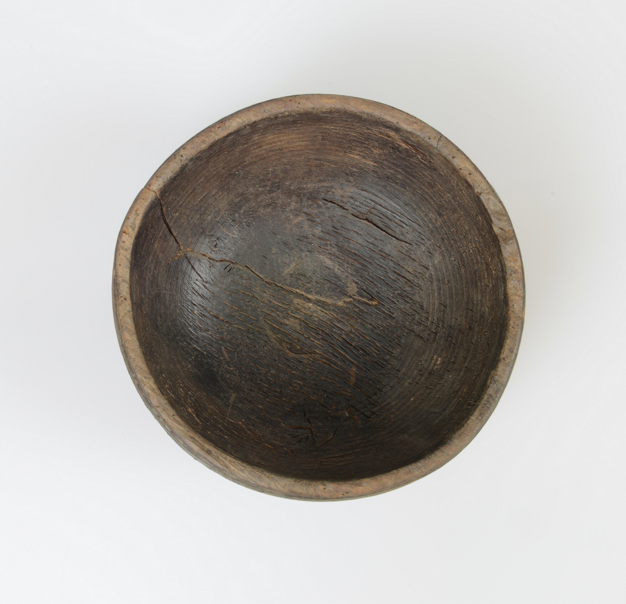 Kom; bolle kom met standvoet; aan de buitenzijde van de kom bevindt zich net onder de rand één horizontale groeve en de rand staat afgeschuind naar binnen; het object is niet echt gesleten, maar vertoond wel sporen van gebruik en op de wand is een schroeiplek zichtbaar; vondstgegevens: vak 7