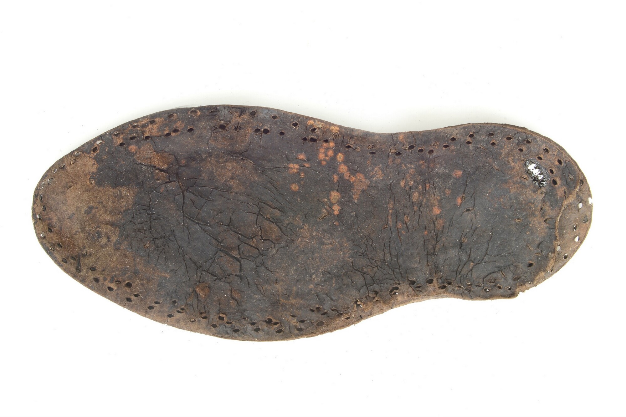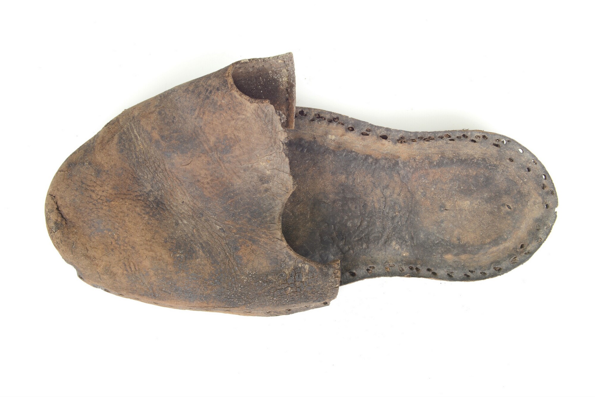 Muil; Goubitz type 105; zool opgebouwd uit drie lagen leer; schoenbovenleer uit één stuk; niet zeker of de zool en het bovenleer bij elkaar horen!